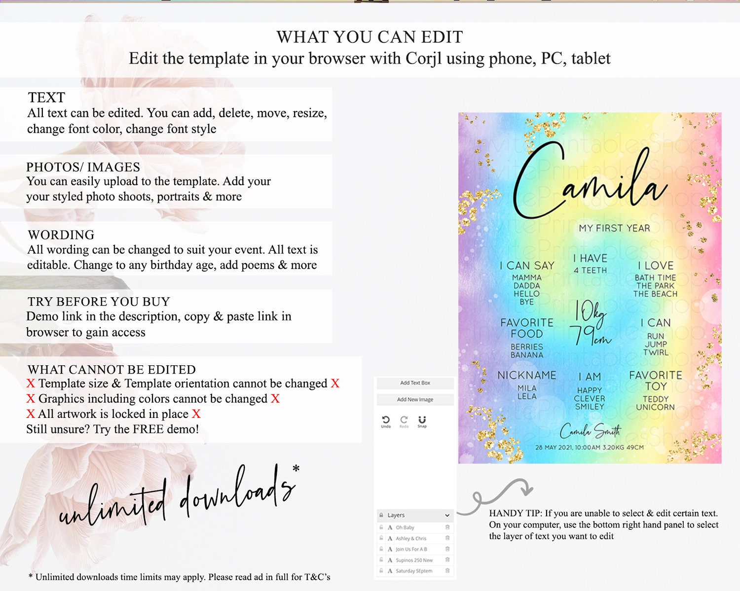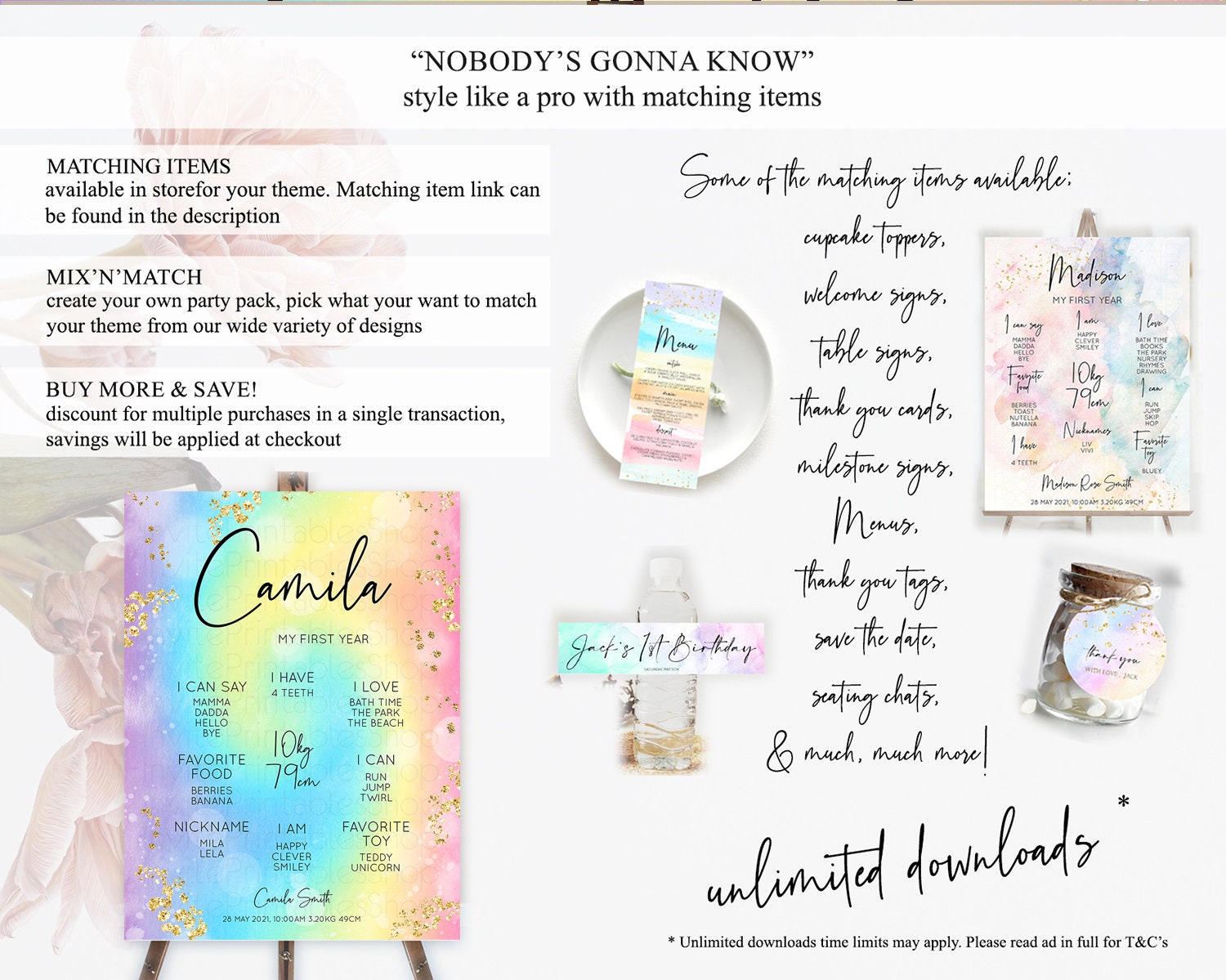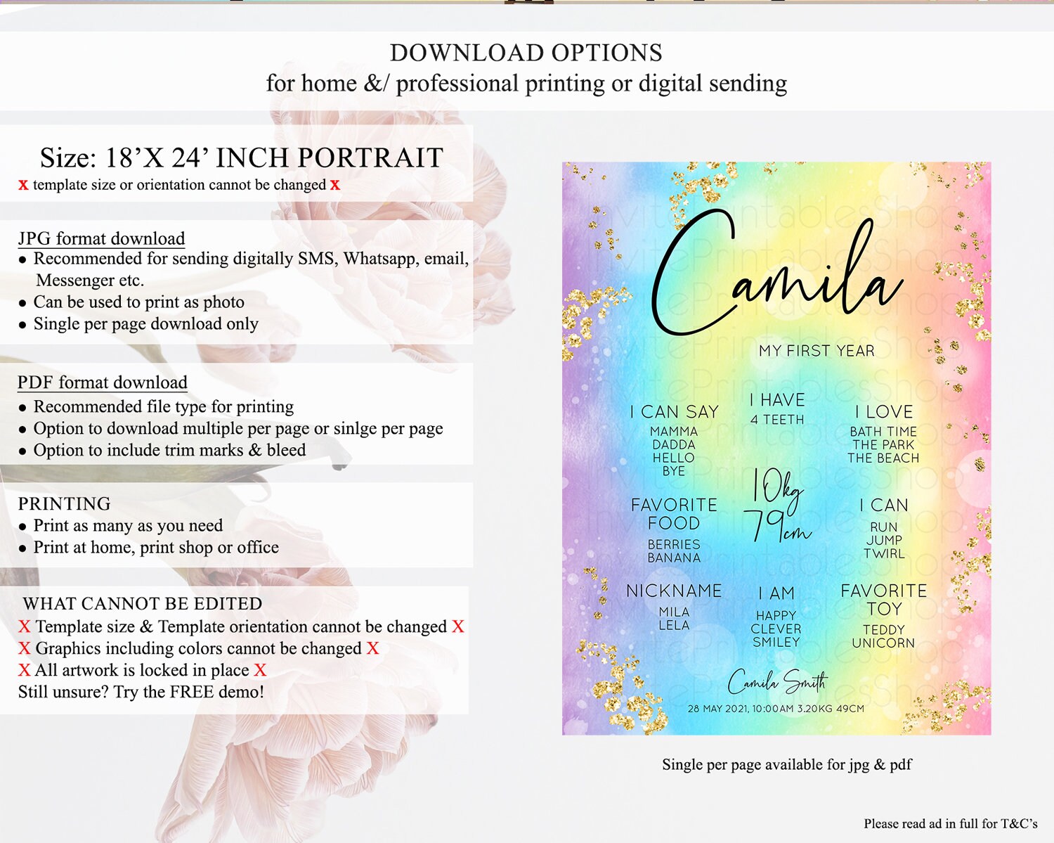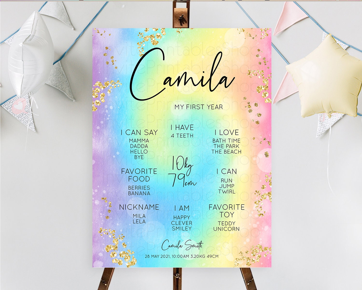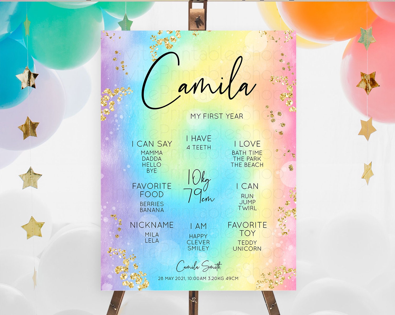 Pastel First Birthday Milestone Board Pastel Rainbow Milestone Poster Colorful Confetti Watercolor Glitter 1st Birthday Welcome Sign D10568