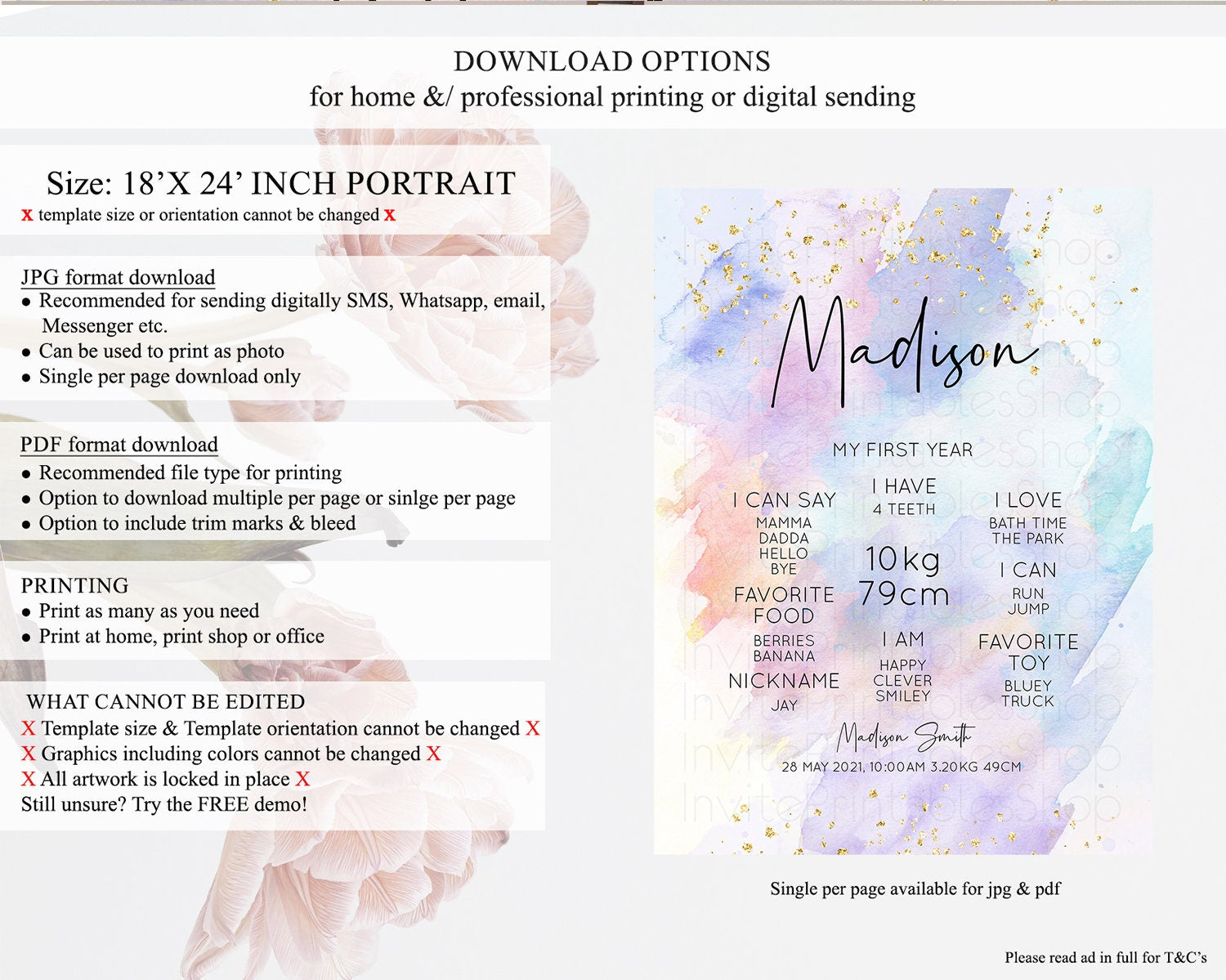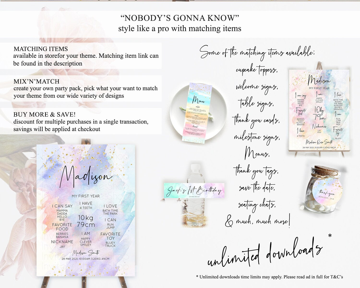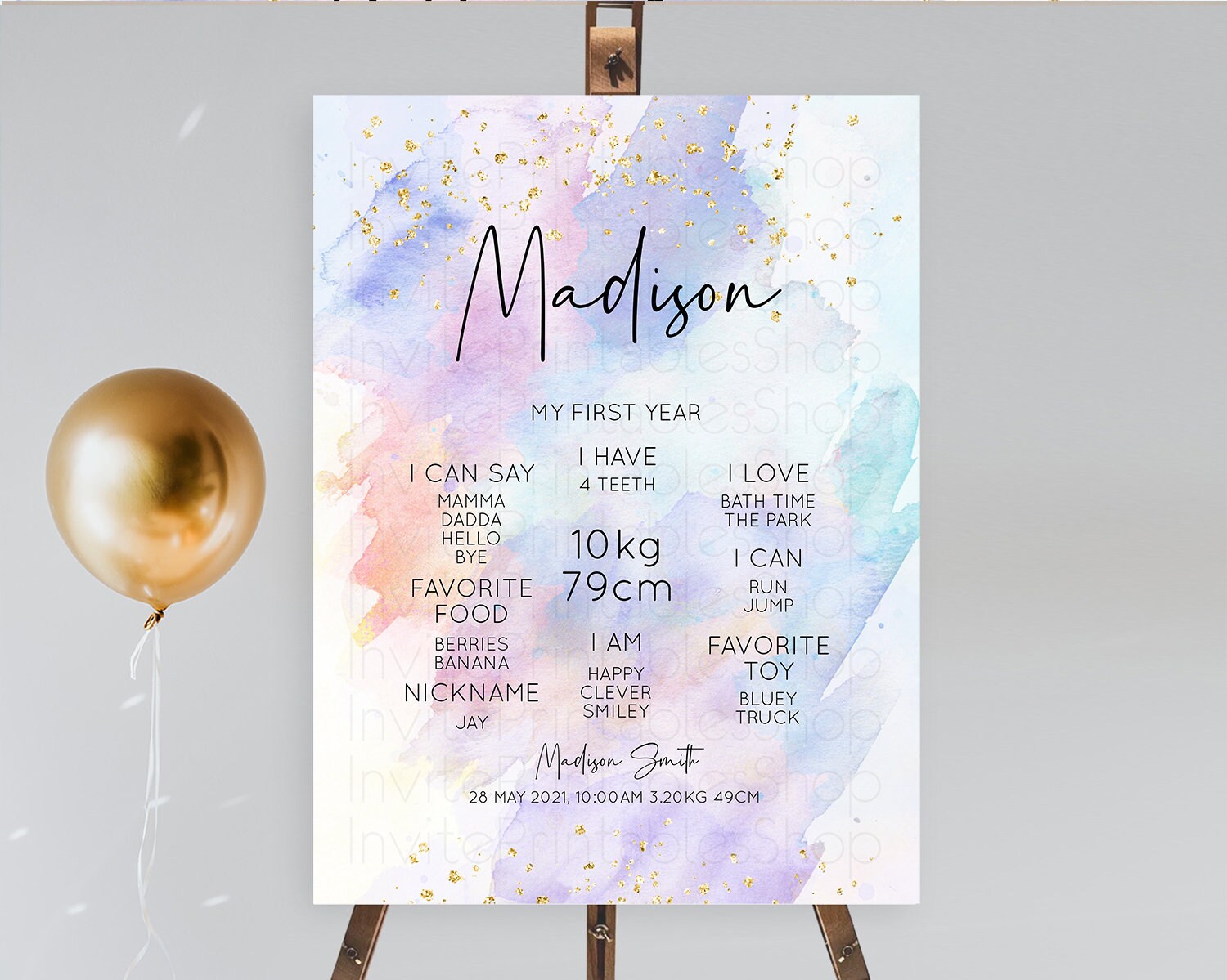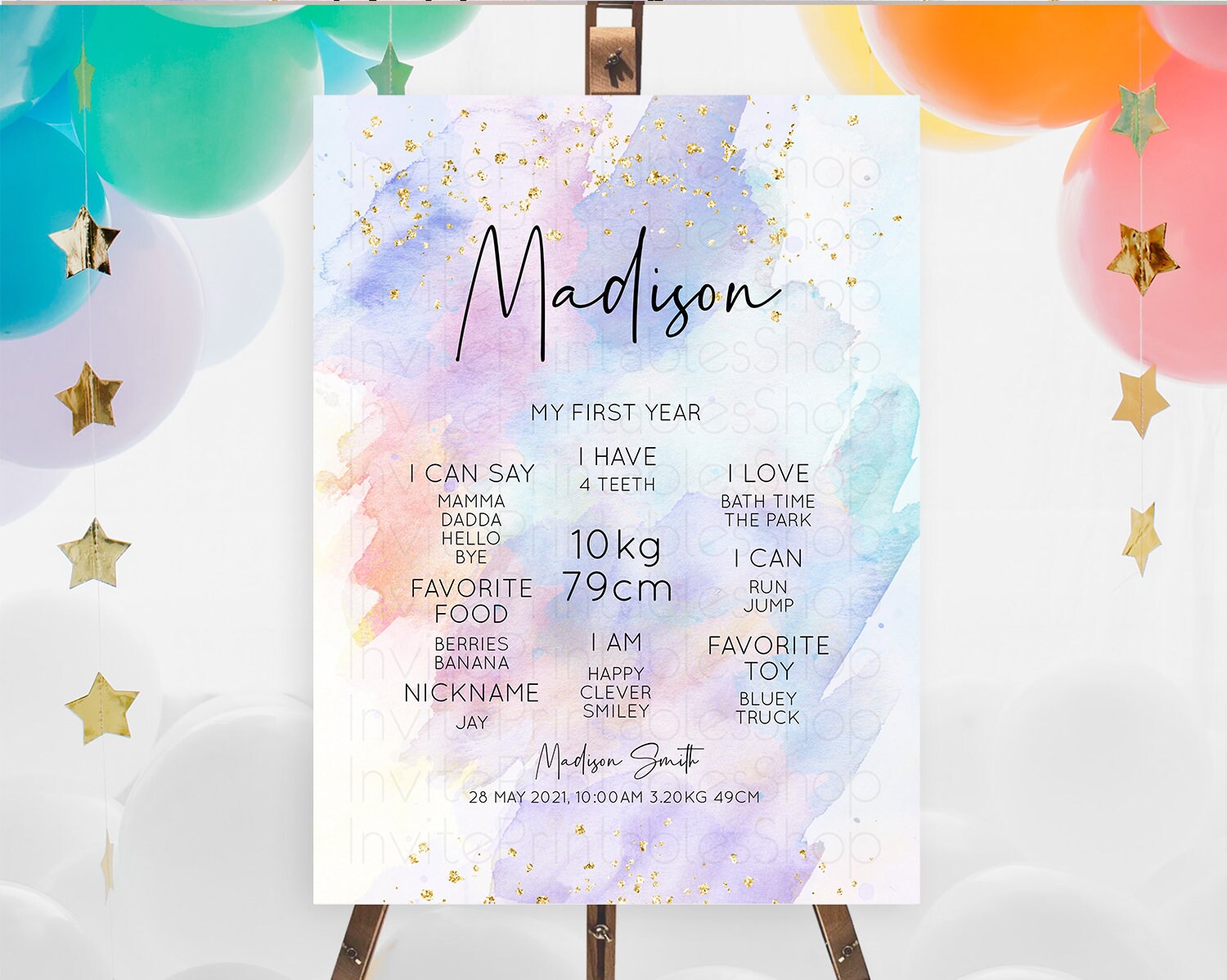 Pastel First Birthday Milestone Board Pastel Rainbow Milestone Poster Colorful Confetti Watercolor Glitter 1st Birthday Welcome Sign D10585