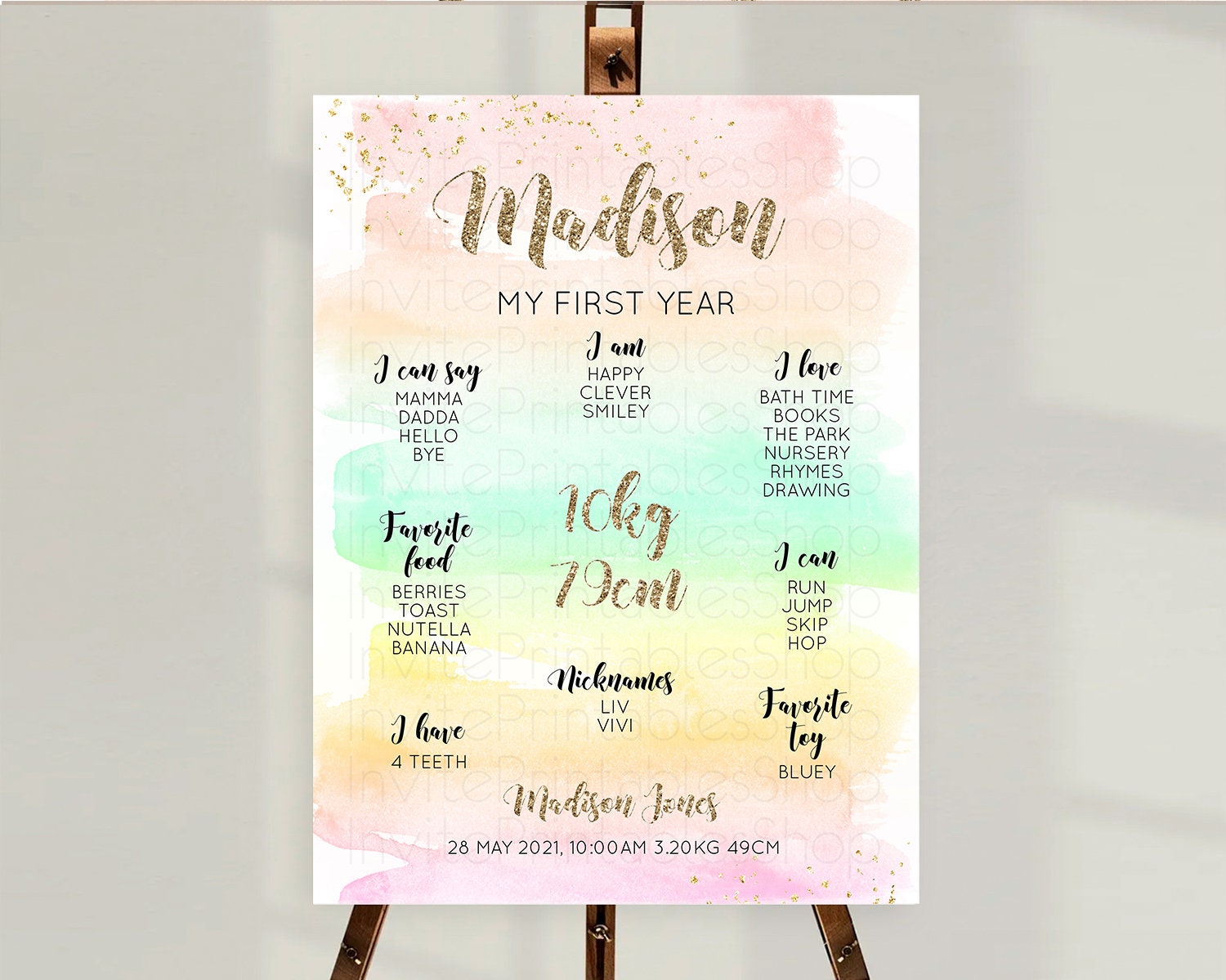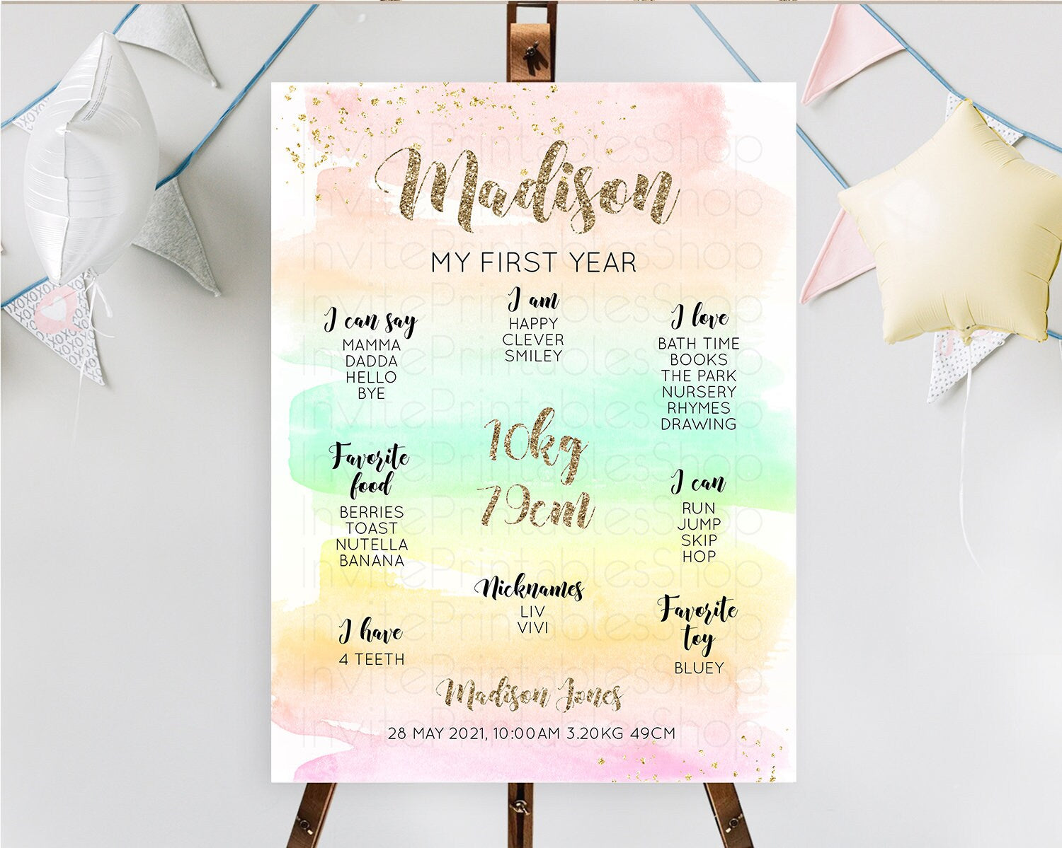 Pastel First Birthday Milestone Board Pastel Rainbow Milestone Poster Colorful Confetti Watercolor Glitter 1st Birthday Welcome Sign D10592
