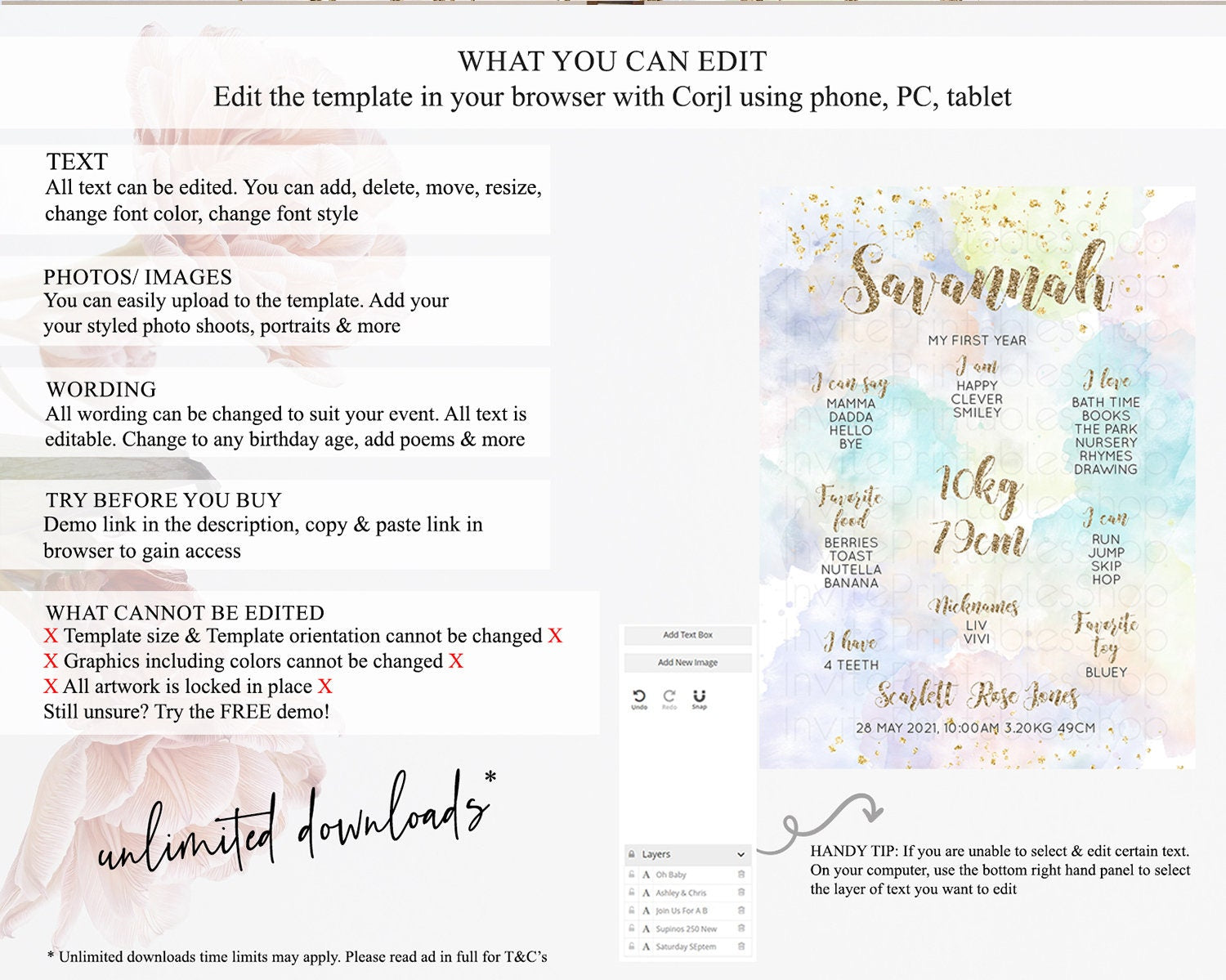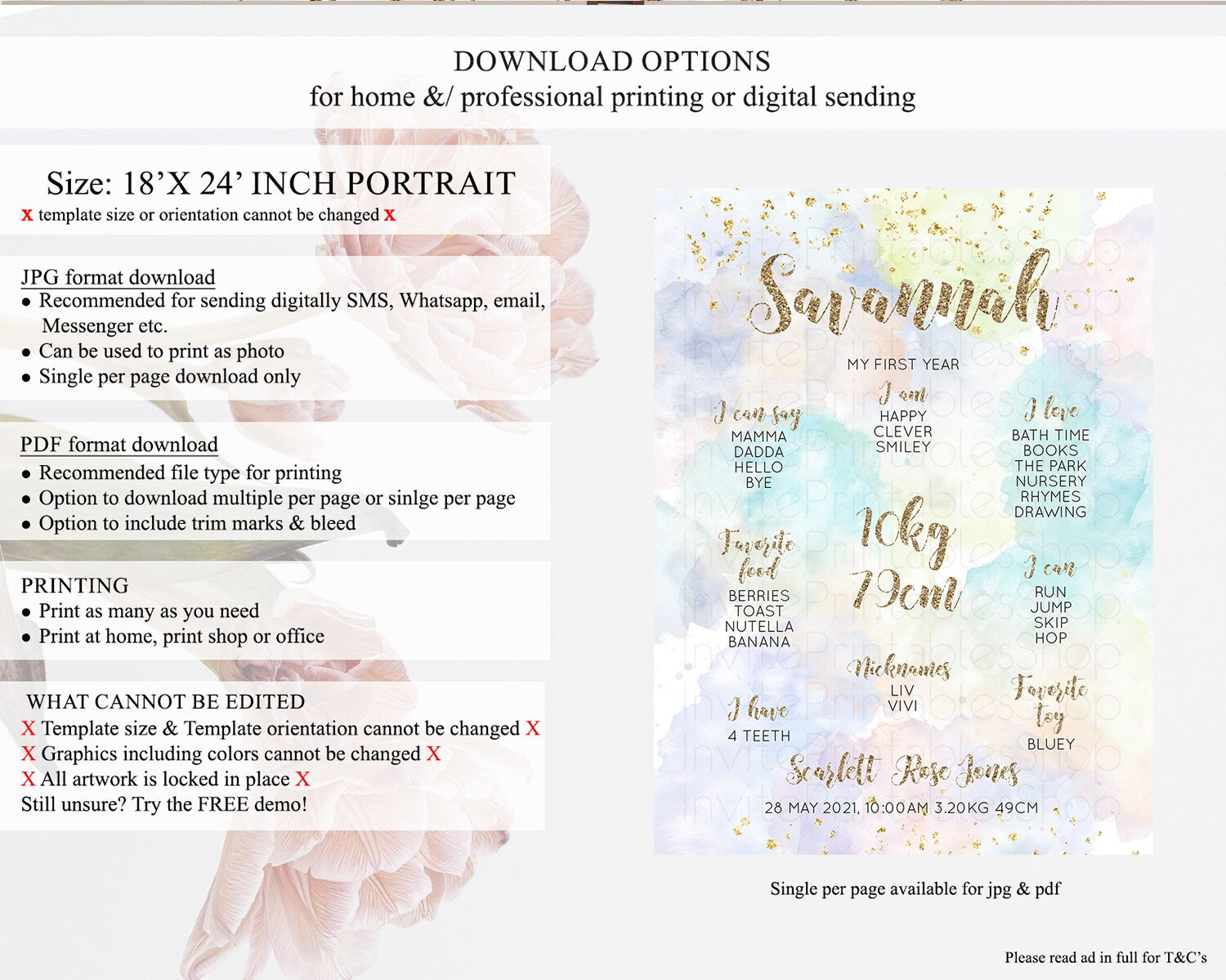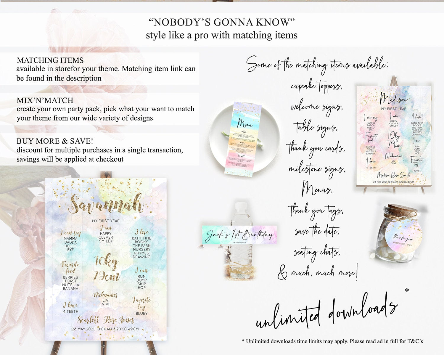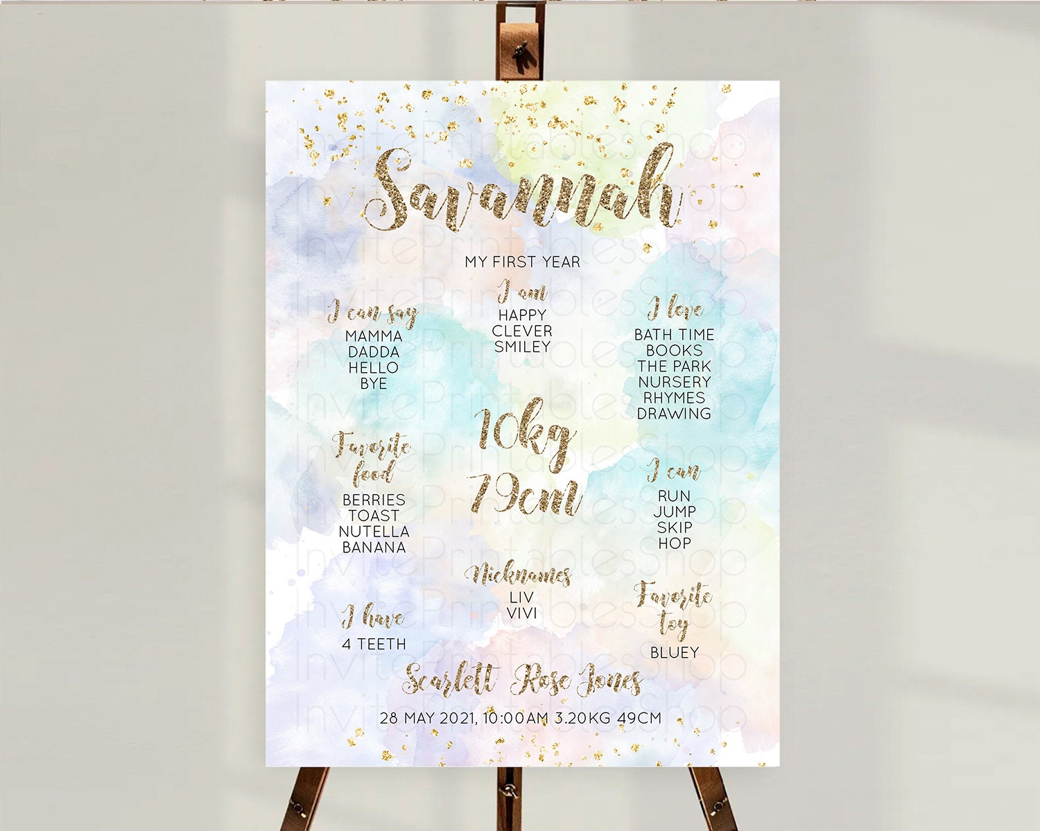 Pastel First Birthday Milestone Board Pastel Rainbow Milestone Poster Colorful Confetti Watercolor Glitter 1st Birthday Welcome Sign D10614