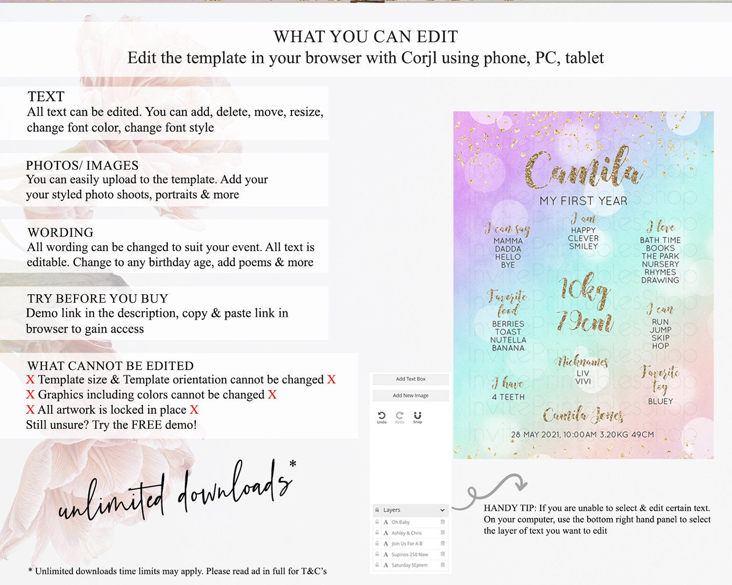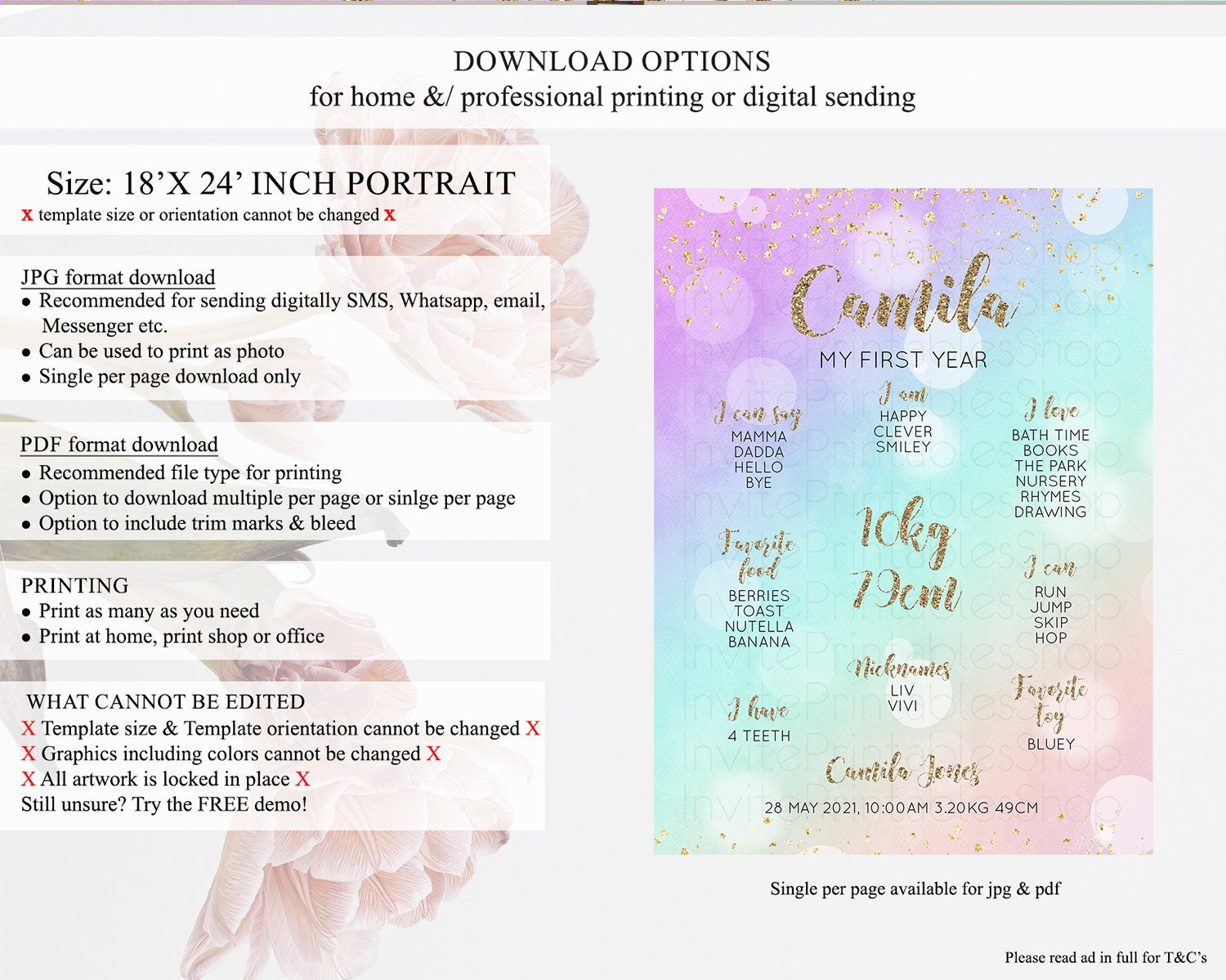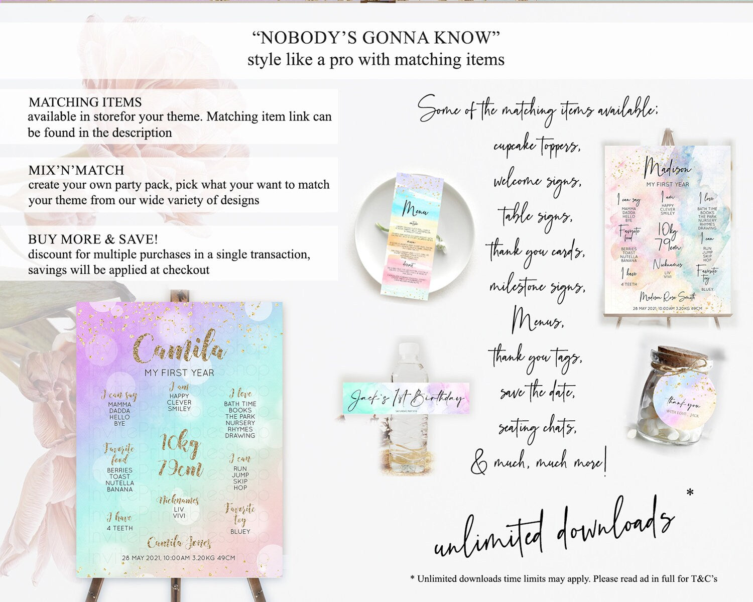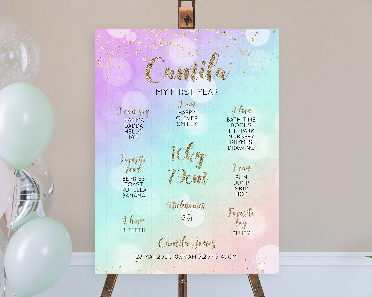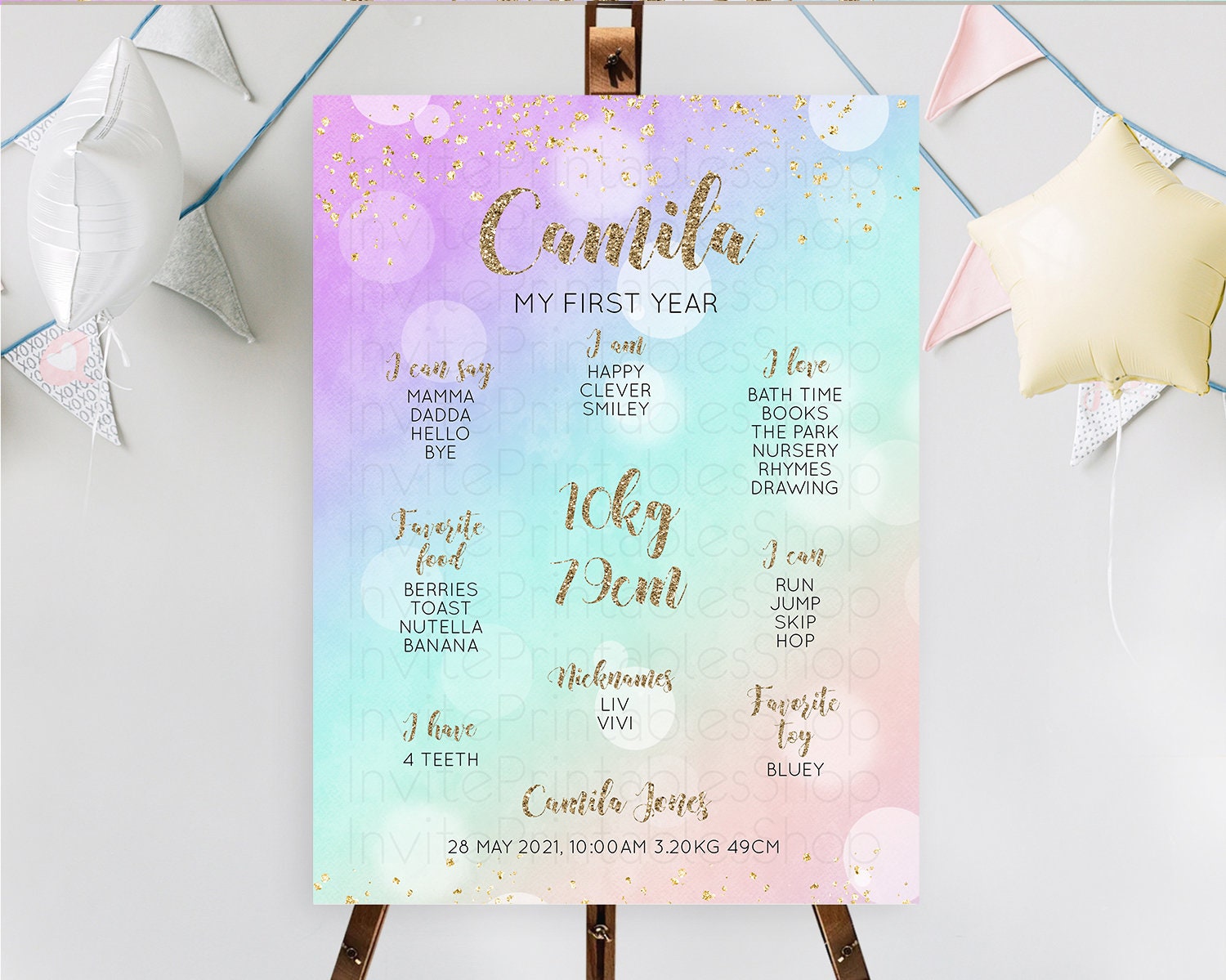 Pastel First Birthday Milestone Board Pastel Rainbow Milestone Poster Colorful Confetti Watercolor Glitter 1st Birthday Welcome Sign D10621