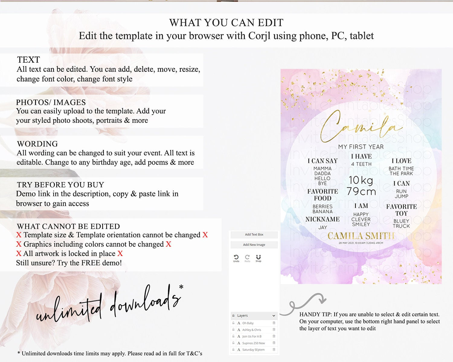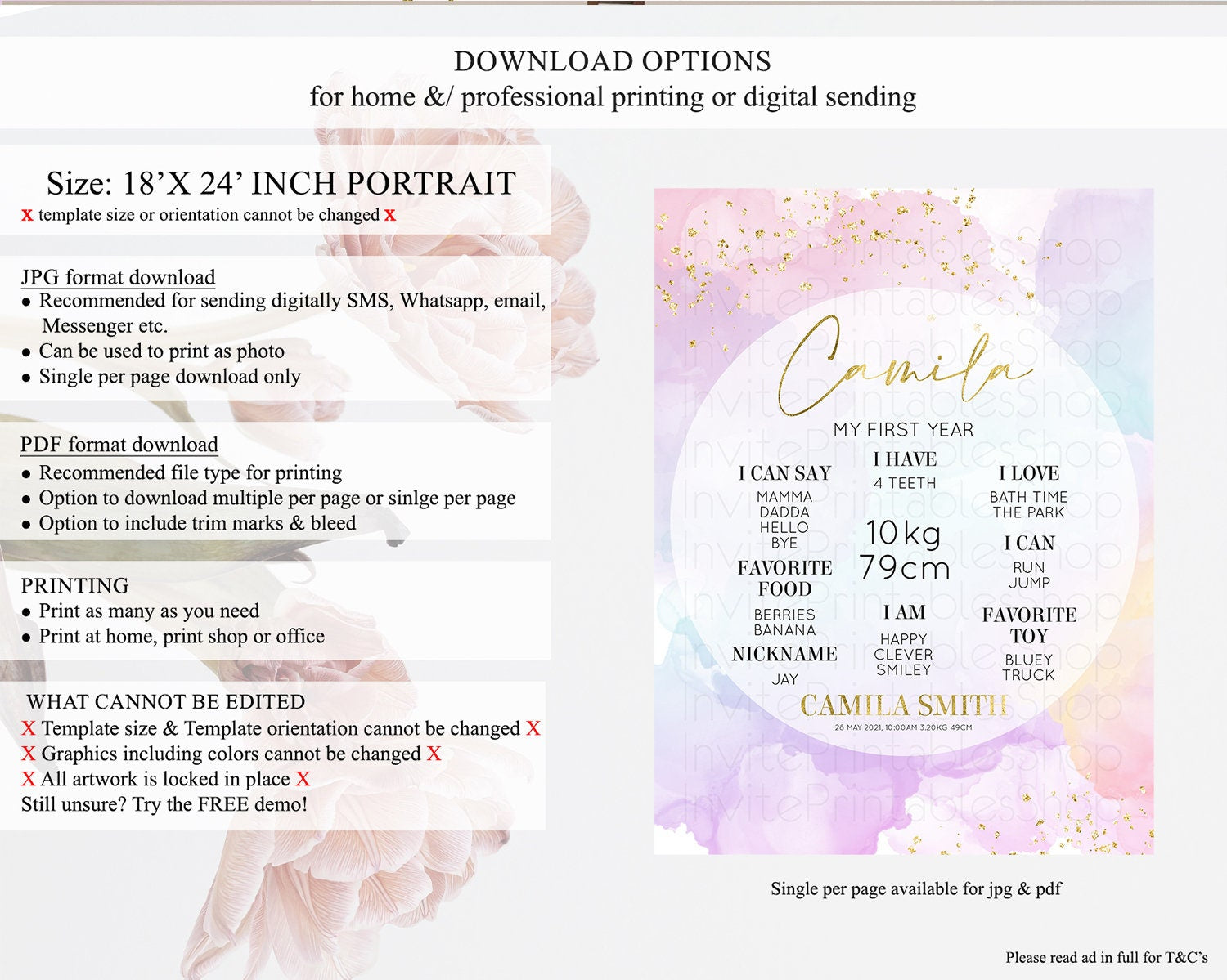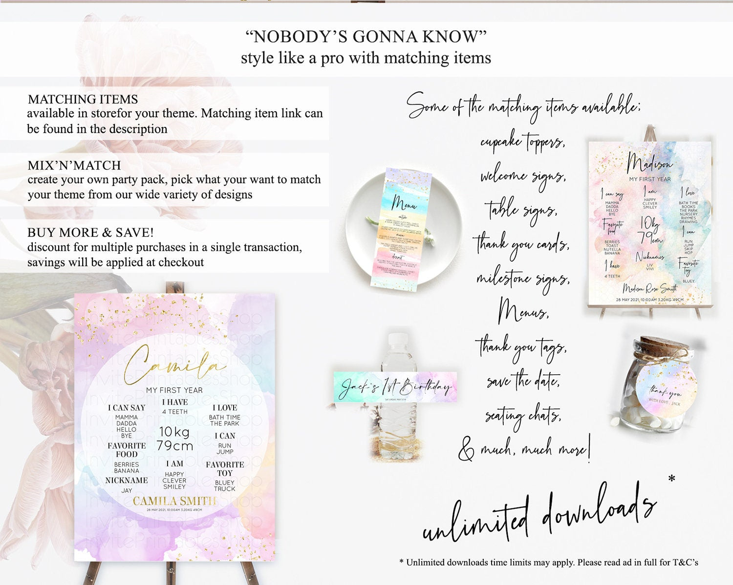 Pastel First Birthday Milestone Board Pastel Rainbow Milestone Poster Colorful Confetti Watercolor Glitter 1st Birthday Welcome Sign D10623