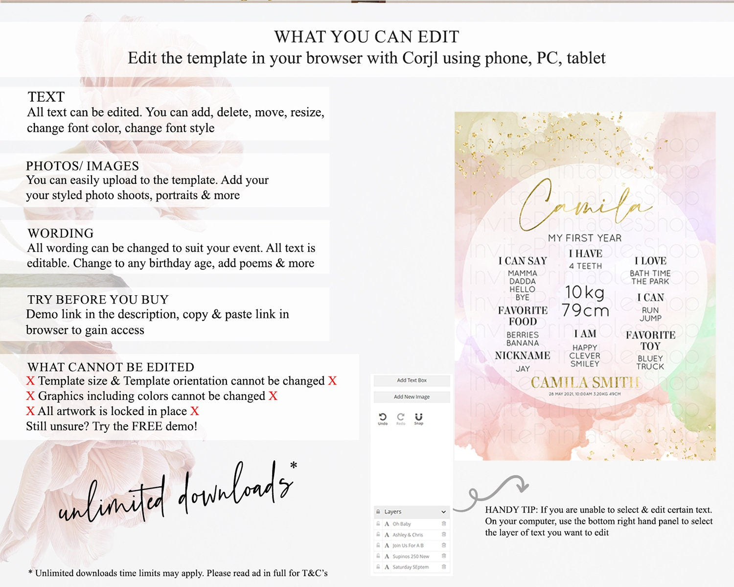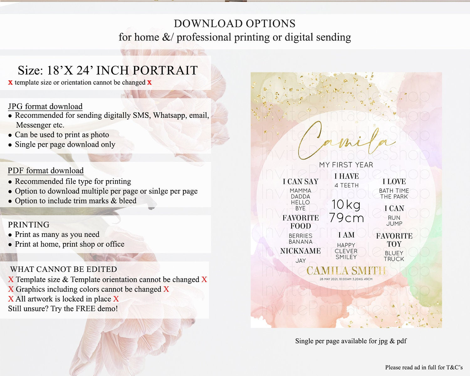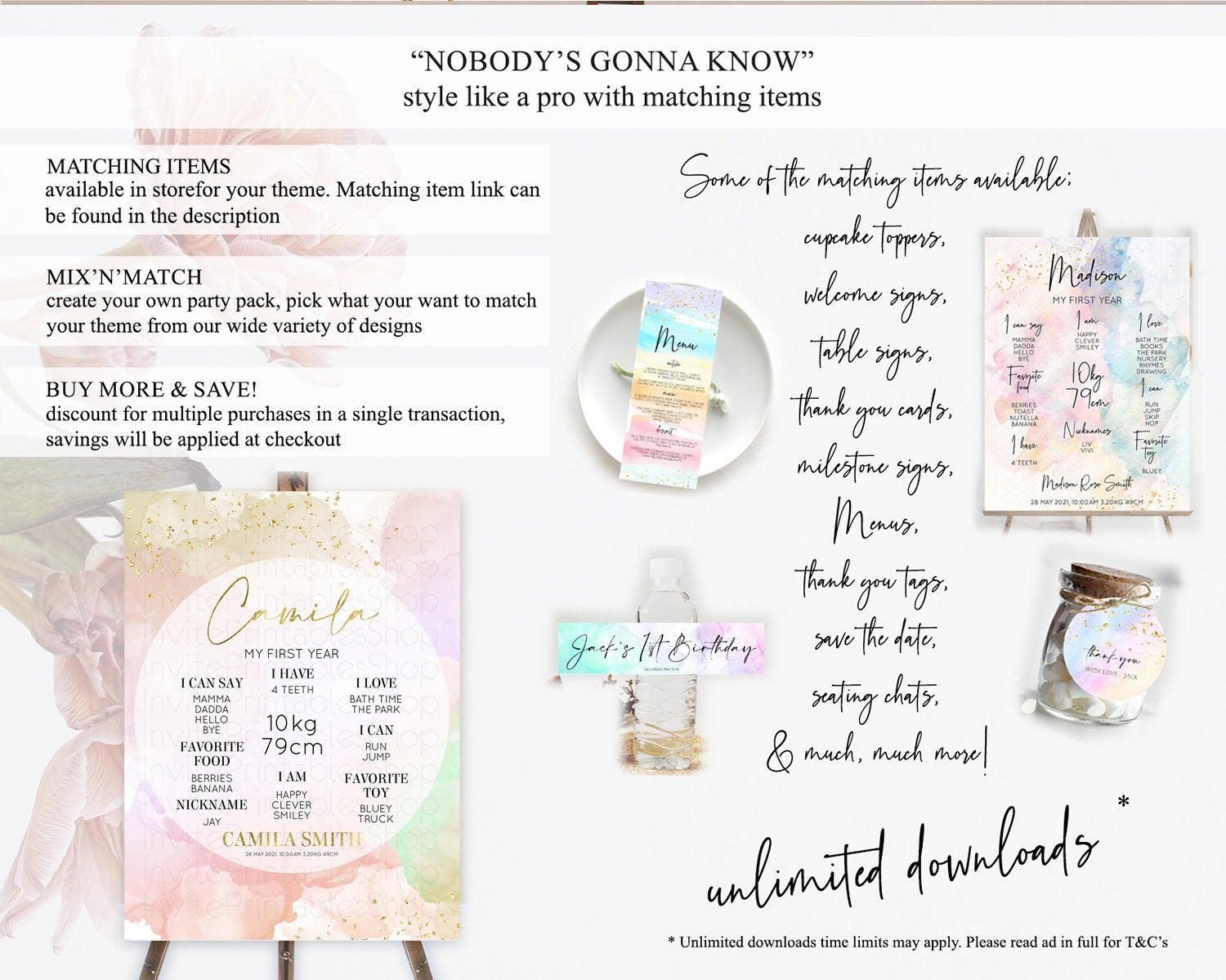 Pastel First Birthday Milestone Board Pastel Rainbow Milestone Poster Colorful Confetti Watercolor Glitter 1st Birthday Welcome Sign D10627