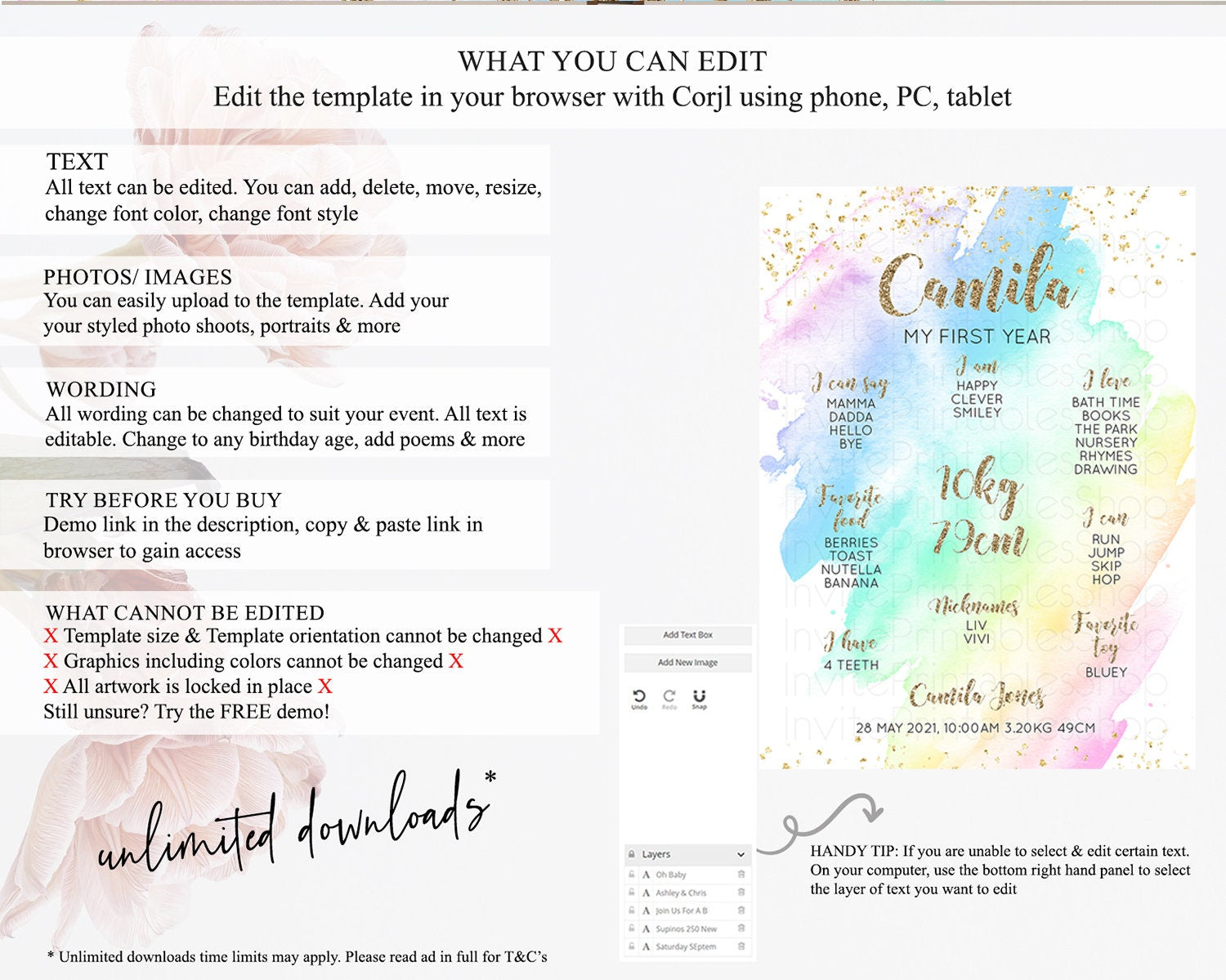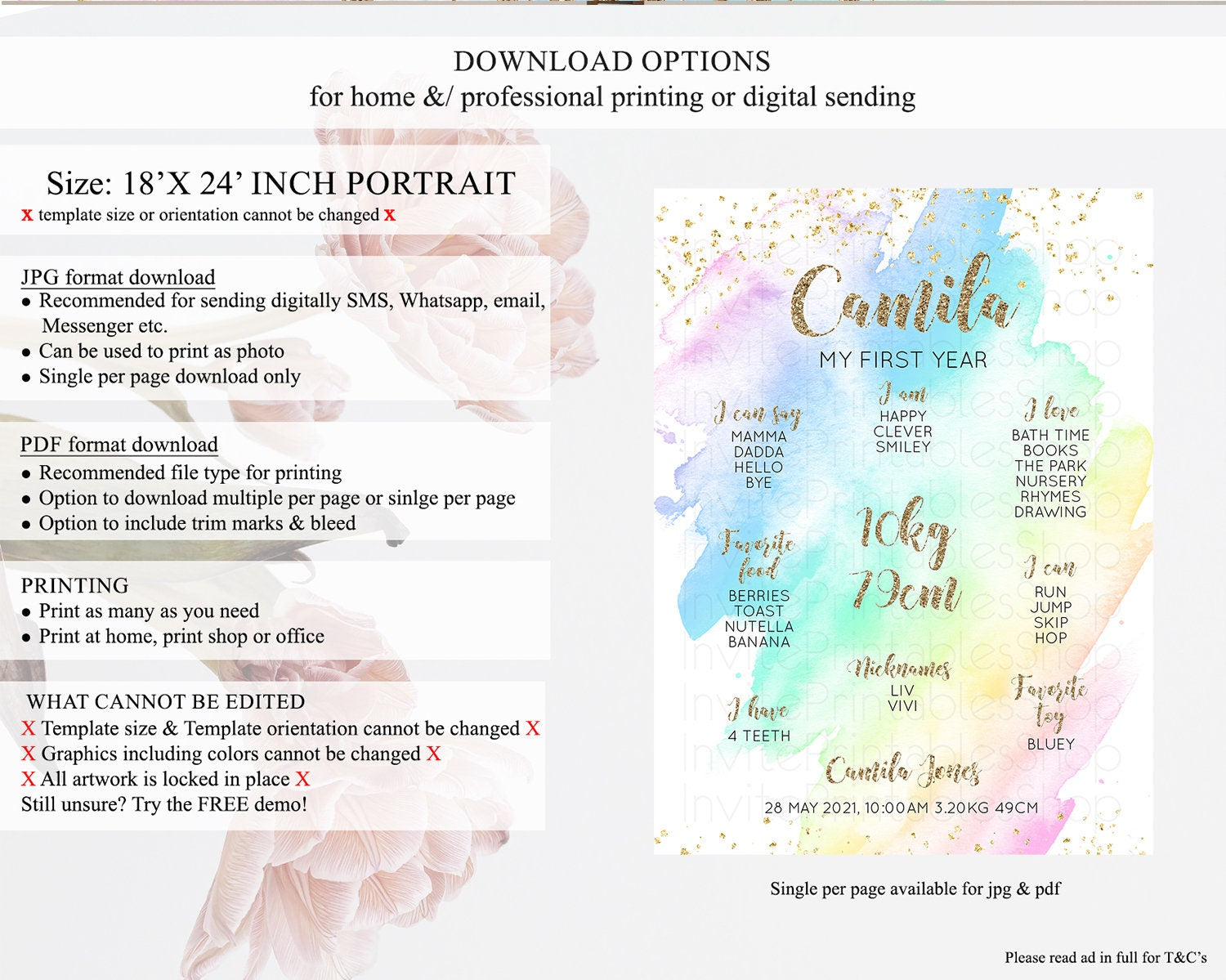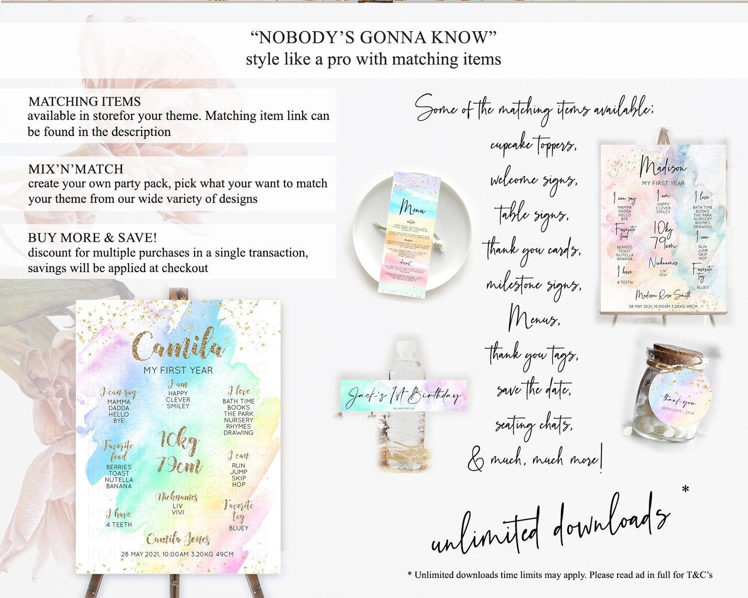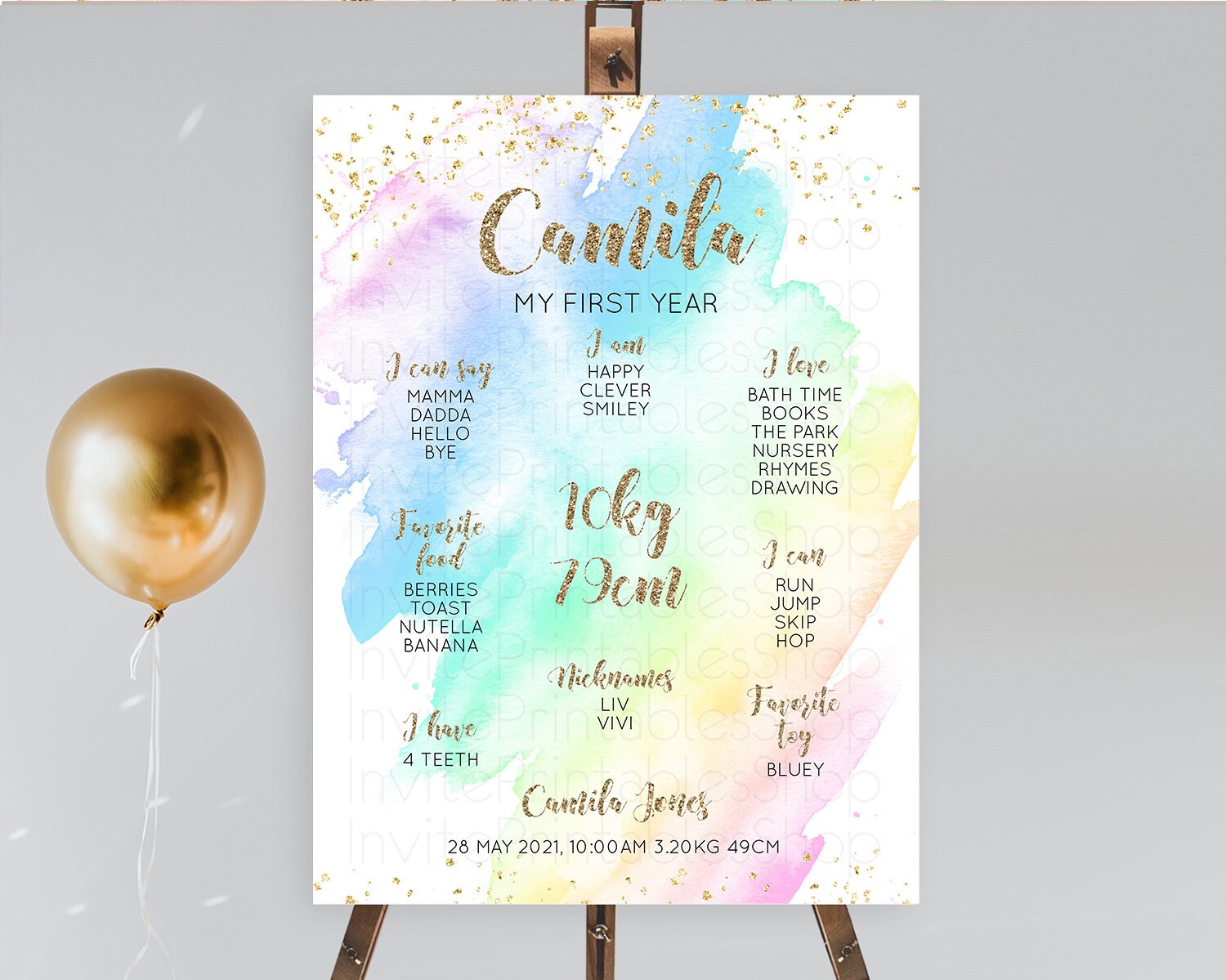 Pastel First Birthday Milestone Board Pastel Rainbow Milestone Poster Colorful Confetti Watercolor Glitter 1st Birthday Welcome Sign D10637
