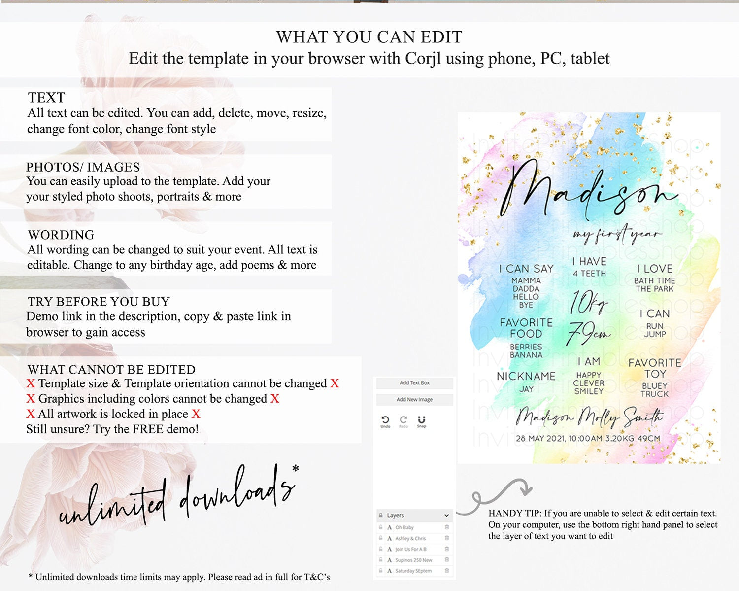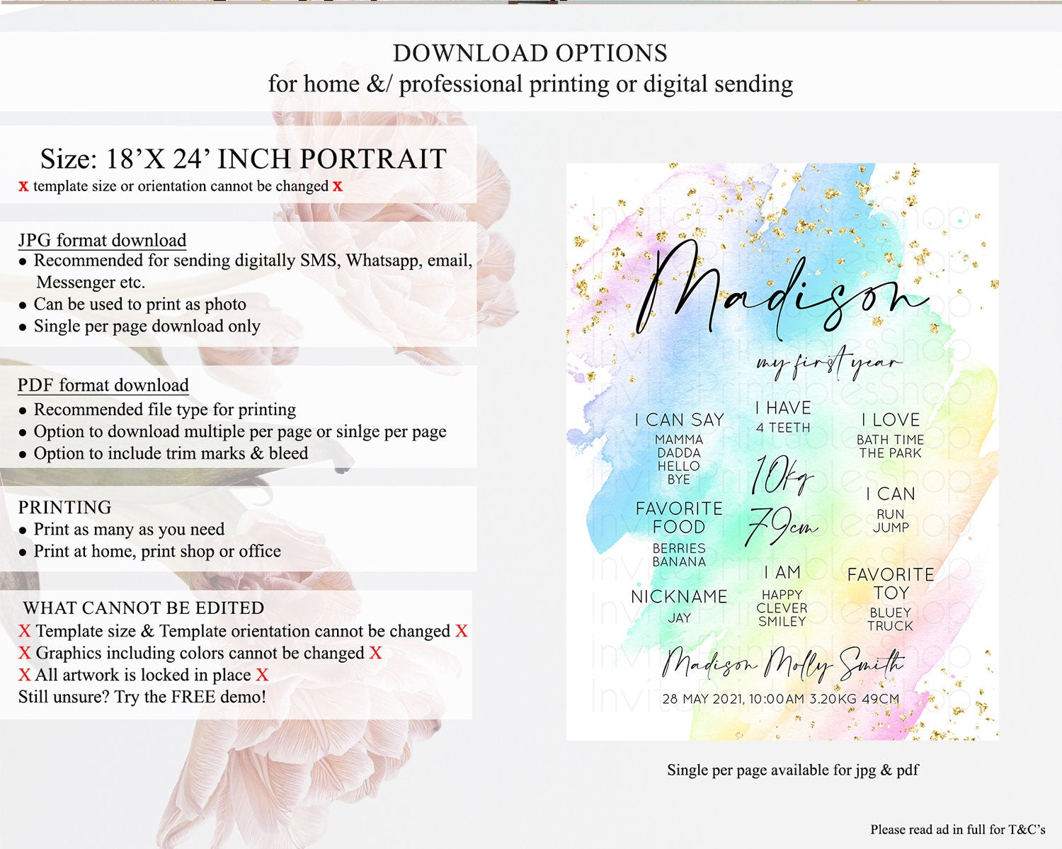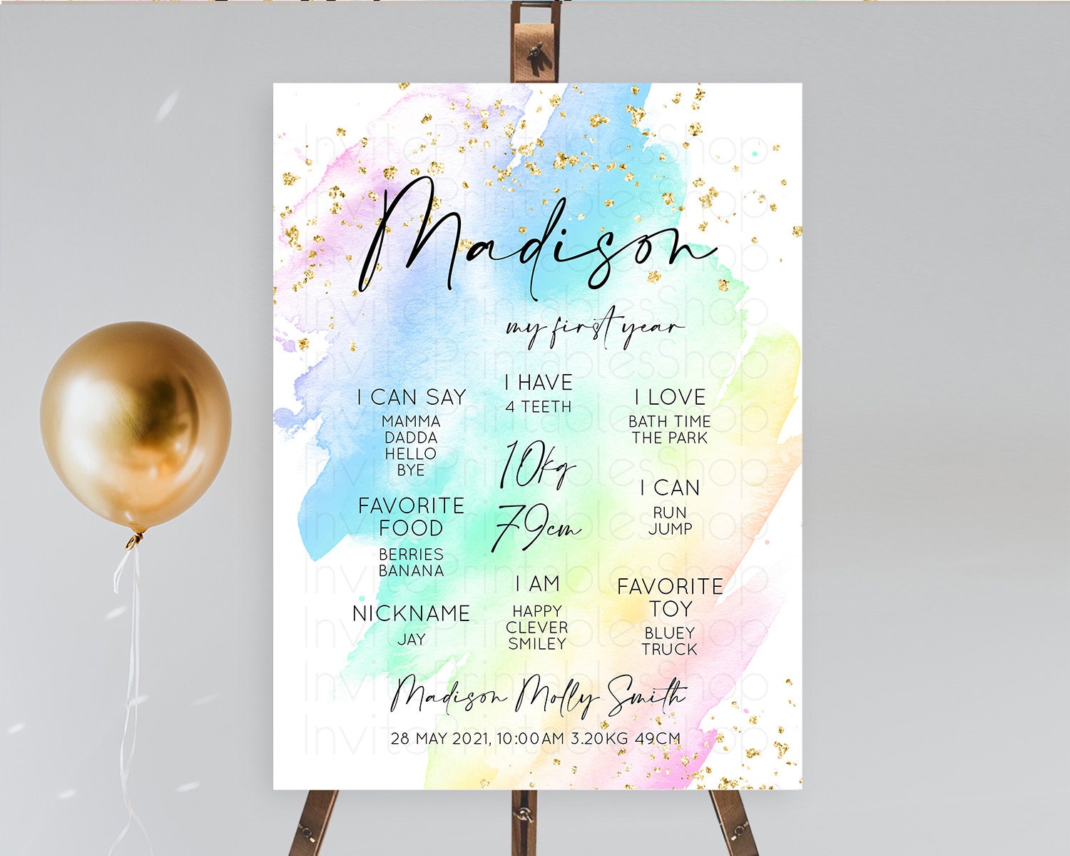 Pastel First Birthday Milestone Board Pastel Rainbow Milestone Poster Colorful Confetti Watercolor Glitter 1st Birthday Welcome Sign D10640