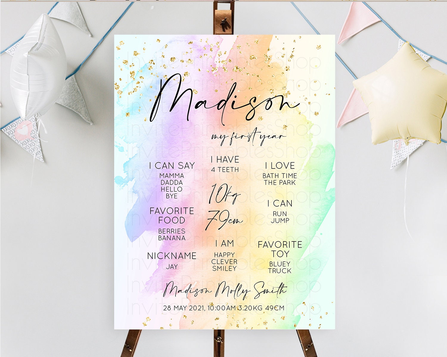 Pastel First Birthday Milestone Board Pastel Rainbow Milestone Poster Colorful Confetti Watercolor Glitter 1st Birthday Welcome Sign D10645