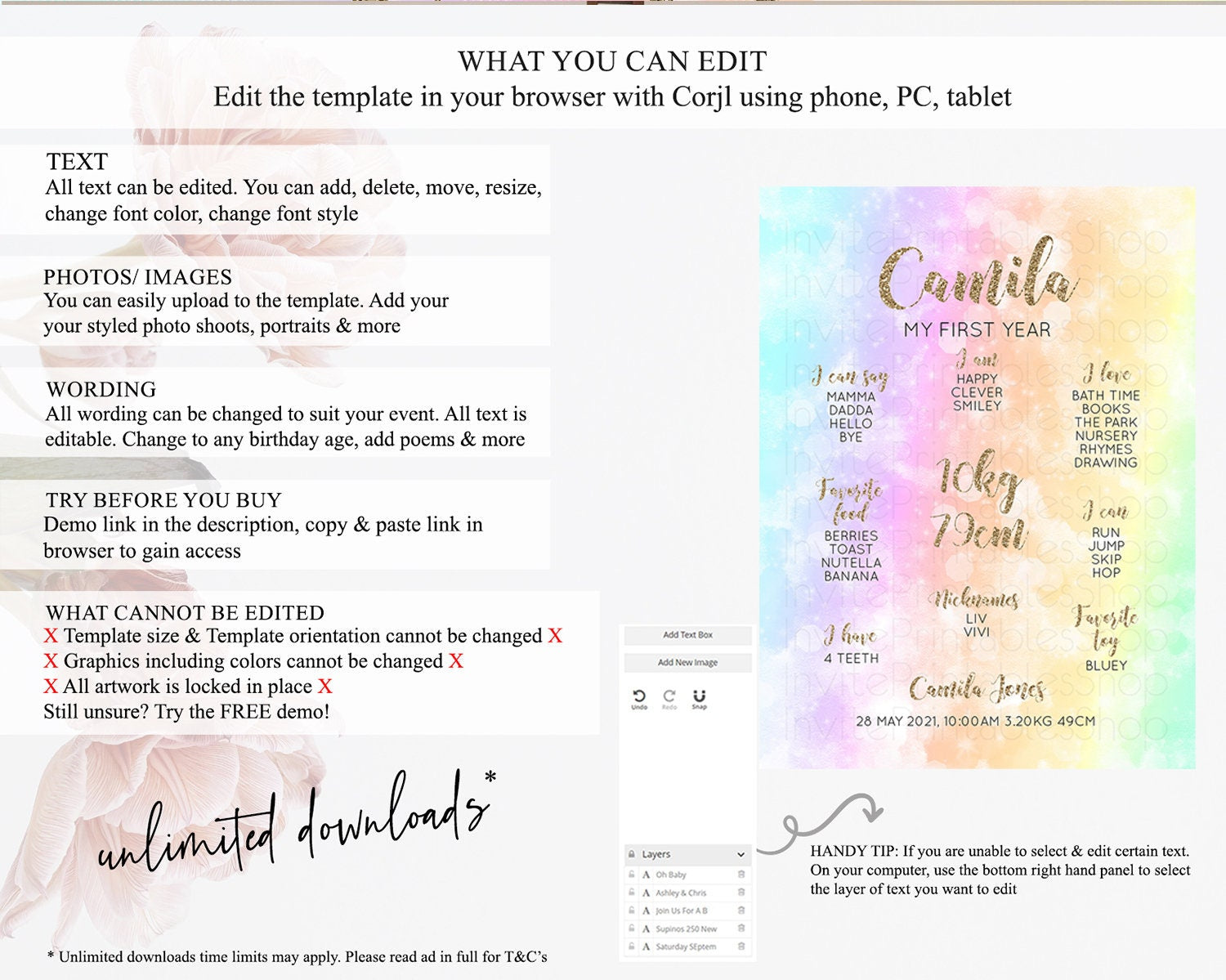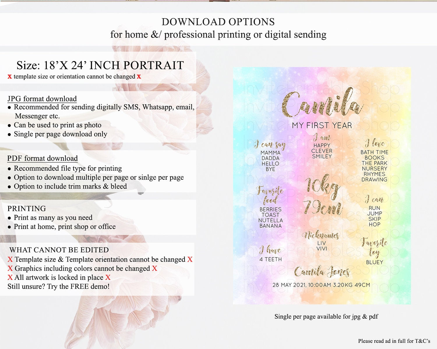 Pastel First Birthday Milestone Board Pastel Rainbow Milestone Poster Colorful Confetti Watercolor Glitter 1st Birthday Welcome Sign D10648