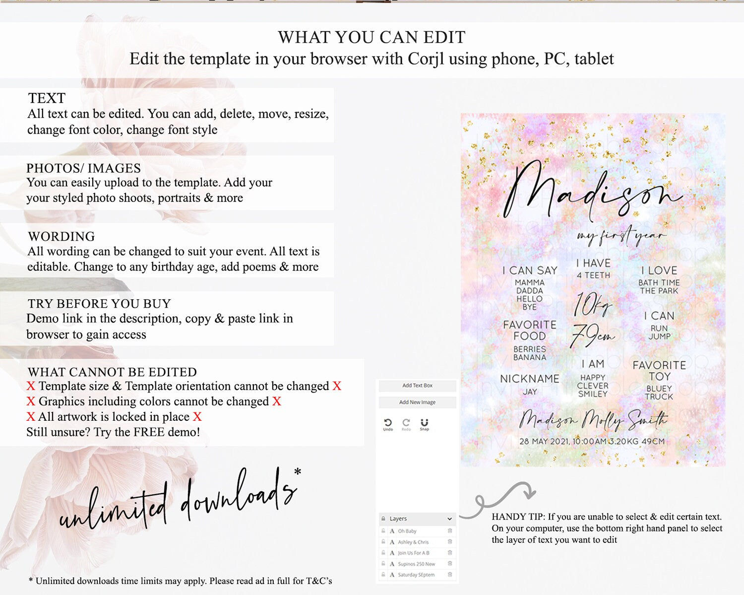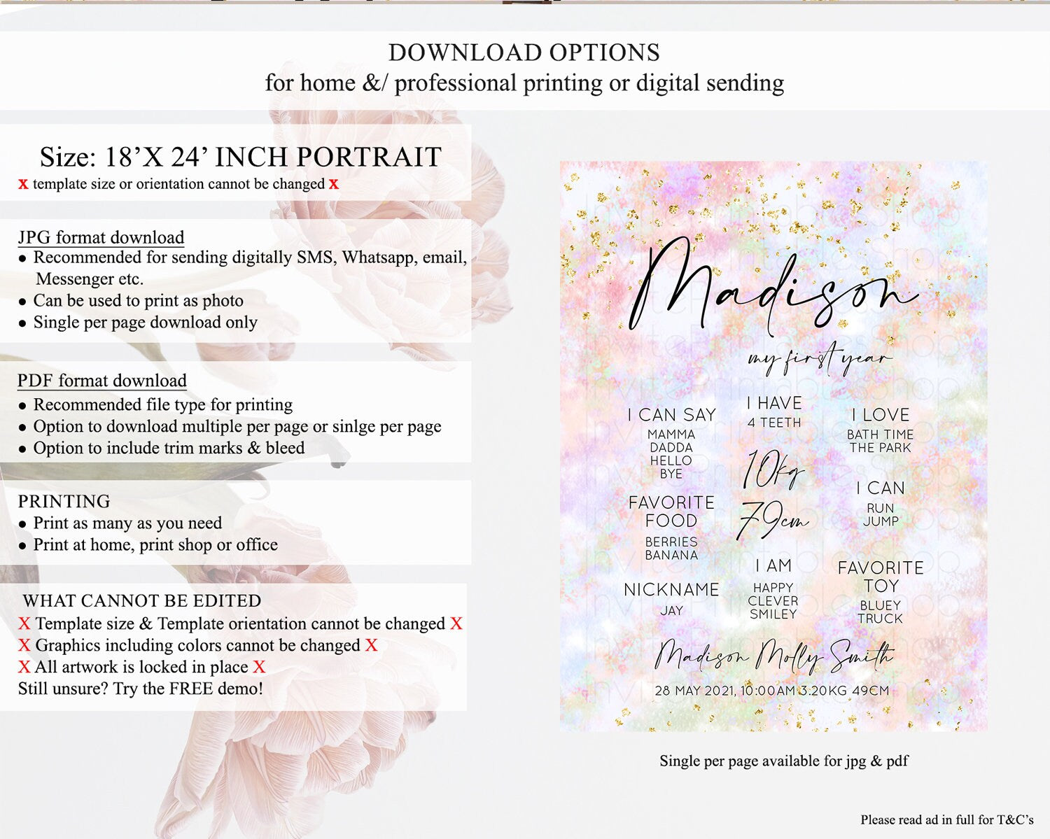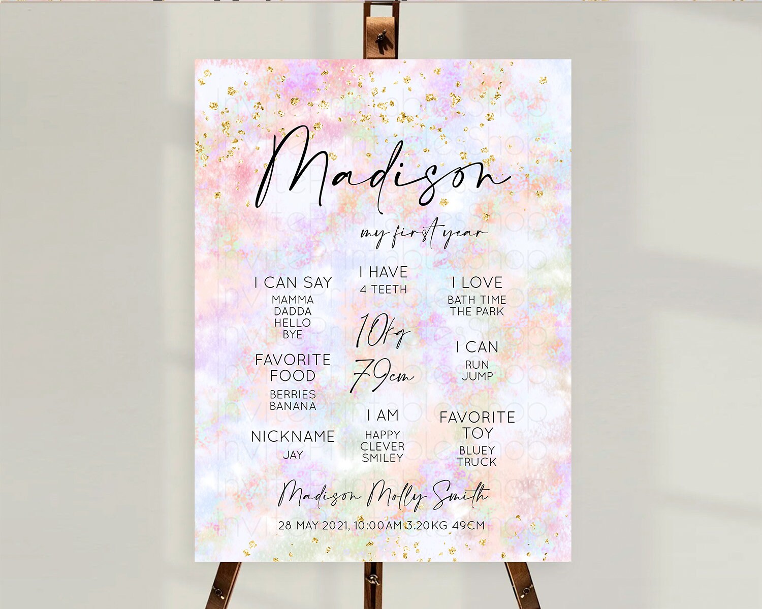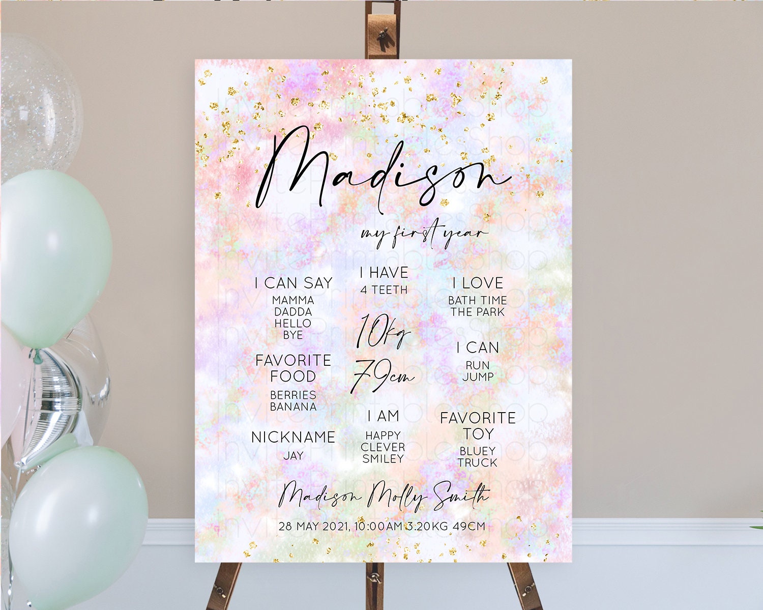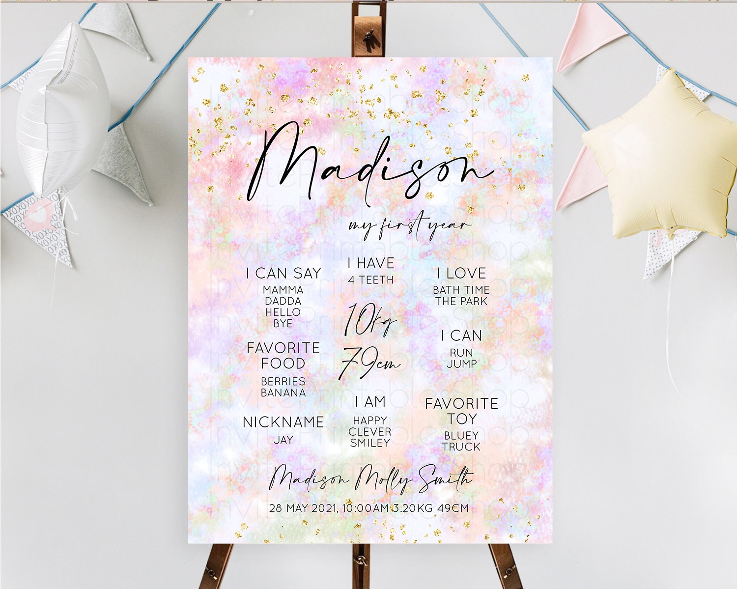 Pastel First Birthday Milestone Board Pastel Rainbow Milestone Poster Colorful Confetti Watercolor Glitter 1st Birthday Welcome Sign D10649
