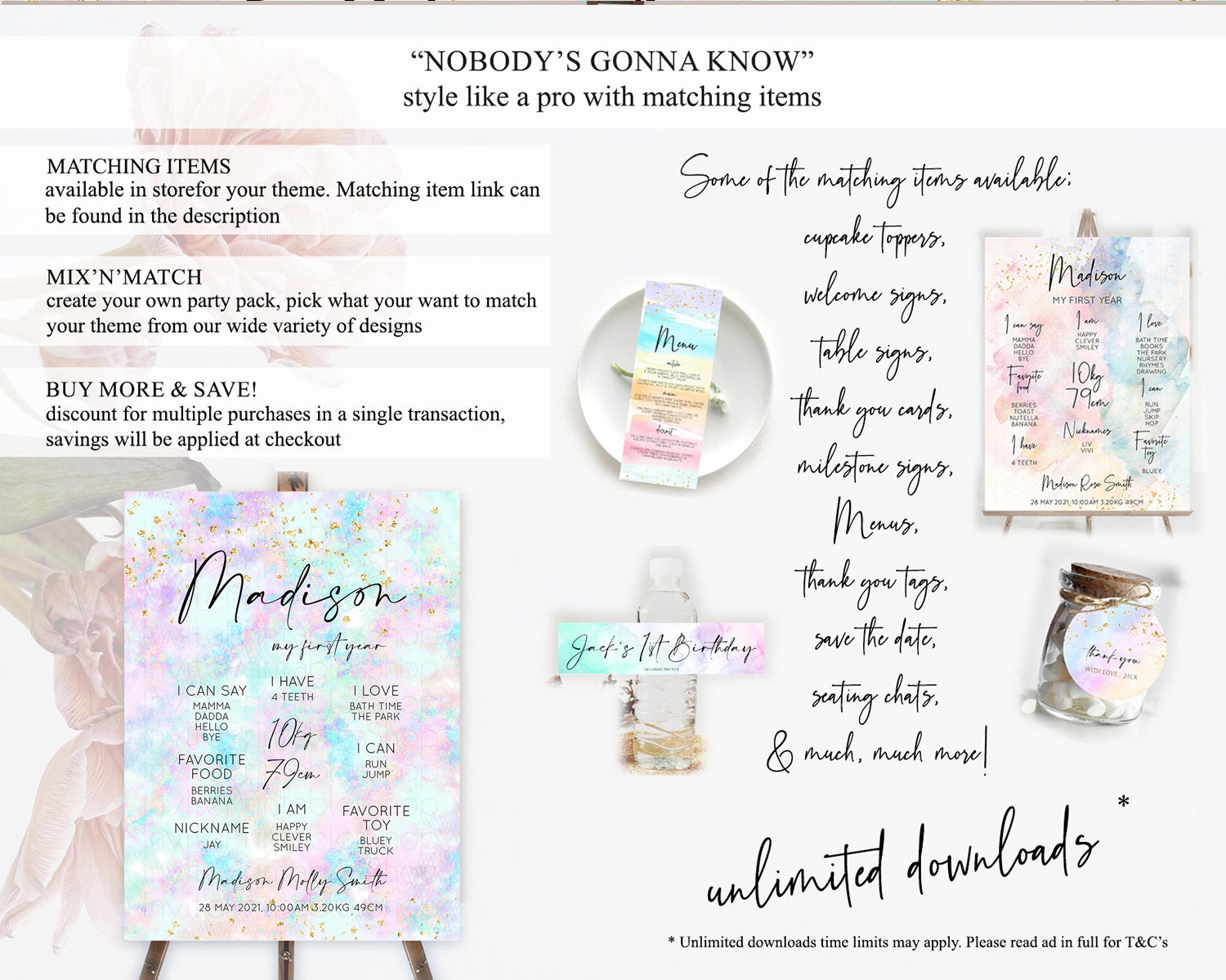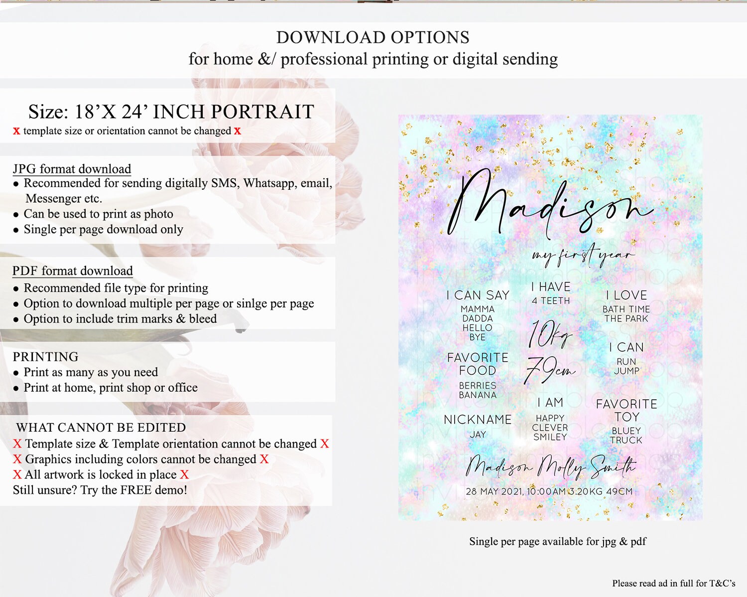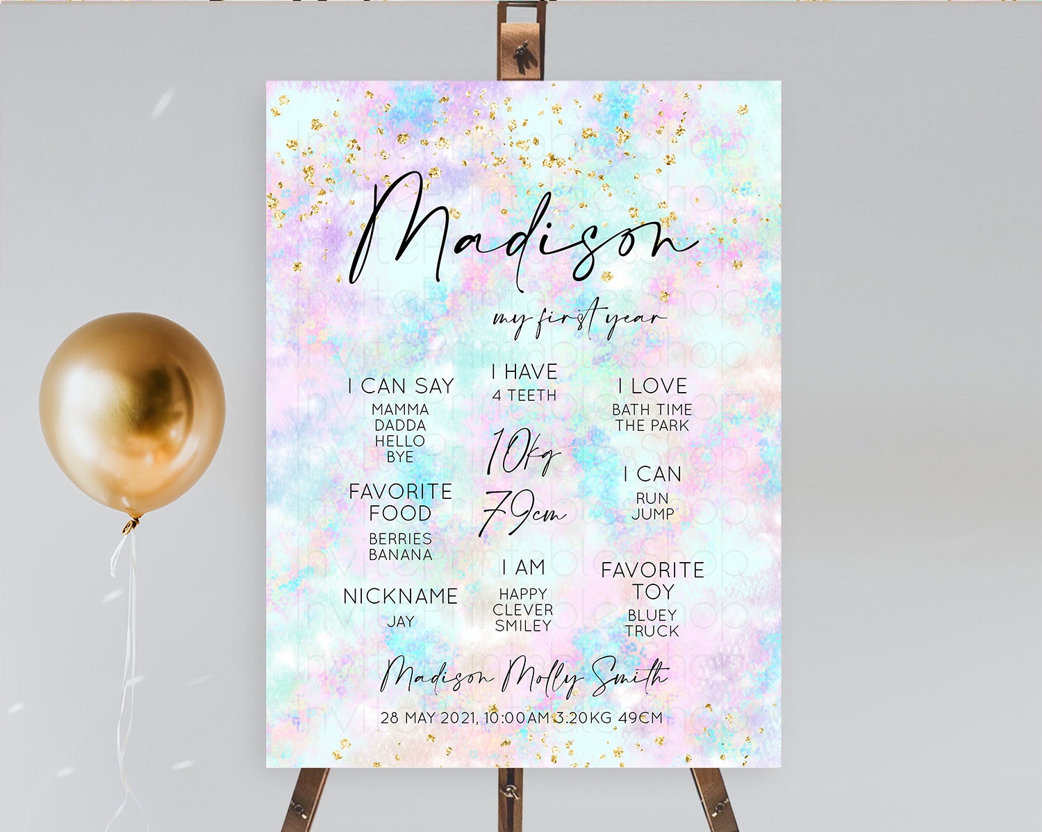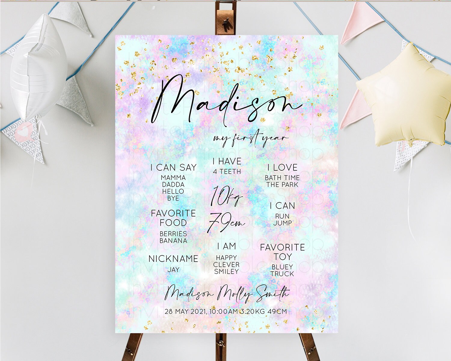 Pastel First Birthday Milestone Board Pastel Rainbow Milestone Poster Colorful Confetti Watercolor Glitter 1st Birthday Welcome Sign D10652