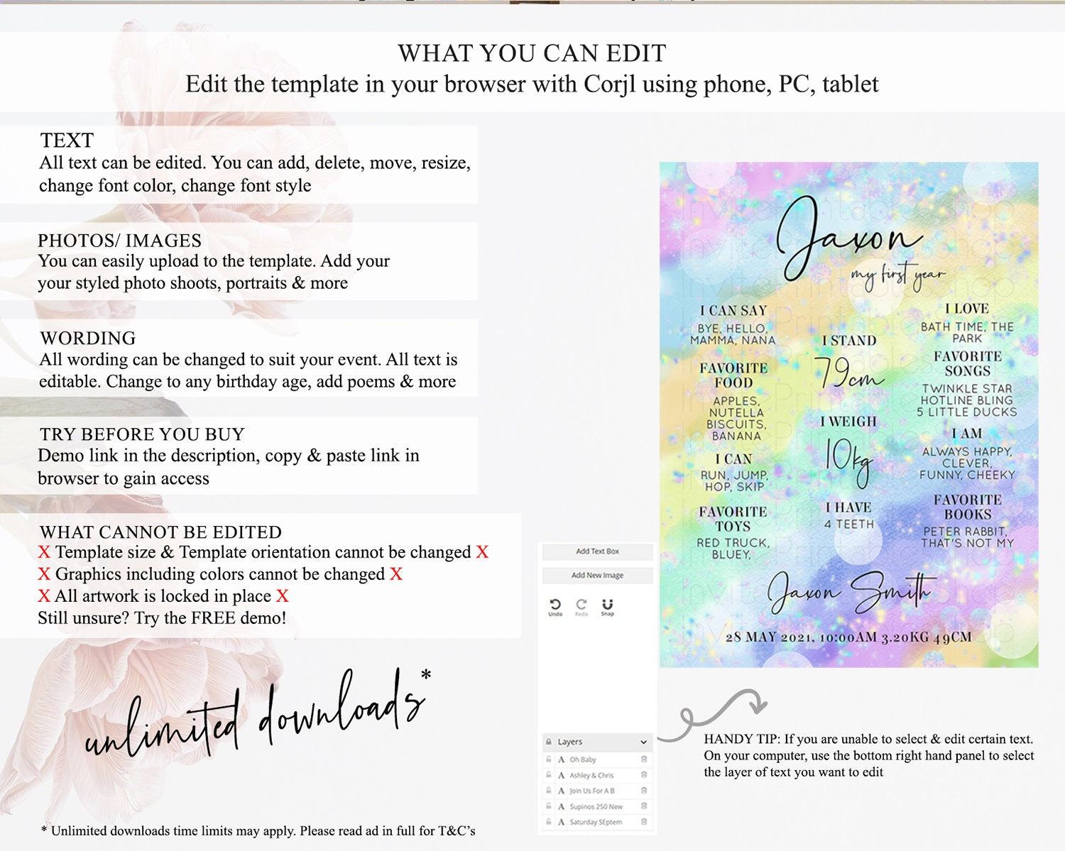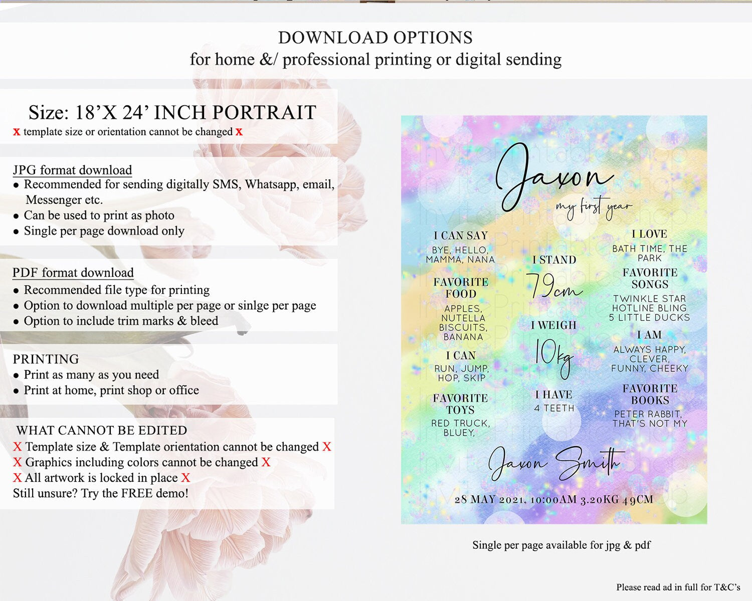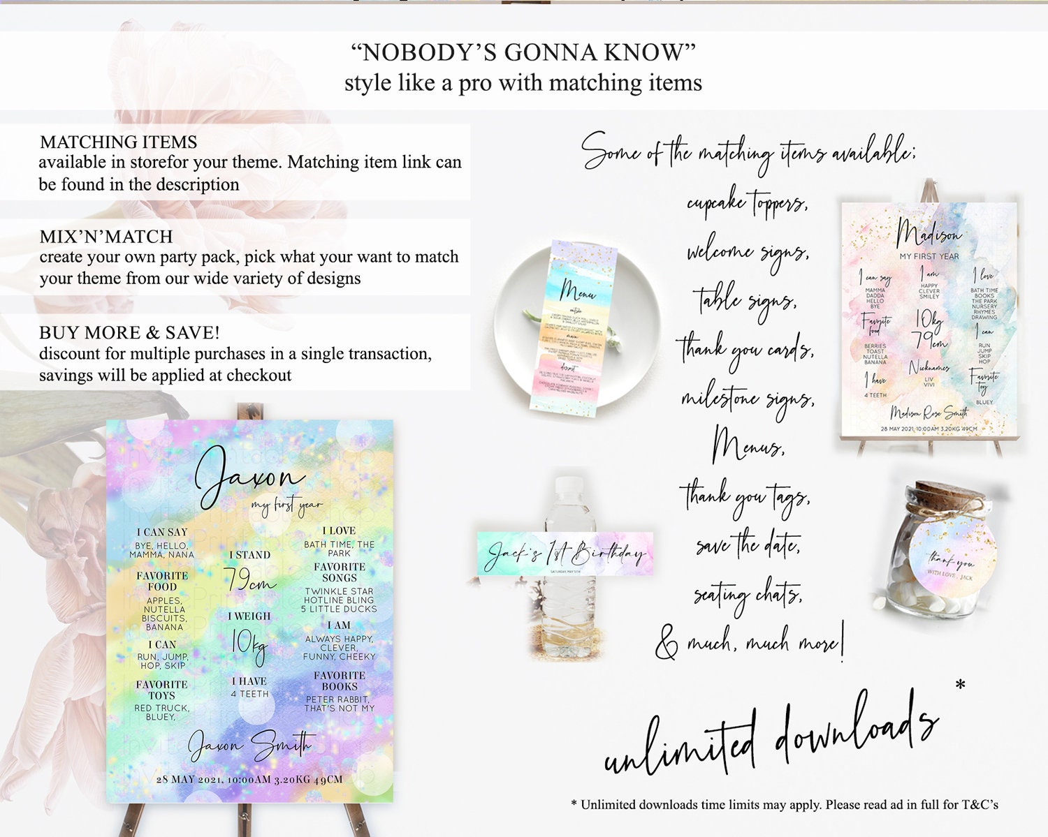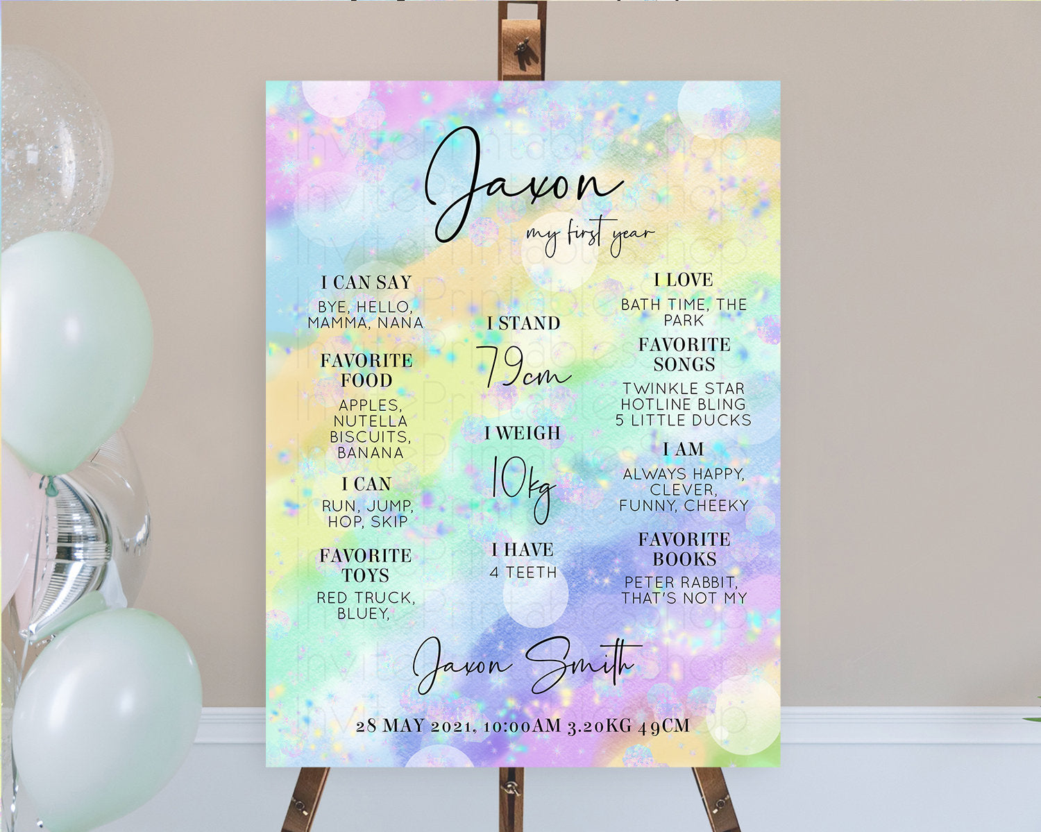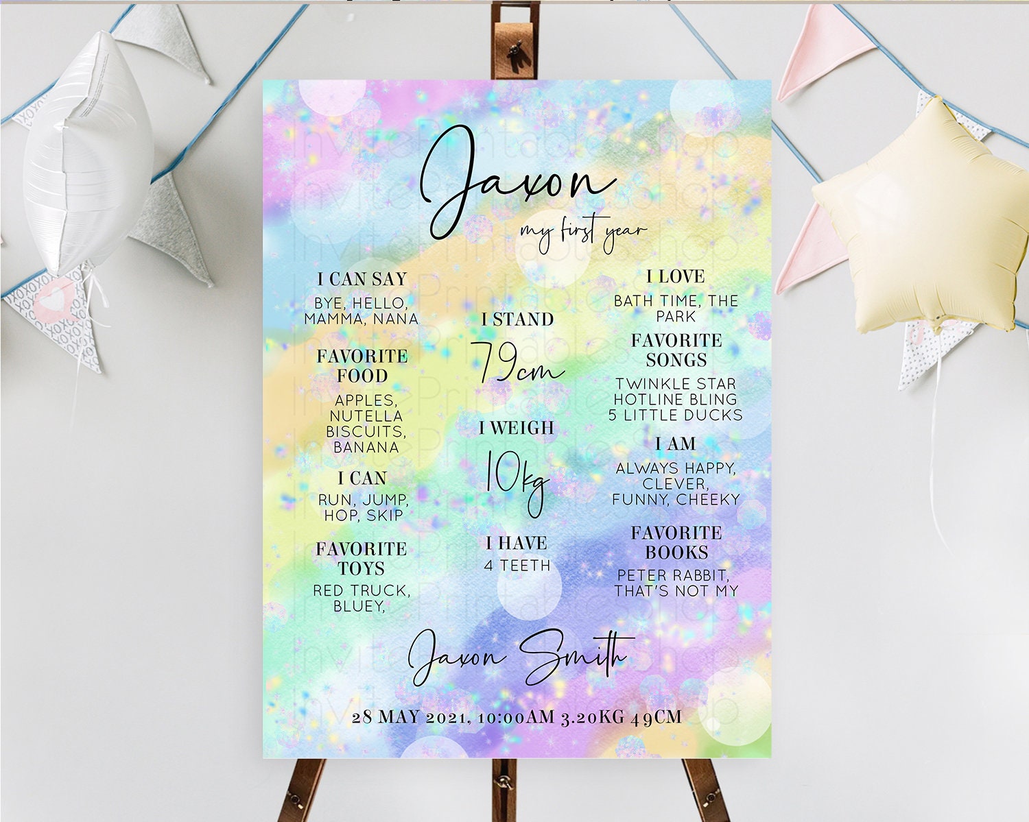 Pastel First Birthday Milestone Board Pastel Rainbow Milestone Poster Colorful Confetti Watercolor Glitter 1st Birthday Welcome Sign D10689