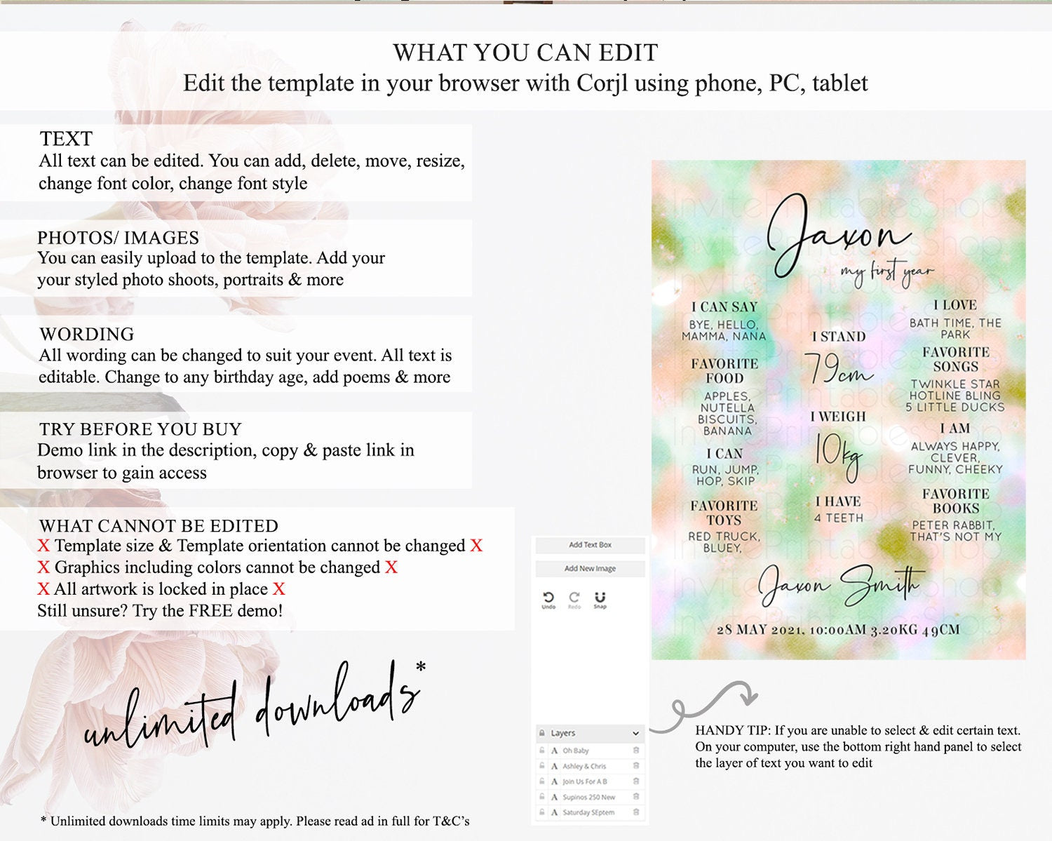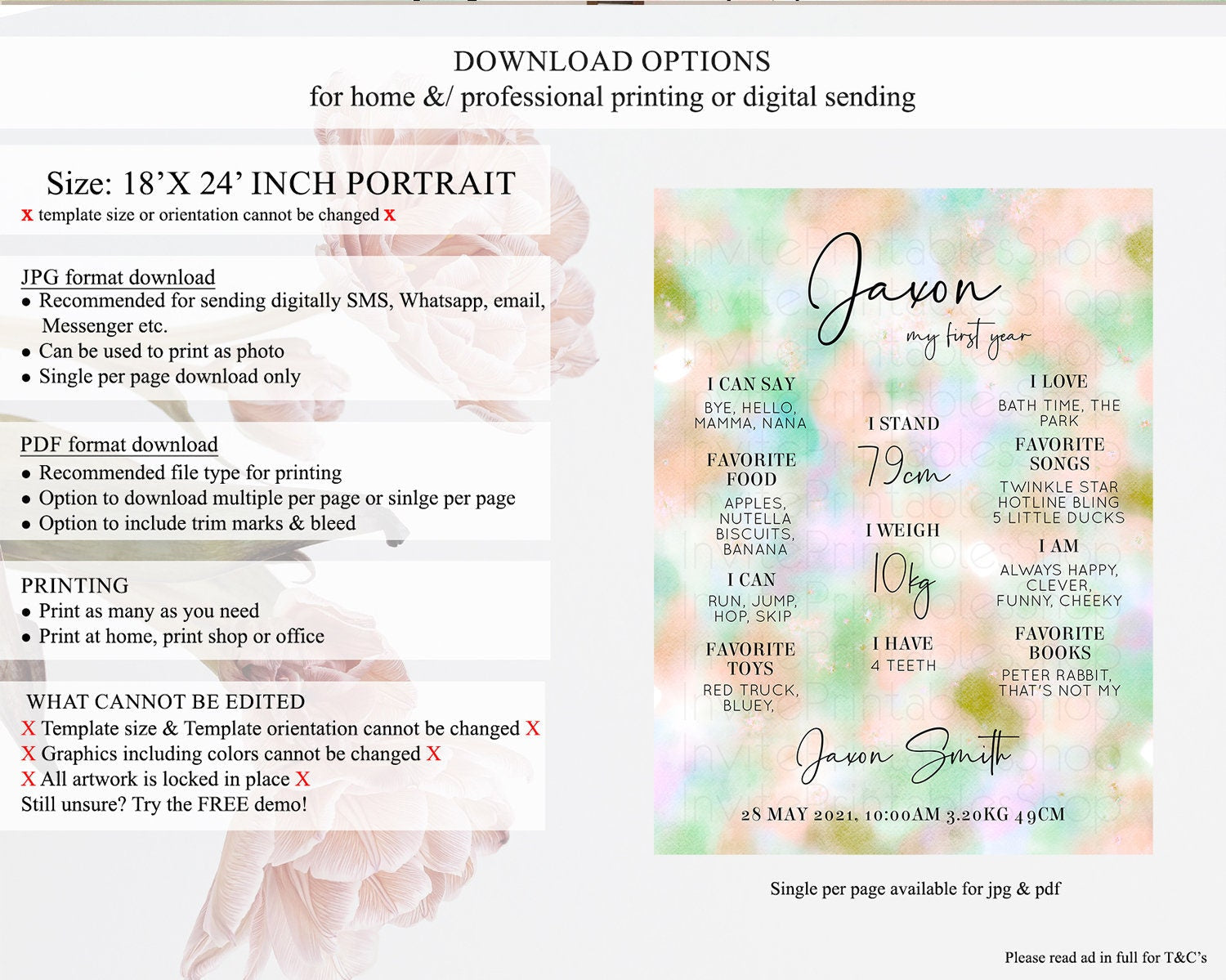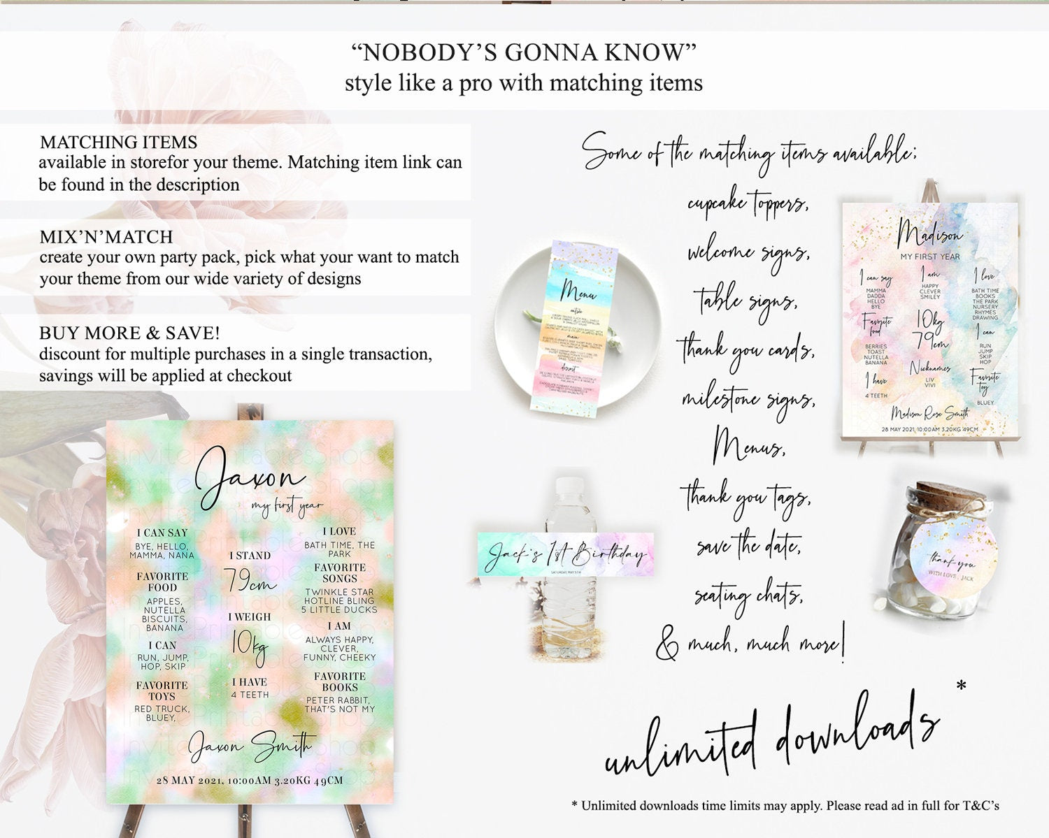 Pastel First Birthday Milestone Board Pastel Rainbow Milestone Poster Colorful Confetti Watercolor Glitter 1st Birthday Welcome Sign D10693