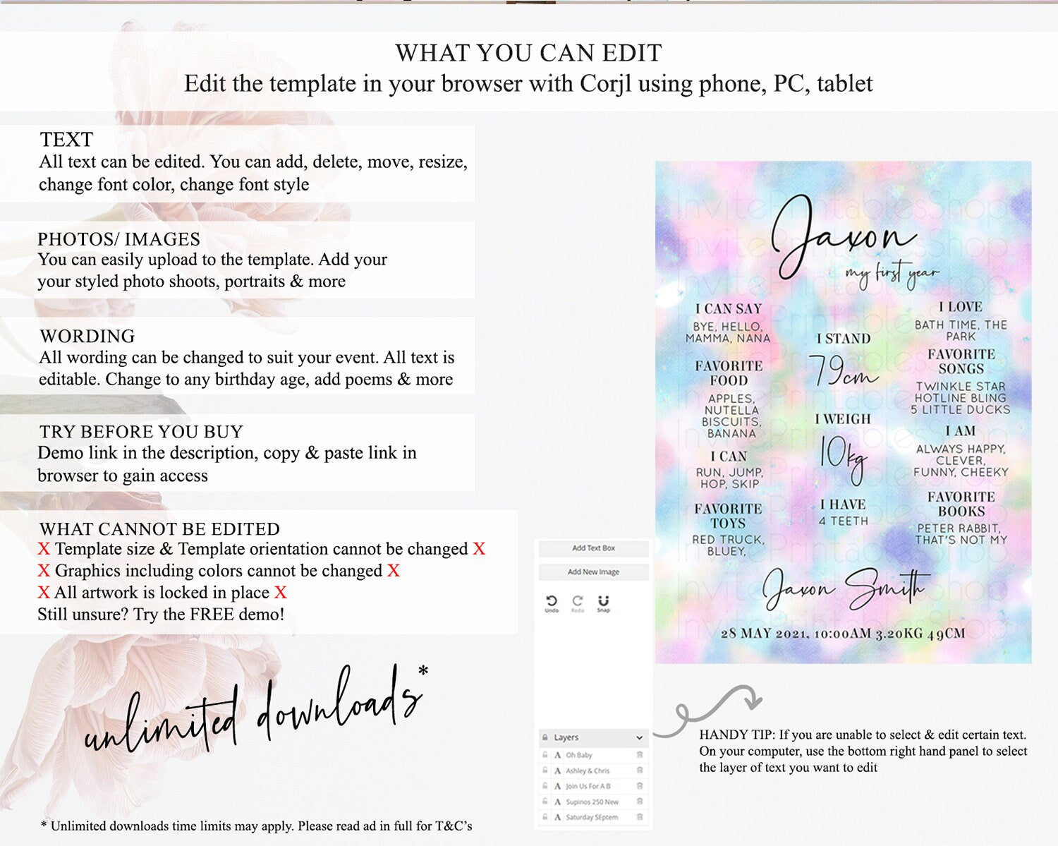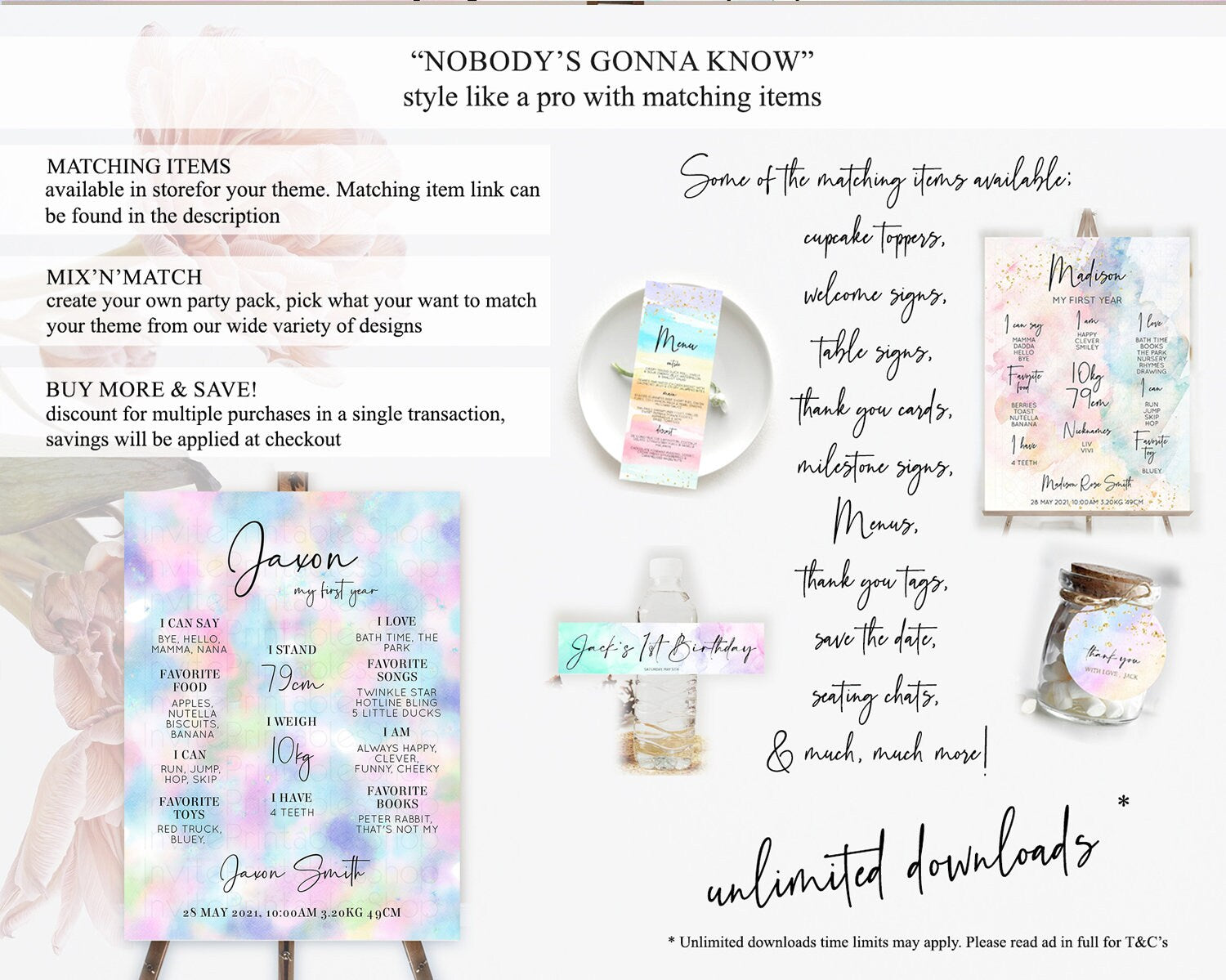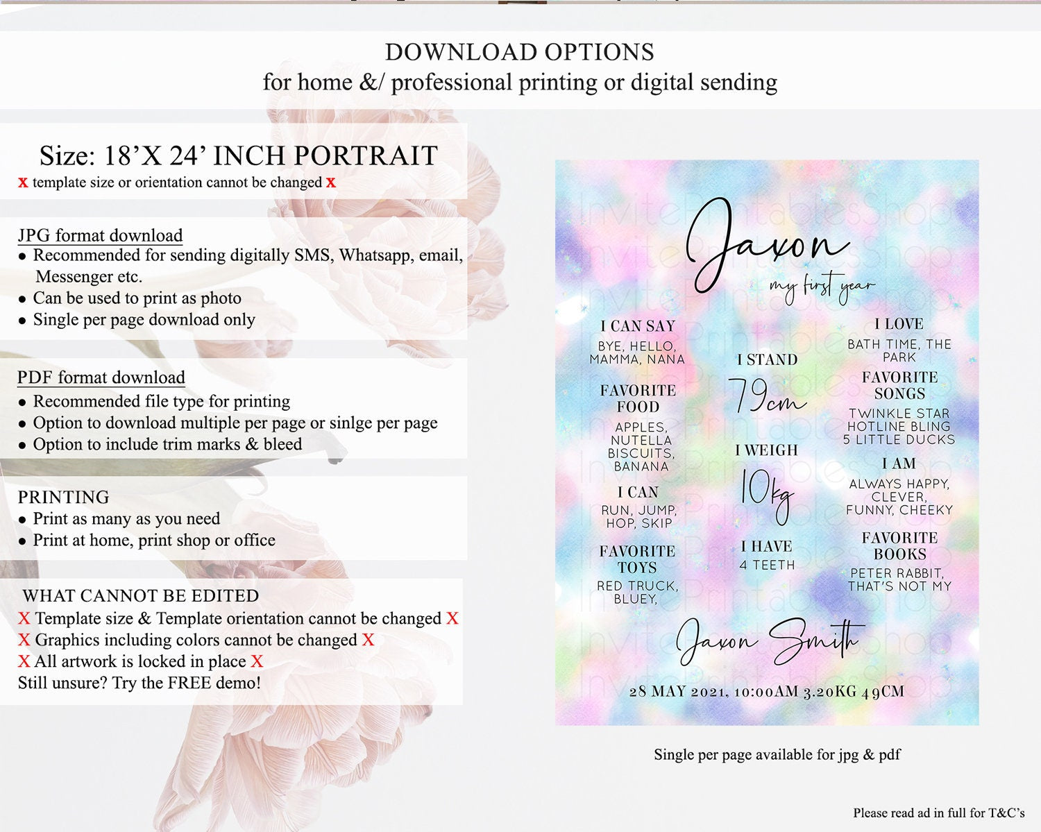 Pastel First Birthday Milestone Board Pastel Rainbow Milestone Poster Colorful Confetti Watercolor Glitter 1st Birthday Welcome Sign D10694