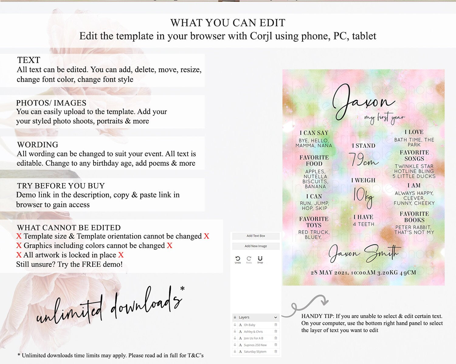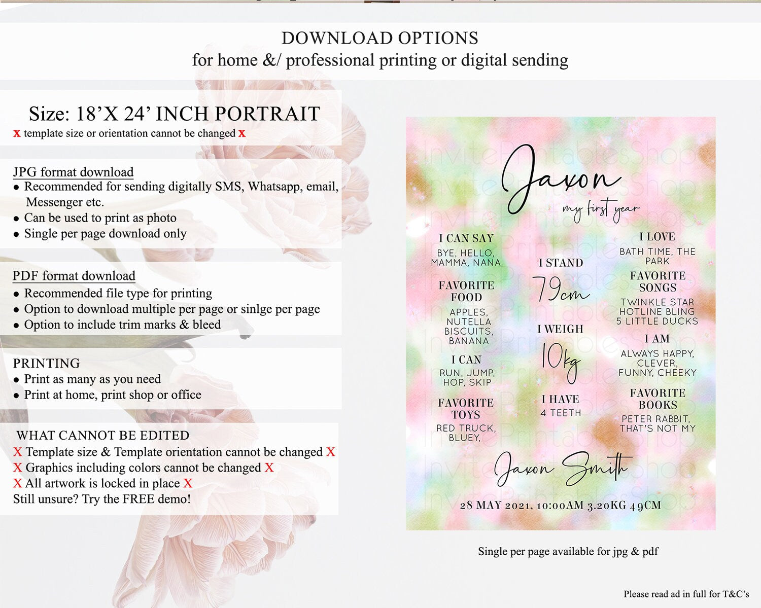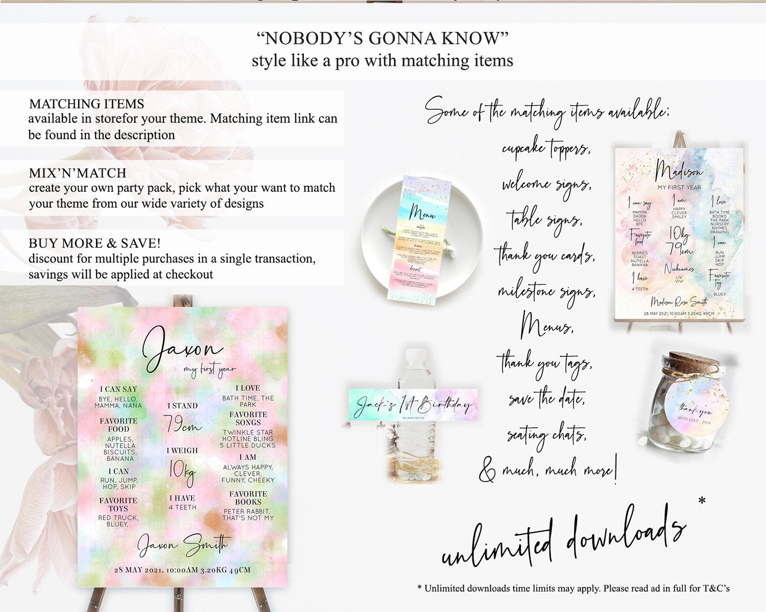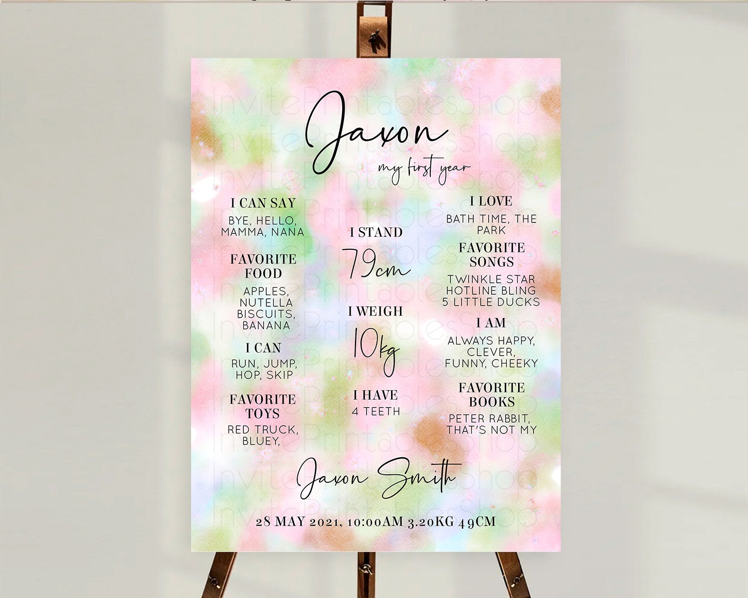 Pastel First Birthday Milestone Board Pastel Rainbow Milestone Poster Colorful Confetti Watercolor Glitter 1st Birthday Welcome Sign D10698