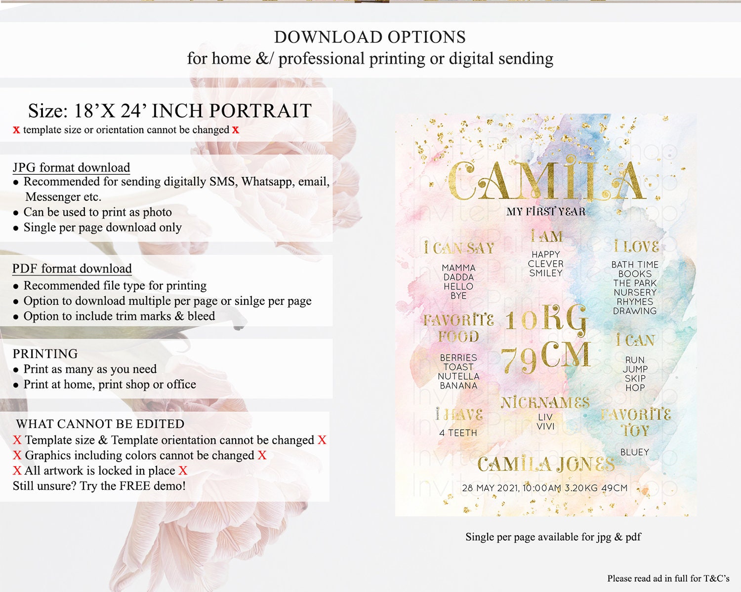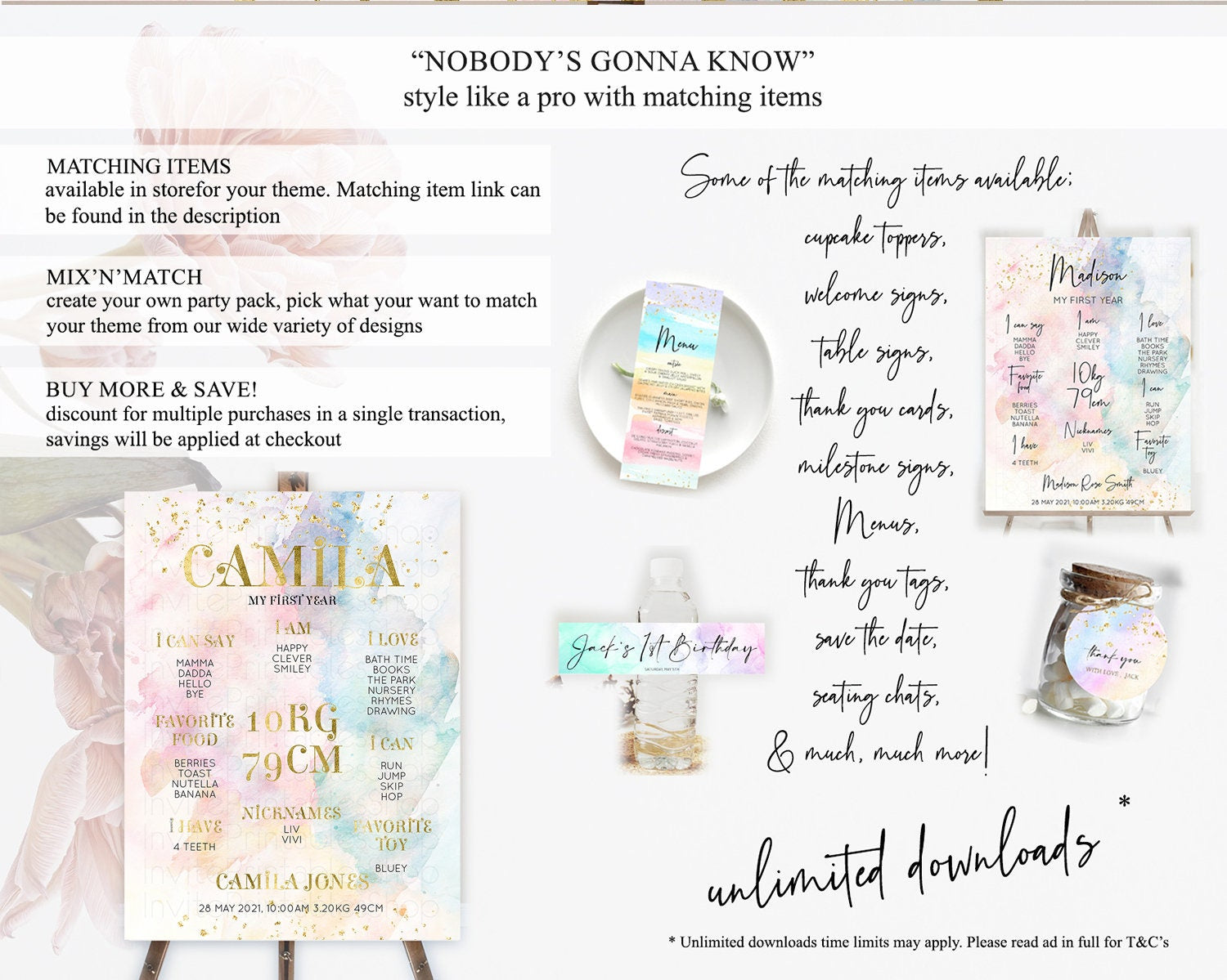 Pastel First Birthday Milestone Board Pastel Rainbow Milestone Poster Colorful Confetti Watercolor Glitter 1st Birthday Welcome Sign D10835