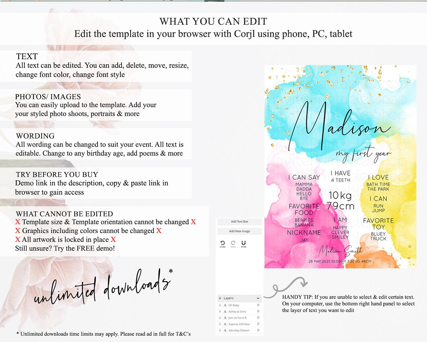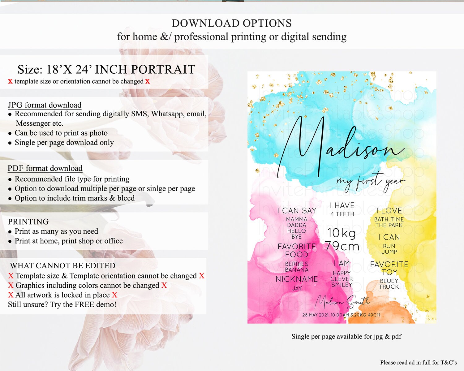 Pastel First Birthday Milestone Board Pastel Rainbow Milestone Poster Colorful Confetti Watercolor Glitter 1st Birthday Welcome Sign D10898