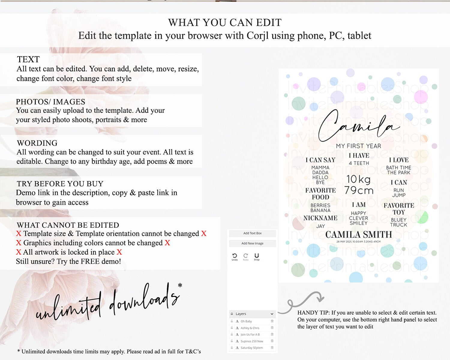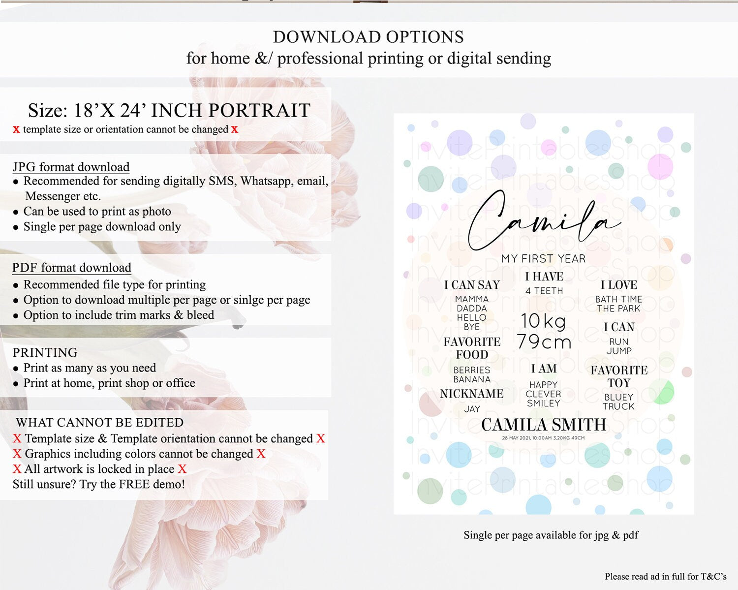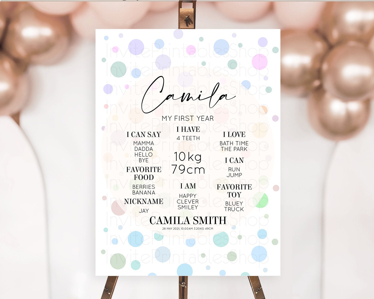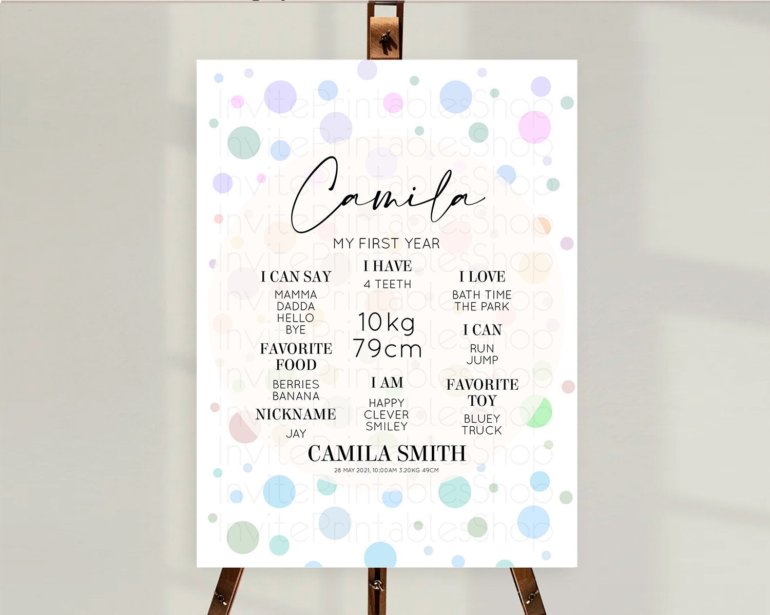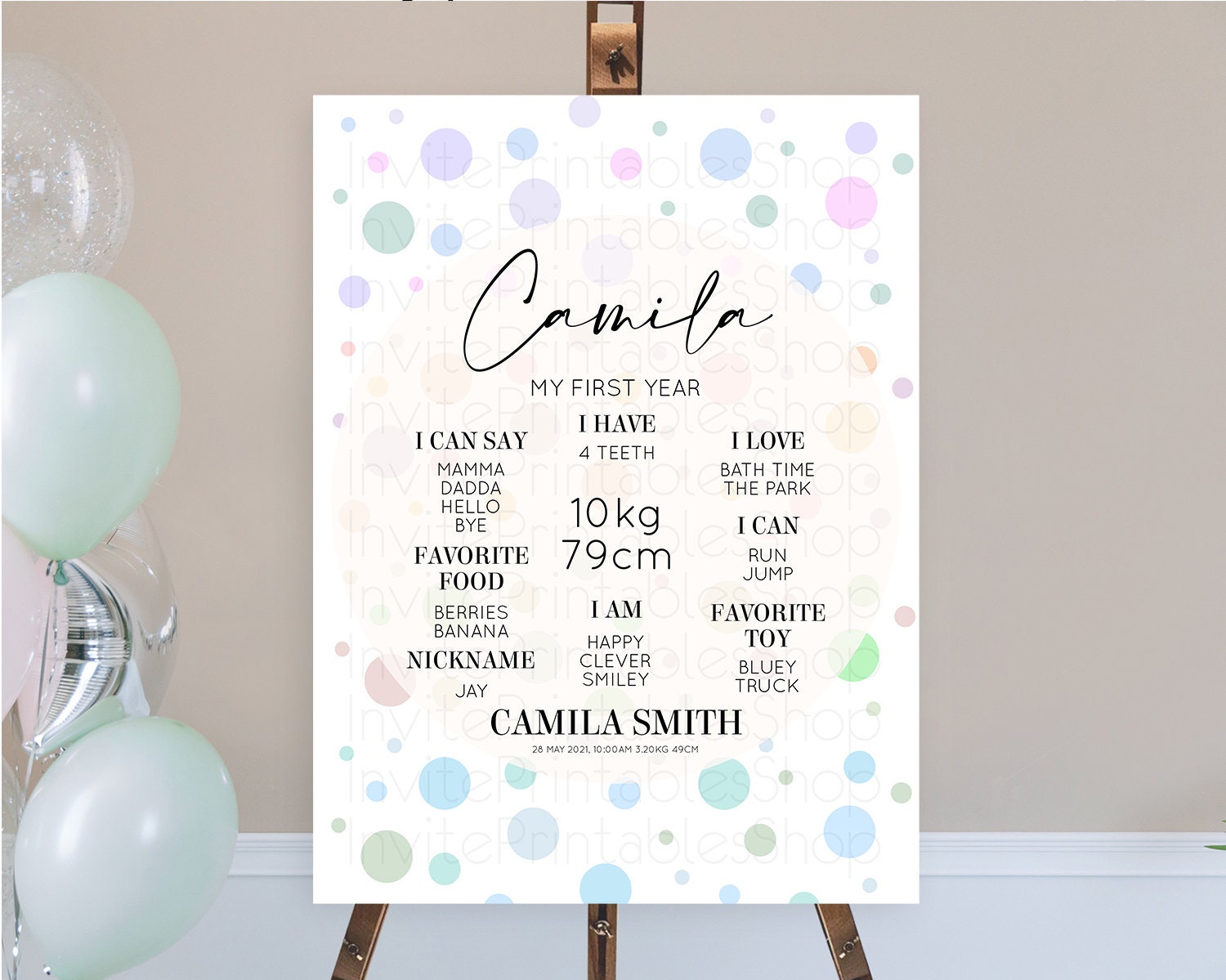 Pastel First Birthday Milestone Poster Pastel Rainbow Confetti First Birthday Milestone Board Colorful Bubbles Birthday Welcome Sign D10135