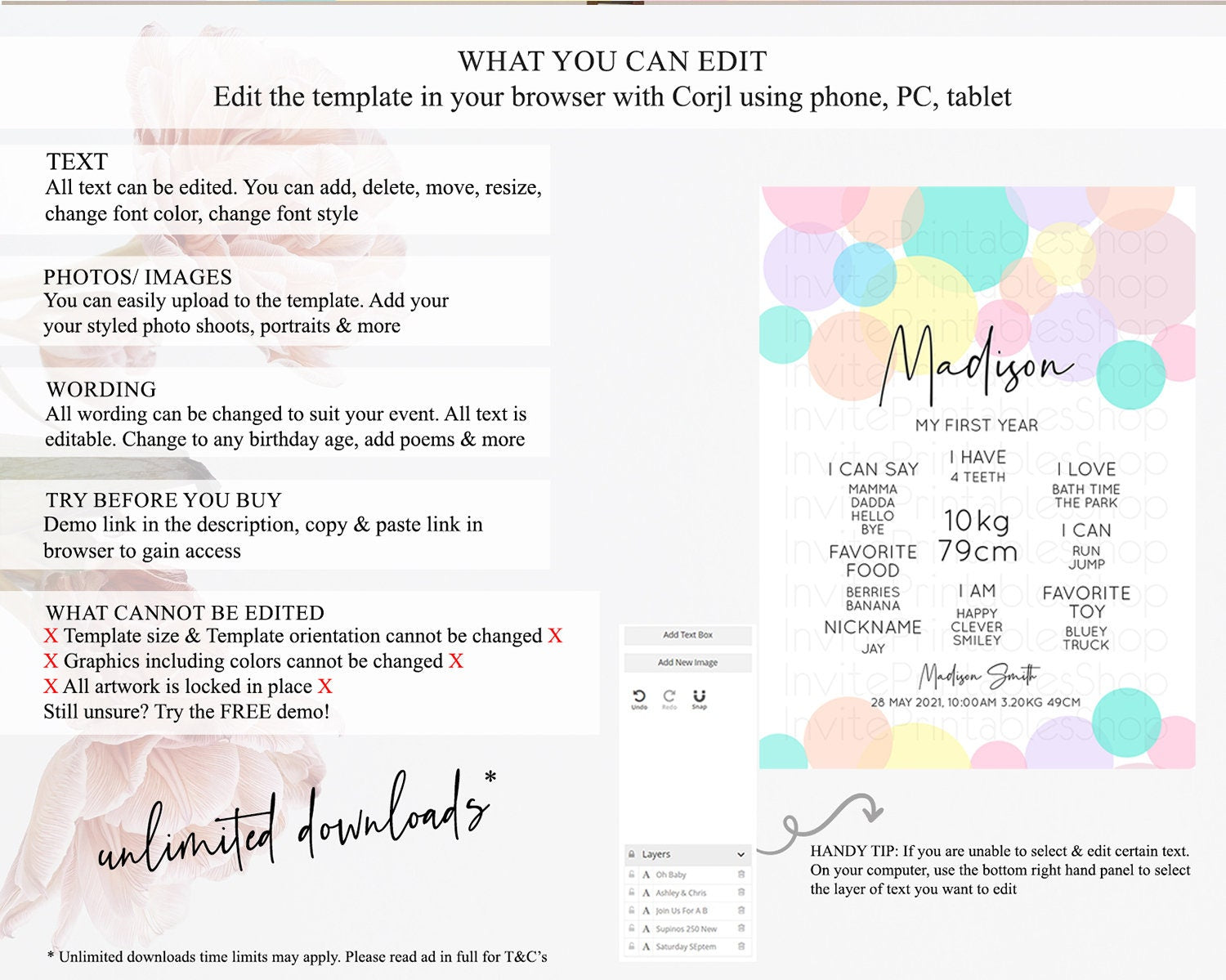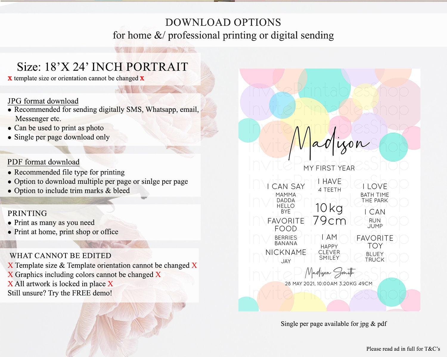 Pastel First Birthday Milestone Poster Pastel Rainbow Confetti First Birthday Milestone Board Colorful Bubbles Birthday Welcome Sign D10223