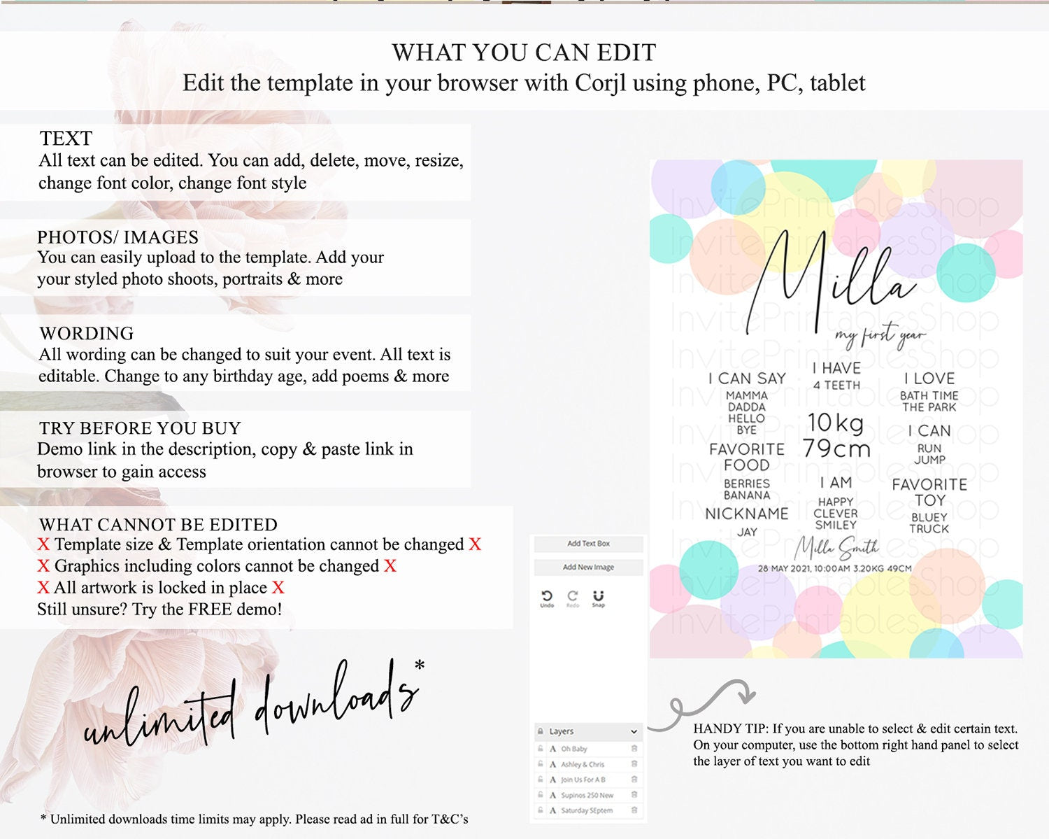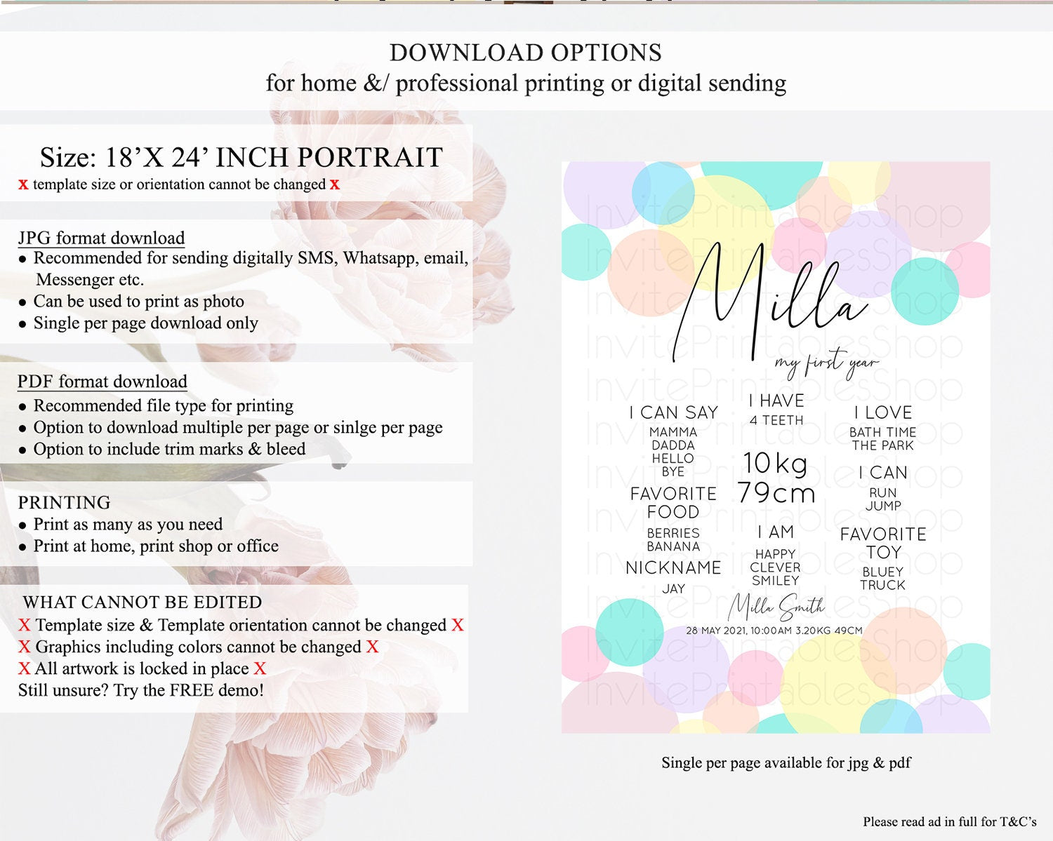 Pastel First Birthday Milestone Poster Pastel Rainbow Confetti First Birthday Milestone Board Colorful Bubbles Birthday Welcome Sign D10784