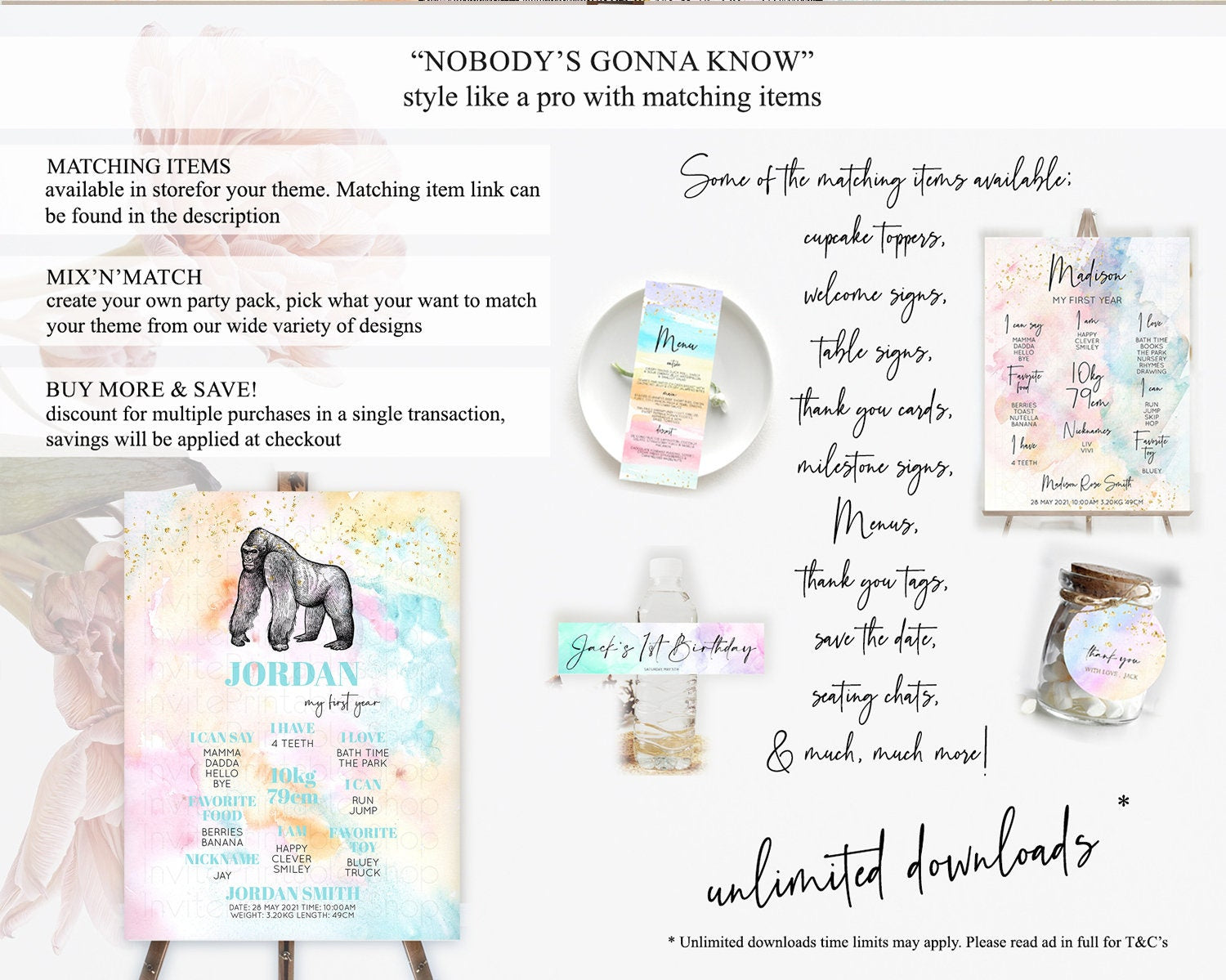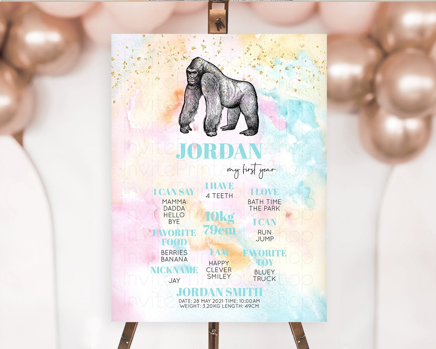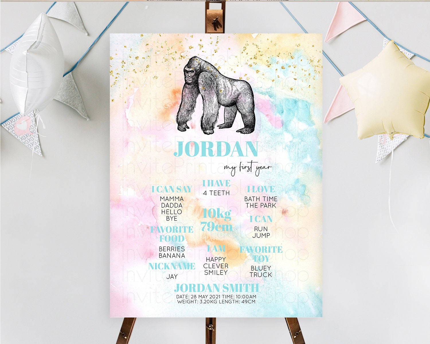 Pastel Gorilla First Birthday Milestone Board Gorilla Milestone Poster Colorful Rainbow Pastel Watercolor 1st Birthday Welcome Sign D10284