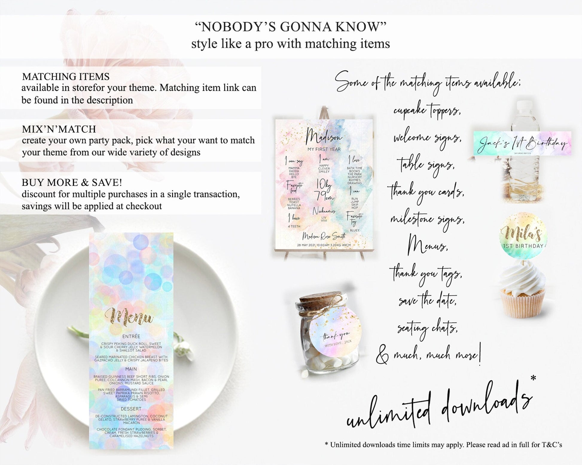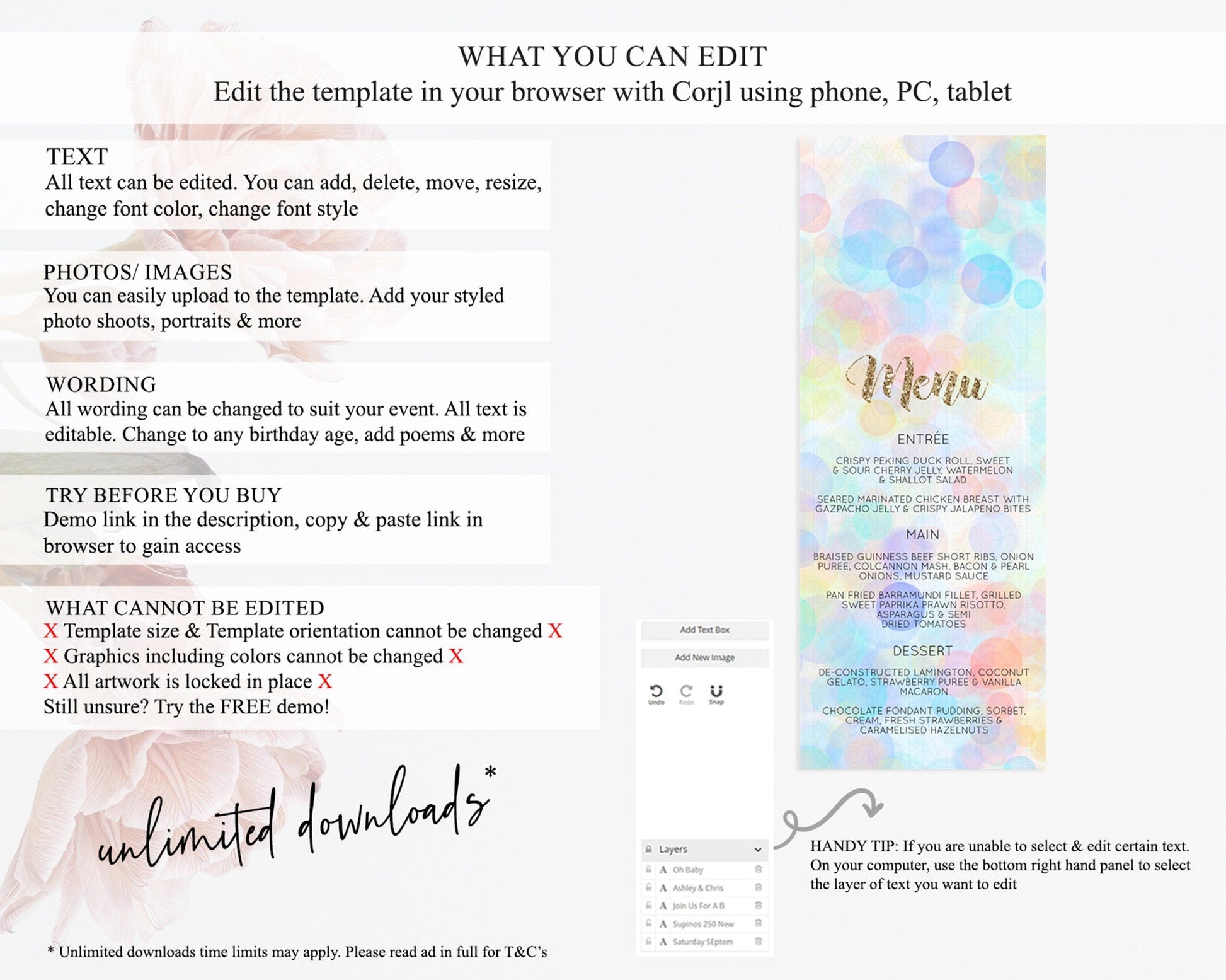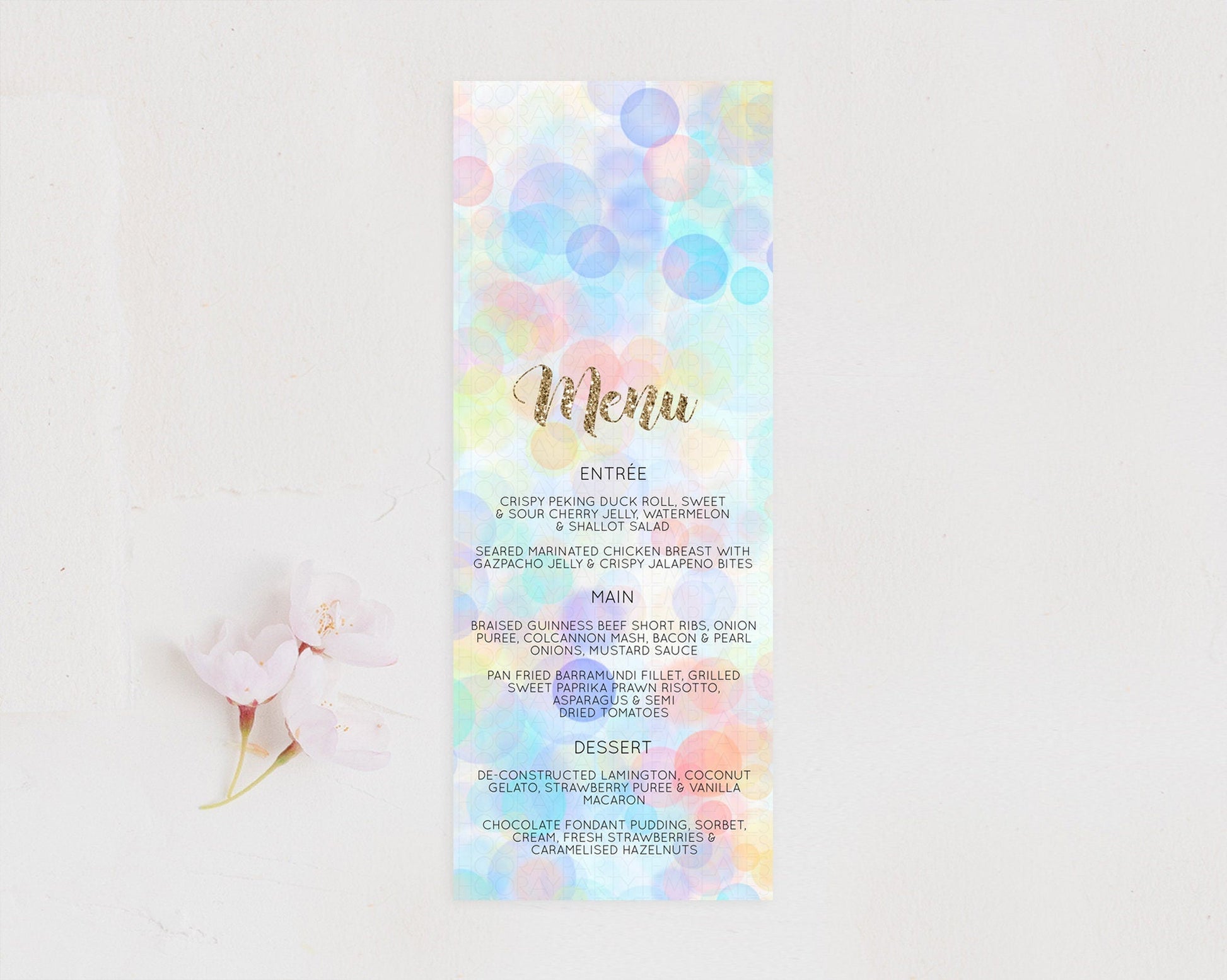 Pastel Menu Bubbles Menu Template Bubble Bath Table Decor Rainbow Pastel Colorful Confetti Dinner Dessert Menu Party Food Menu D10447