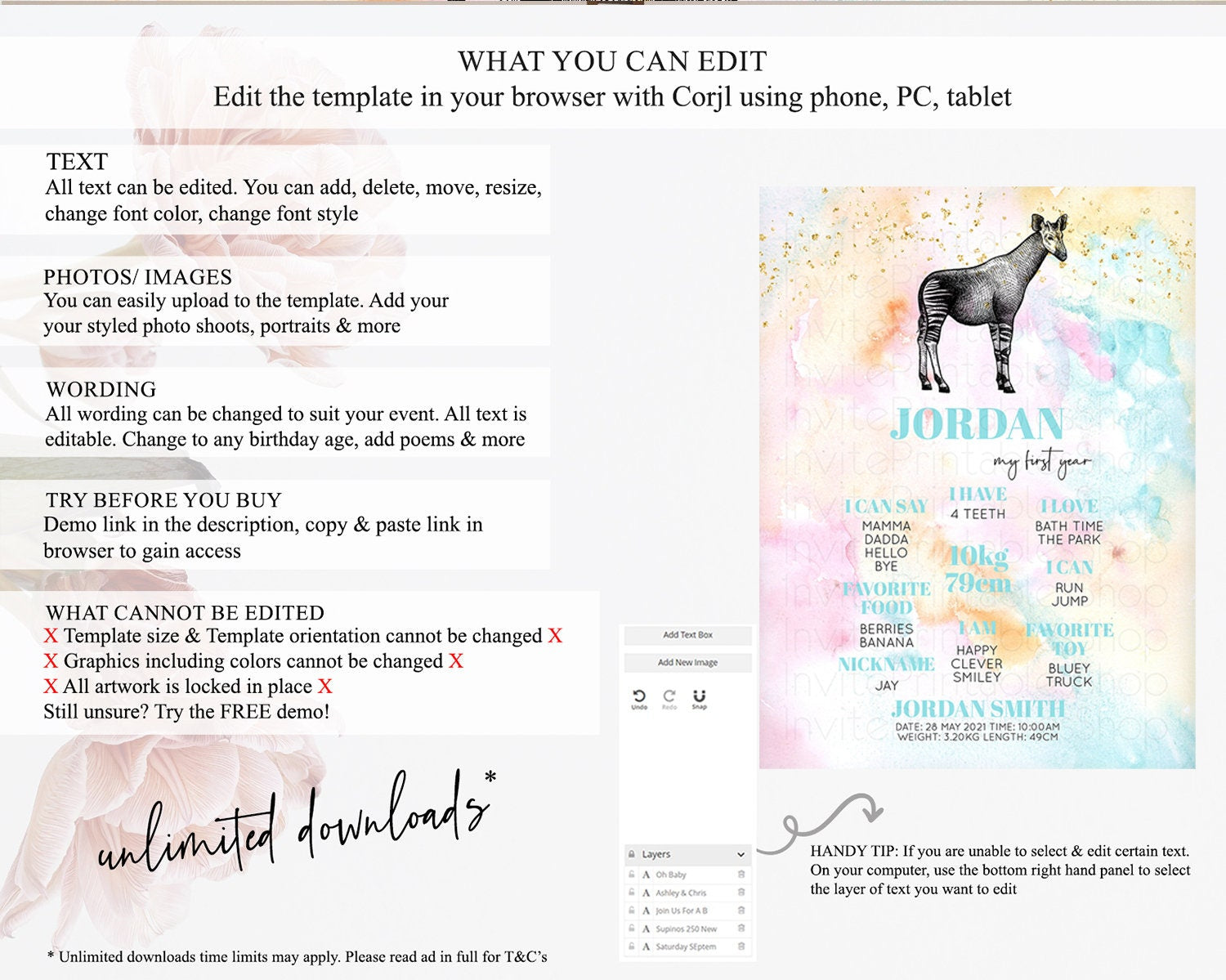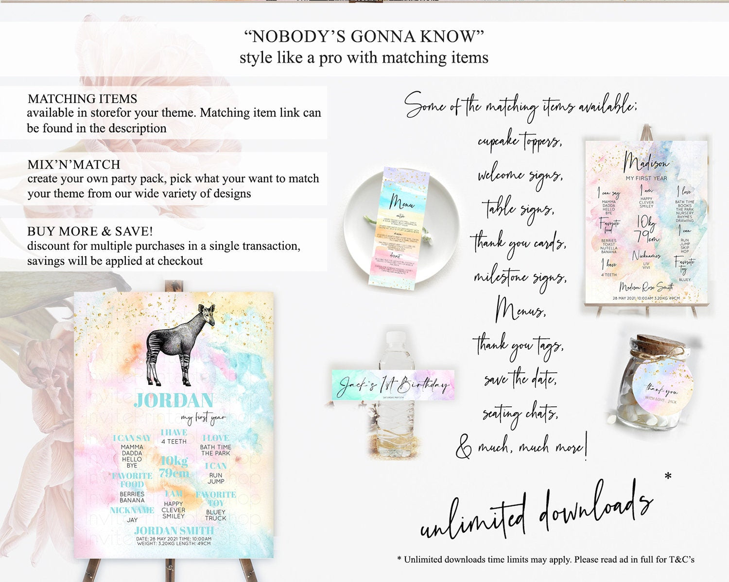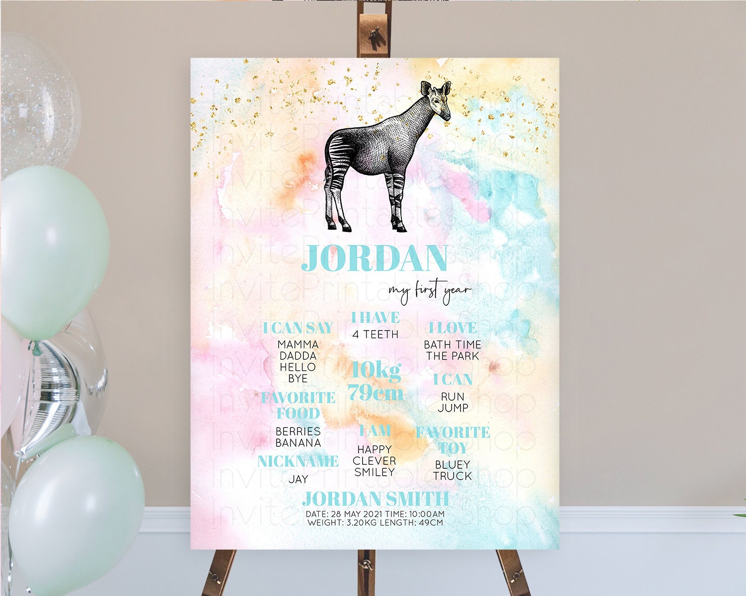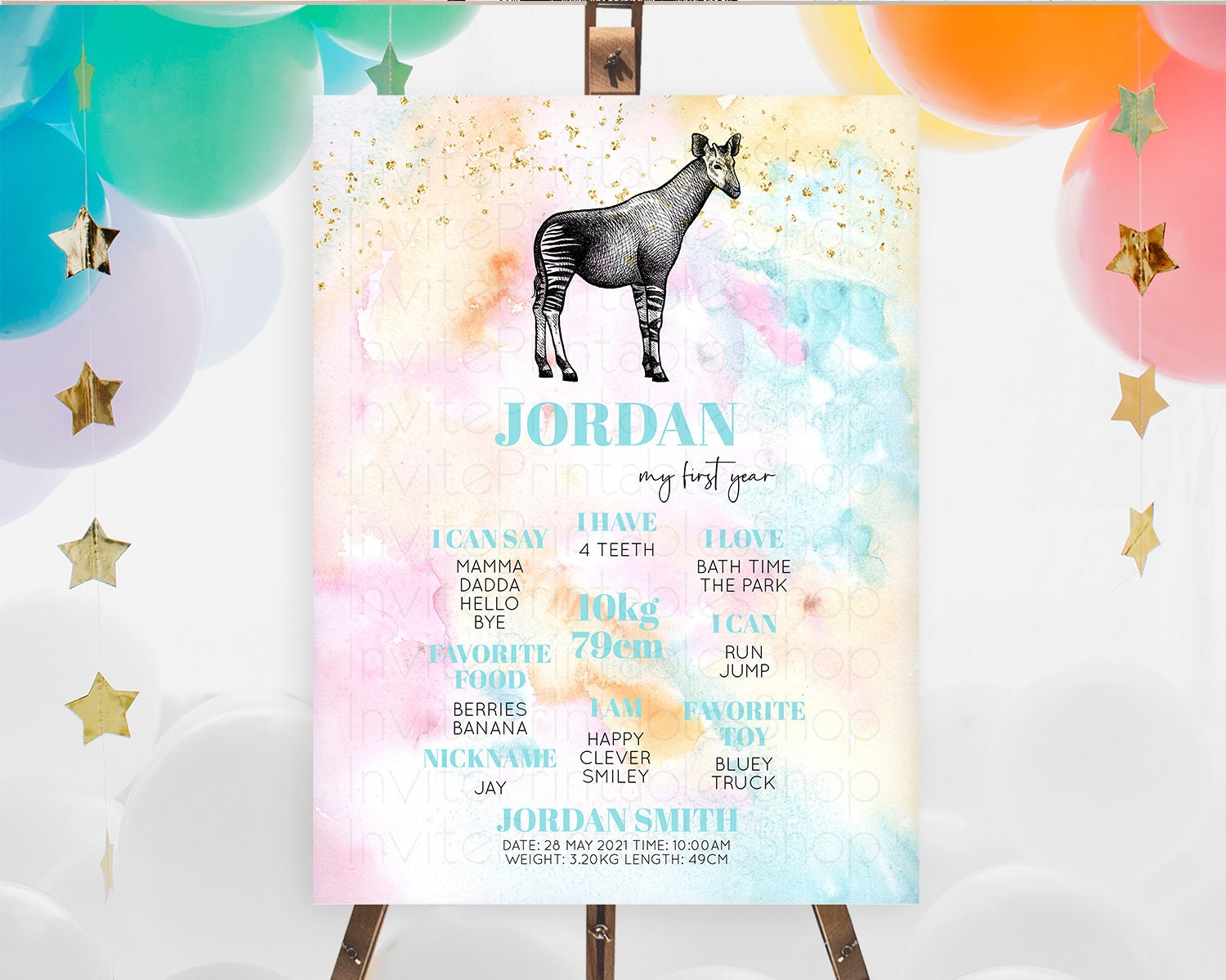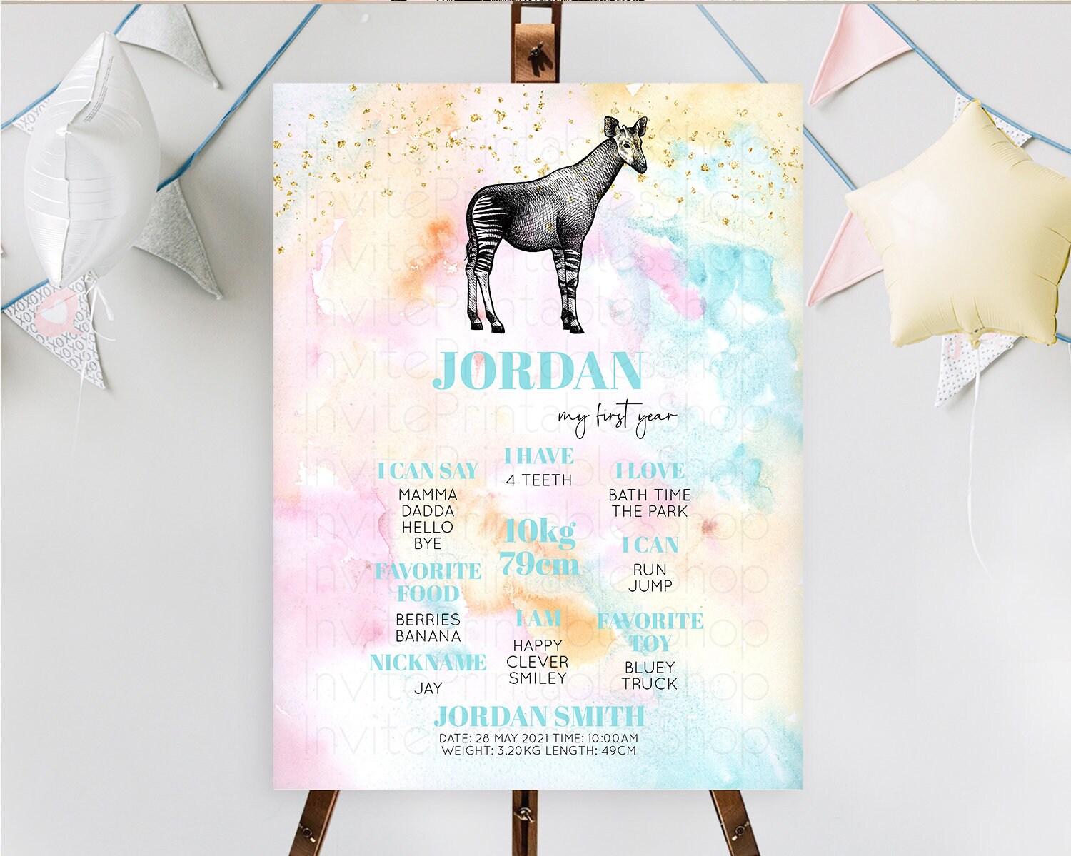 Pastel Okapi First Birthday Milestone Board Okapi Milestone Poster Colorful Rainbow Pastel Watercolor Okapi 1st Birthday Sign D10282