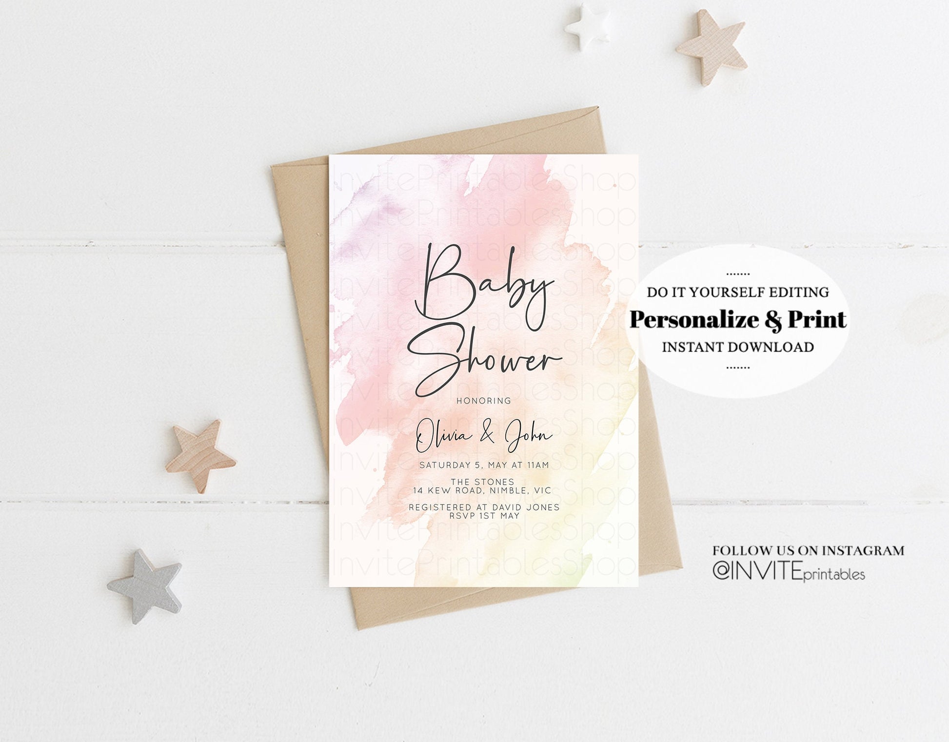 Pastel Pink Baby Shower Invitation Watercolor Ink Gold Glitter Foil Sprinkles Confetti Splash It's a Girl Invite Editable Instant 145