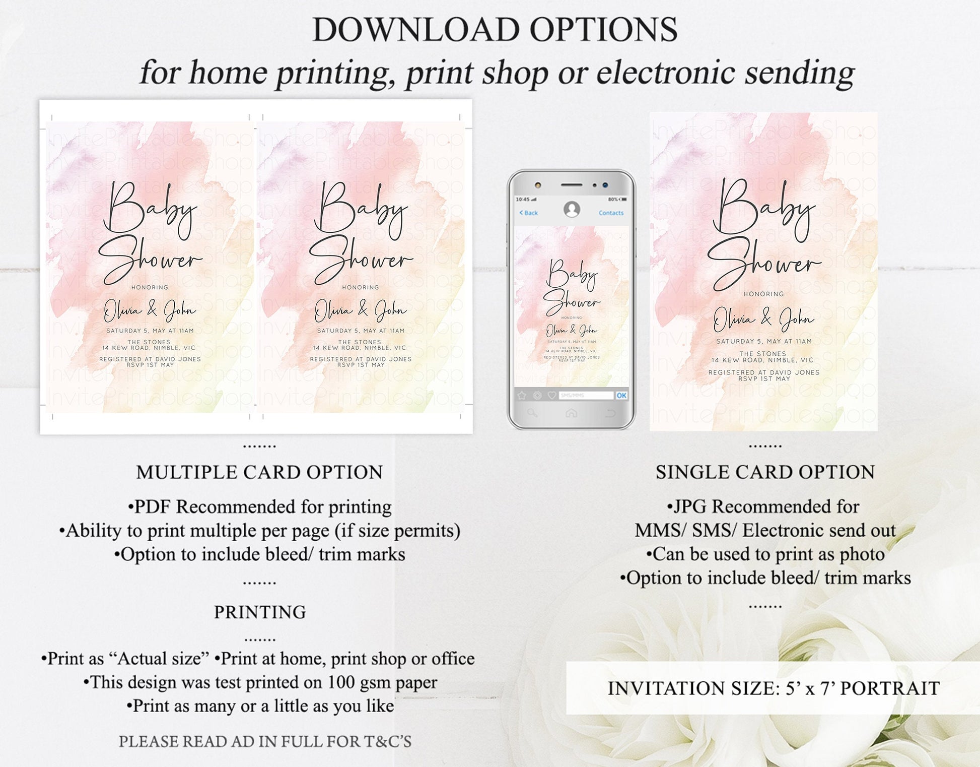•Try before you buy! • DEMO LINK- https://www.corjl.com/d/1E0HGJ Matching items: https://etsy.me/3Hy6T4W PLEASE READ AD IN FULL!! •Digital file. No physical item will be shipped •Do it yourself Editing. Edit online with Corjl or Edit with your mobile ITEM DETAILS Invitation size: 5’x7’ File type: PDF, JPEG Resolution: 300DPI PDF FILE OPTIONS: •Recommended for printing •Ability to print multiple per page (if size permits) •Option to include bleed/ trim marks JPG FILE OPTIONS: •Recommended for MMS/ SMS/ Electronic send out •Can be used to print as photo •Option to include bleed/ trim marks EDITING • Do it yourself editing • Mobile editing is available • Google chrome is the recommend browser for Corjl. Please download here for FREE: https://www.google.com/chrome/ • Using other browsers may not show all of Corjl's editing features • Editing on a desktop/ laptop computer is recommended to access all of Corjl features • Mobile editing is available, please use a desktop/ laptop computer to access all of Corjl features DOWNLOADS & EXPIRY •Maximum 3 downloads on the same edit •Link expires 30 days after purchase DOWNLOAD NOTICE •Once you have reached your download limits &/ “approve proof” in Corjl. You will not be able to request further downloads on your design. Further download requests are not permitted WHAT IS EDITABLE •Text - colours, fonts, size, move, delete & rotation. •Please see demo link for what you can and can’t do WHAT YOU CAN’T EDIT •Template size •Template orientation •Graphics CAN NOT BE deleted, moved, or changed in colour •Please see demo link for what you can and can’t do HOW TO 1. Choose design template & checkout on Etsy. 2. Email will be sent from Corjl. Follow link to access template 3. Edit, save & print INSTRUCTIONS •Instructions on how to edit your design have been written by Corjl and will be available with your purchase. PRINTING •Colours can vary depending on the monitor, printer & cardstock •Can be printed at home •Home printing will require you to select the high quality print settings, select appropriate paper thickness & click "Actual size" prior to you printing •This design was test printed on 100 gsm paper •Can be printed at local print shop. Please check printing requirements & any printing restrictions prior to purchase PERSONAL USE ONLY. This item cannot be shared, re-sold, or used commercially for profit. REFUND POLICY •We are unable to provide a refund/ exchange on commenced & completed work, instant downloads or self-editing link templates. Please use the demo link to work out if this product is right for you. Copyright © 2018 by InvitePrintablesShop PTY LTD All rights reserved. This file or any portion thereof may not be reproduced or resold without the express written permission of the publisher (including edits to the design). Our files are provided as high-resolution PDFs – the end result is dependent upon the printer and paper used. If using a professional printing company, InvitePrintablesShop are not responsible for their specific printing requirements, paper or colour quality. Any changes required to the template are not included with your purchase – the files come as described in the listing only and cannot be changed. Thank you for visiting Invite Printables Shop:)
