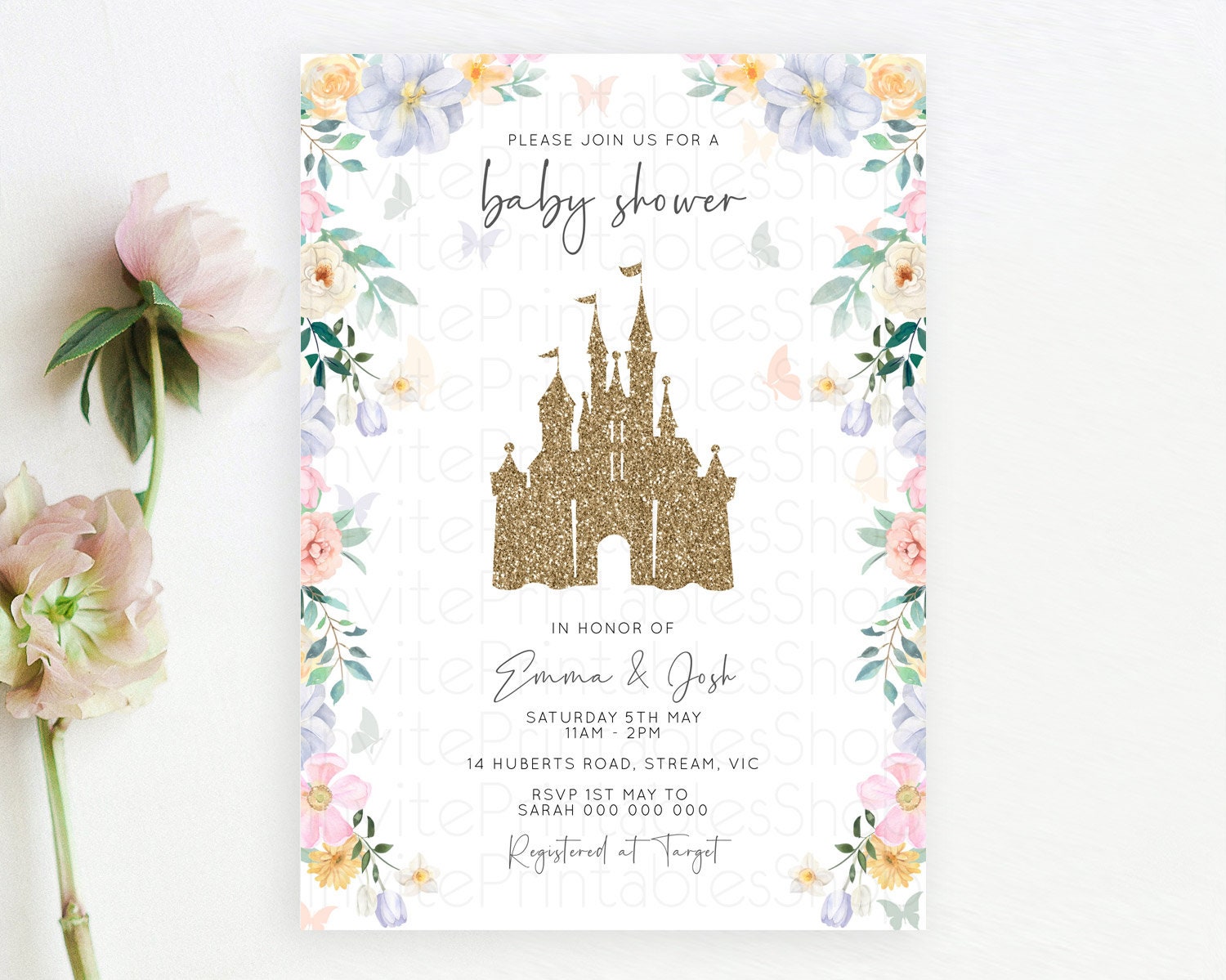 Pastel Princess Baby Shower Invitation Floral Castle Invitation Royal Baby Invite Enchanted Castle Pastel Flower Garden Baby Shower D10469