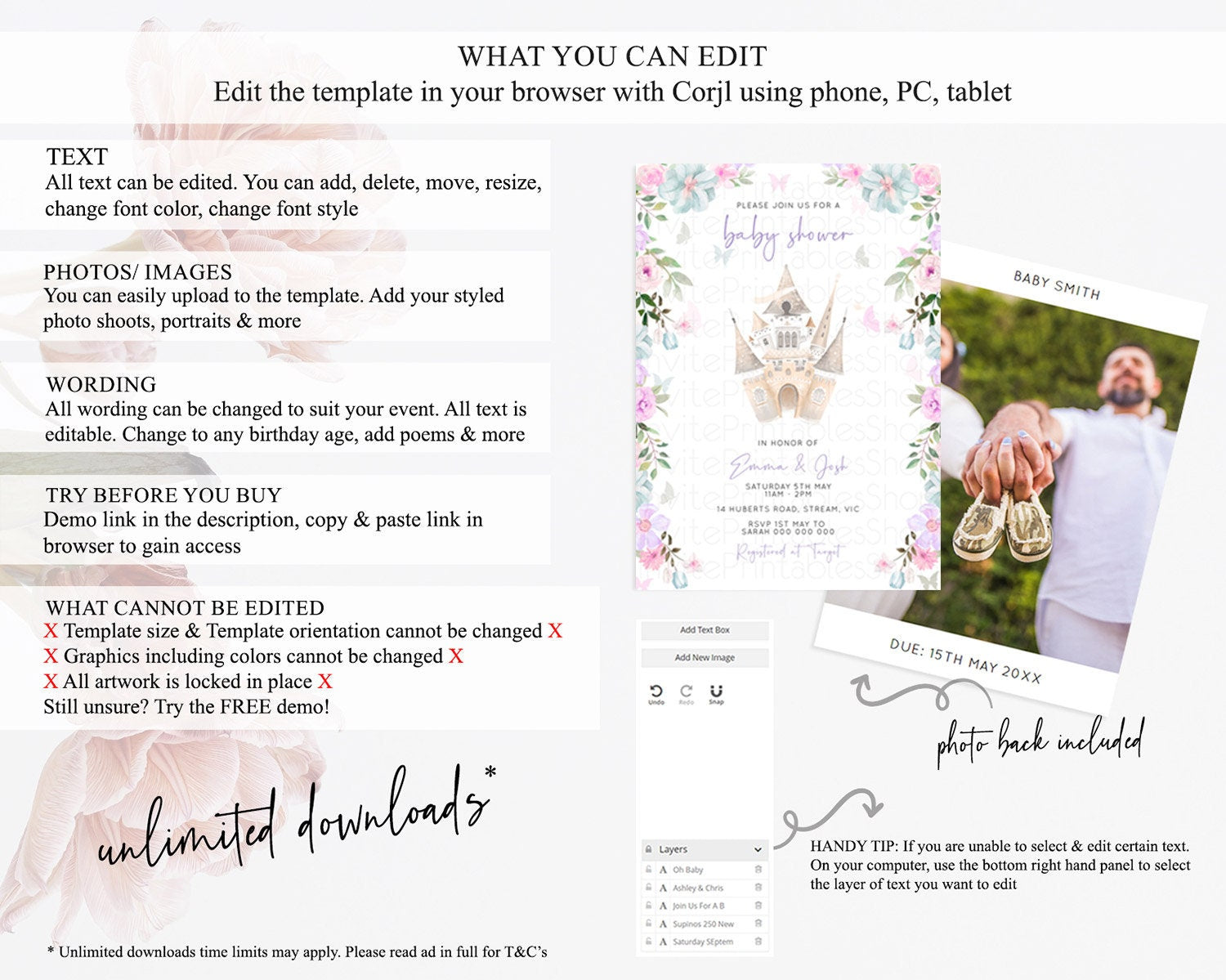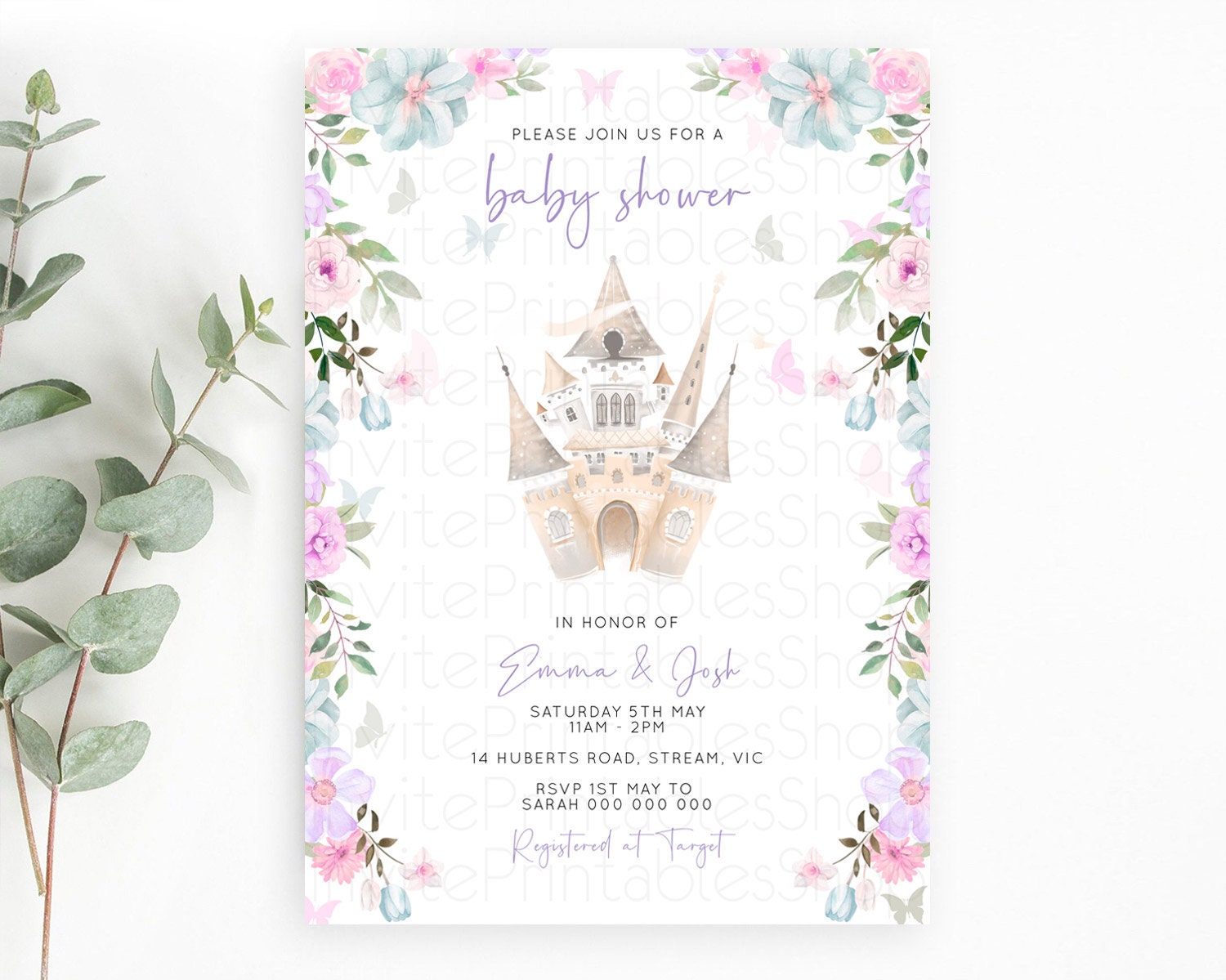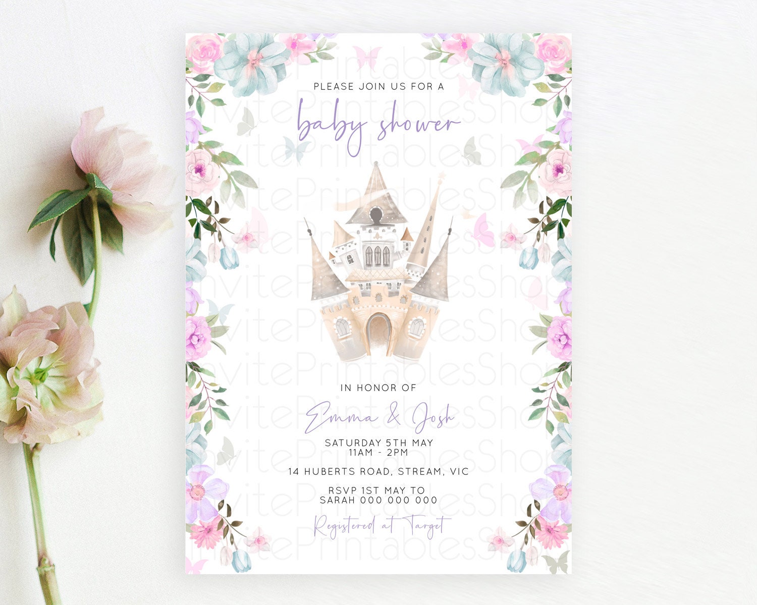 Pastel Princess Baby Shower Invitation Floral Castle Invitation Royal Baby Invite Enchanted Castle Pastel Flower Garden Baby Shower D10471