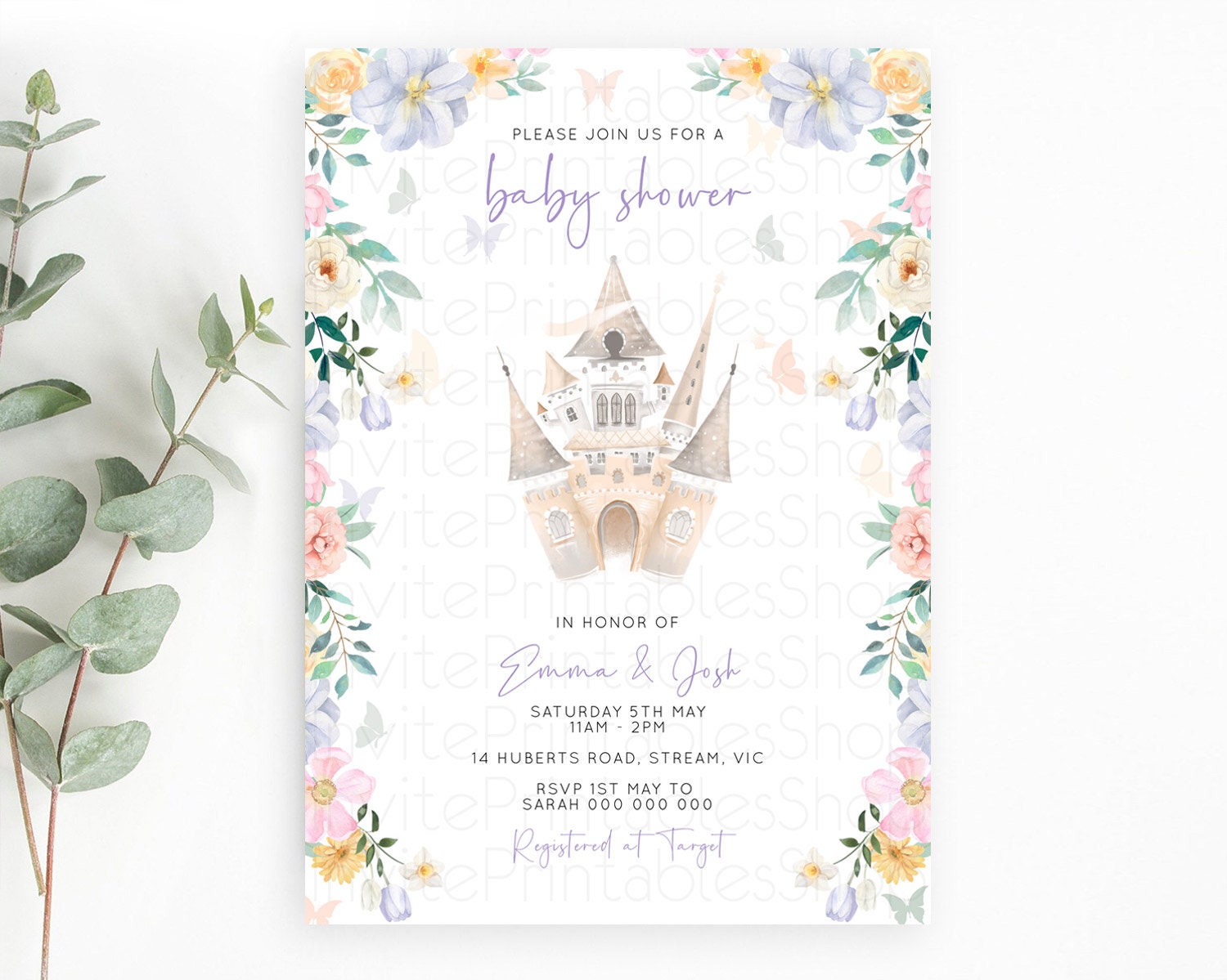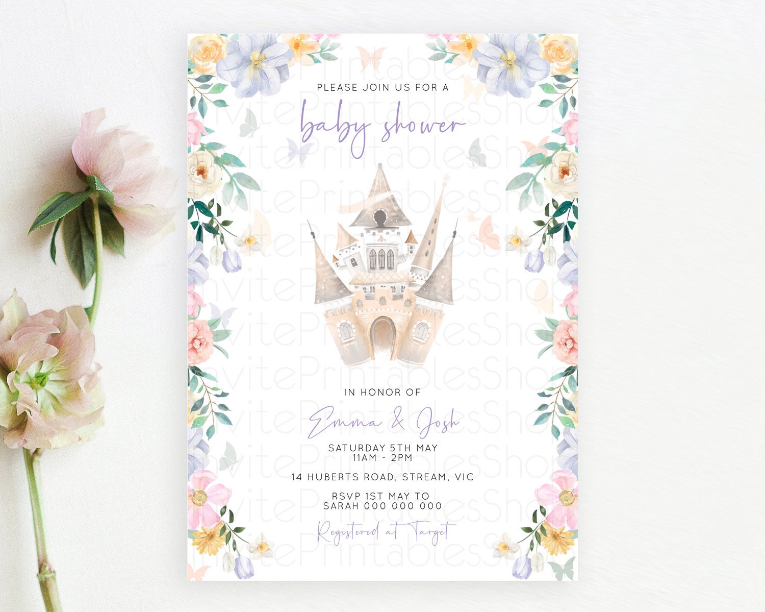 Pastel Princess Baby Shower Invitation Floral Castle Invitation Royal Baby Invite Enchanted Castle Pastel Flower Garden Baby Shower D10473