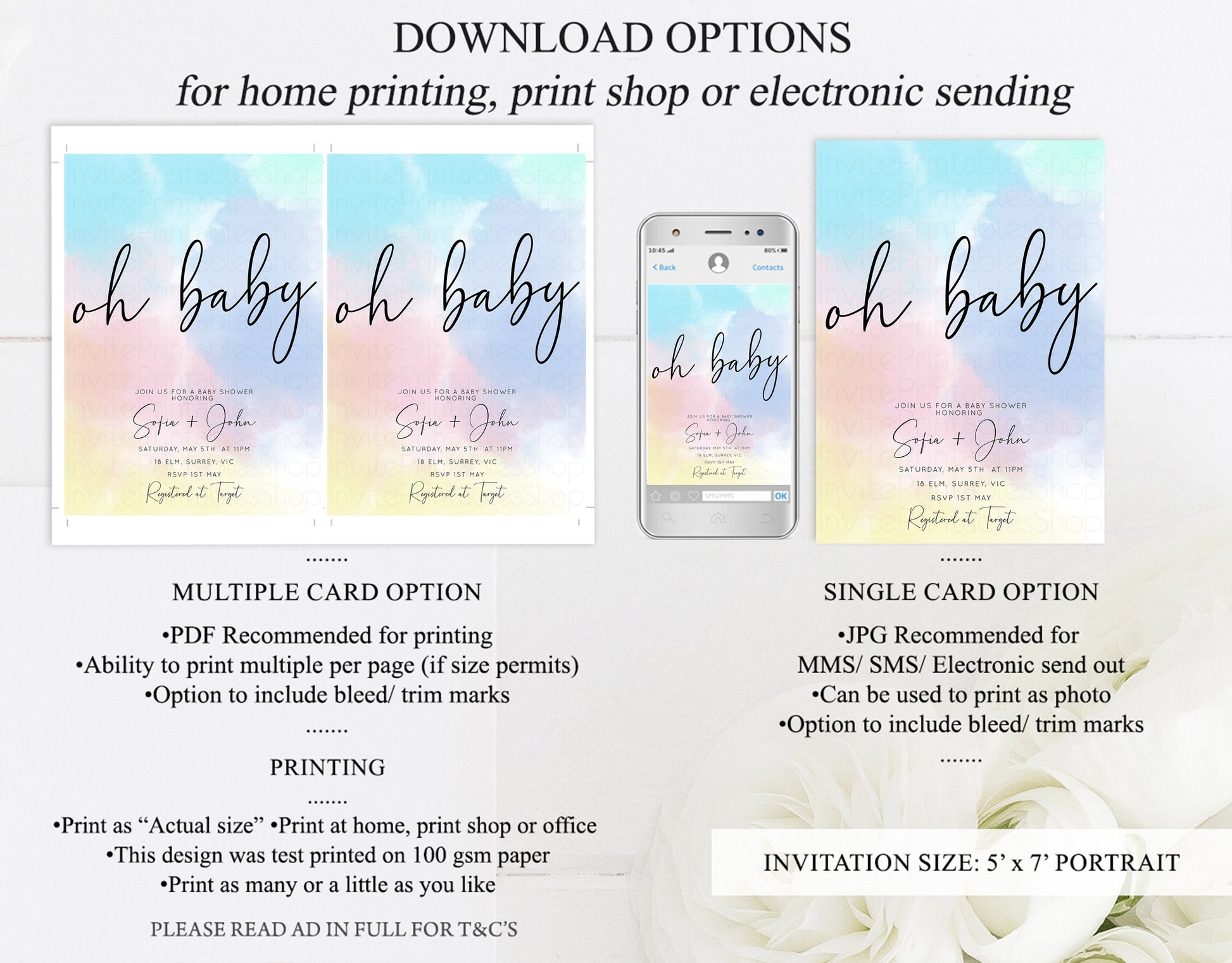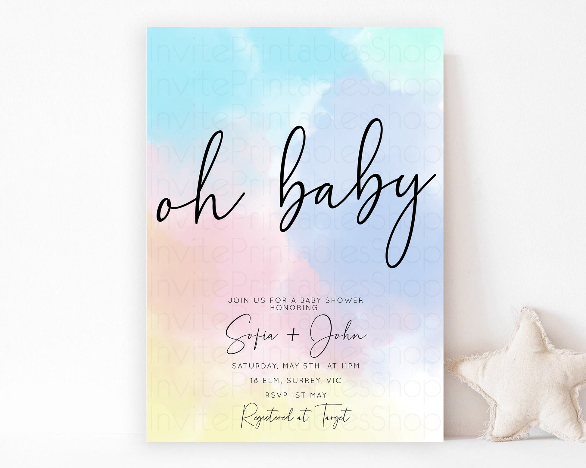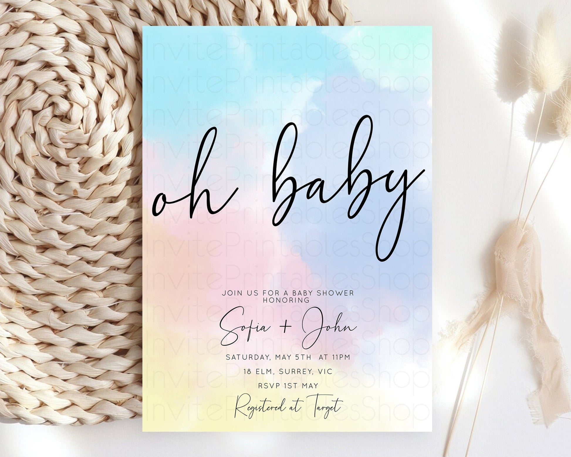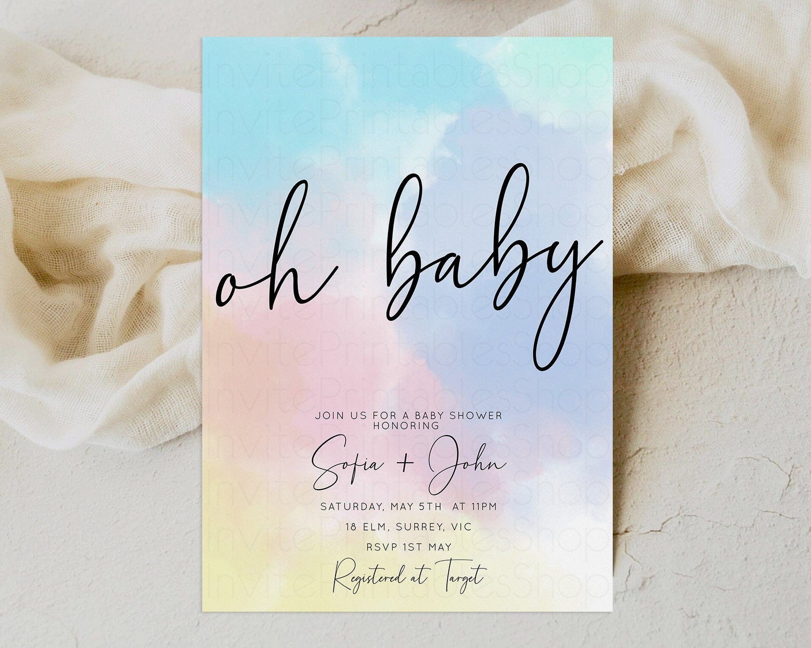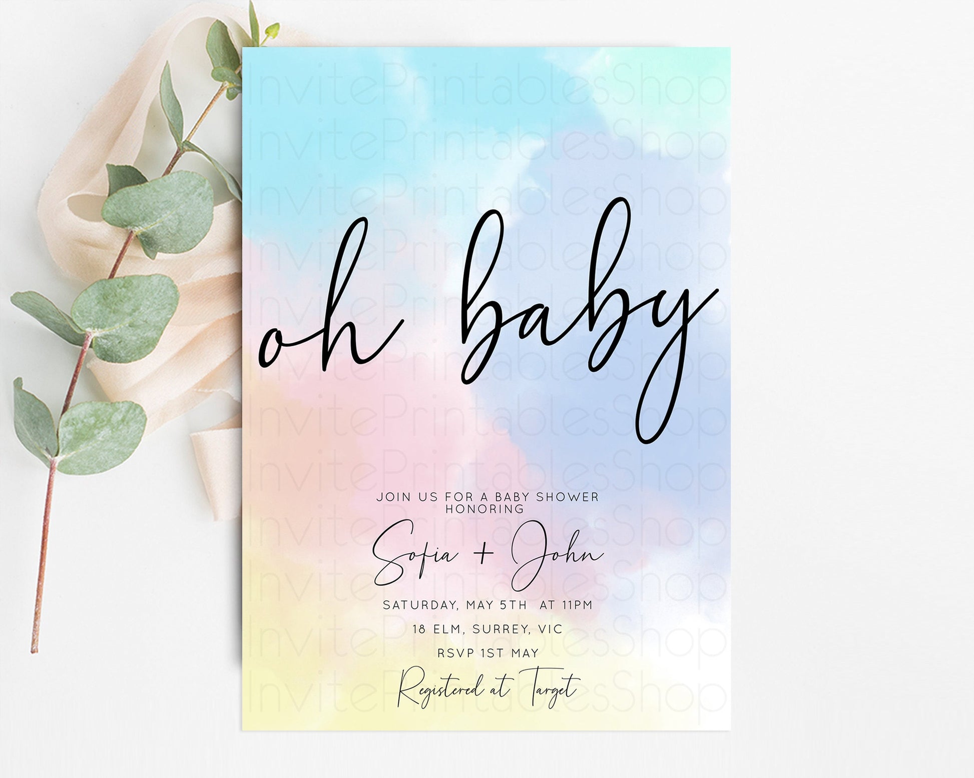 Pastel Rainbow Baby Shower Invitation Colorful Watercolor Invite Ink Splash Blue Yellow Pink Purple Gender Neutral 446