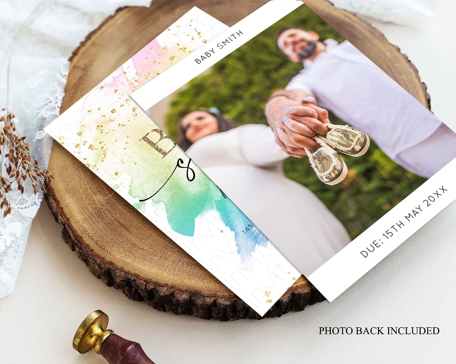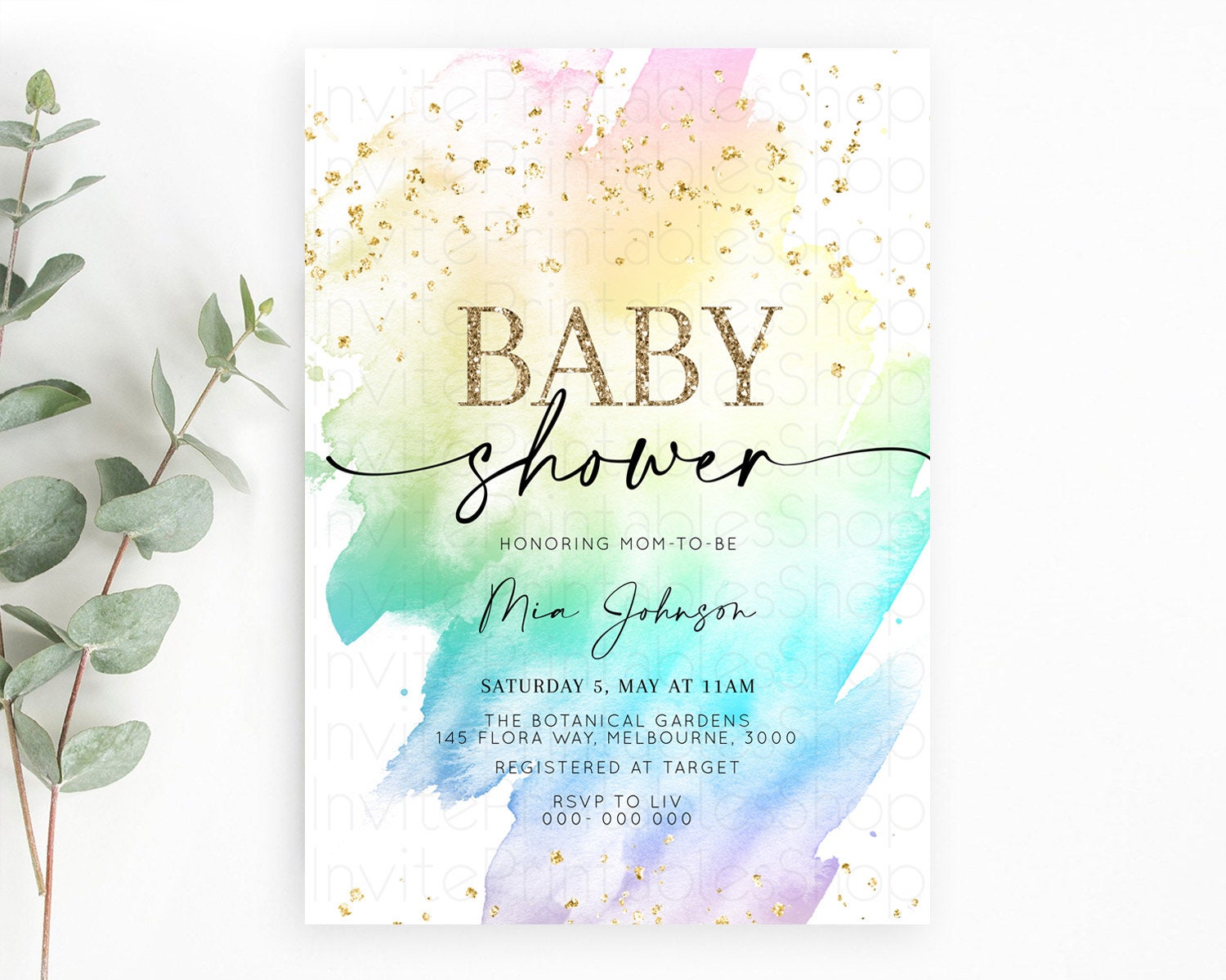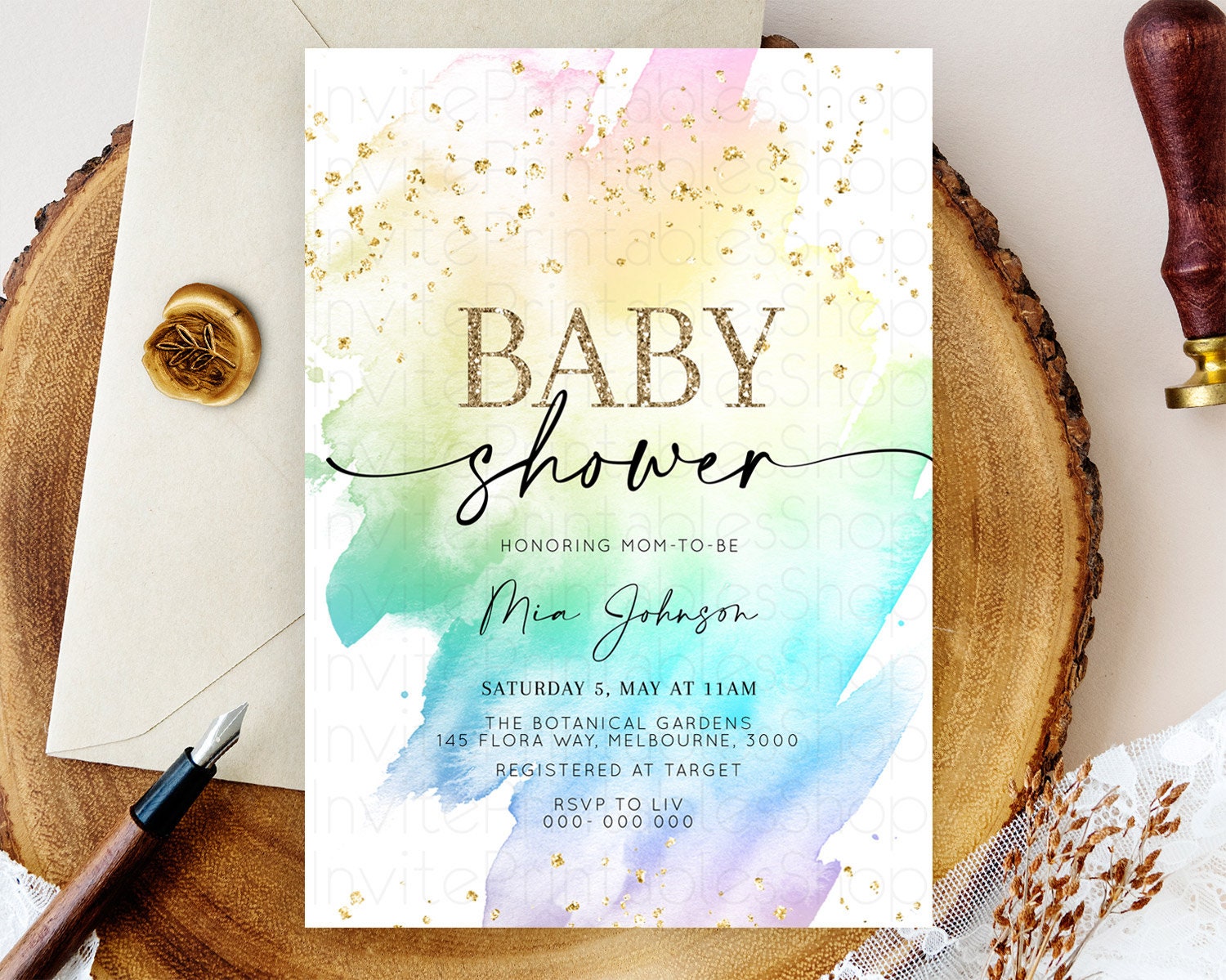 Pastel Rainbow Baby Shower Invitation, Colorful Watercolor Splash, Gold Glitter Confetti Sprinkles, Ombre Pink, Yellow, Blue, Purple D11028