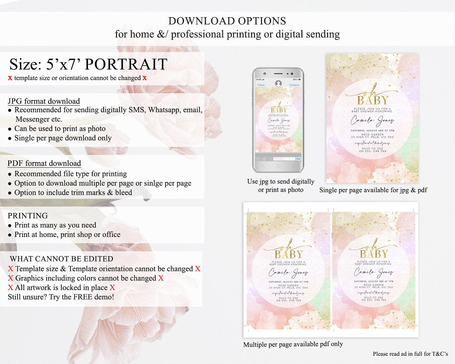 Pastel Rainbow Baby Shower Invitation, Colorful Watercolor with Gold Glitter Sprinkles and Ombre Clouds in Pink, Gold, and Green D10627