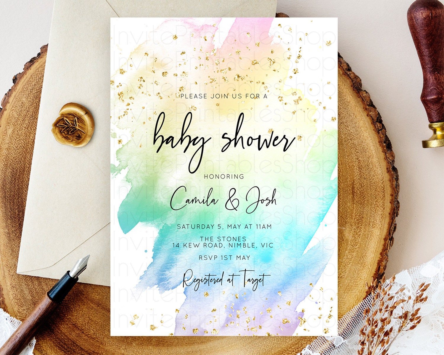 Pastel Rainbow Baby Shower Invitation, Colorful Watercolor with Gold Glitter Sprinkles Ombre Effect Pink, Yellow, Blue, Green, Purple D10256