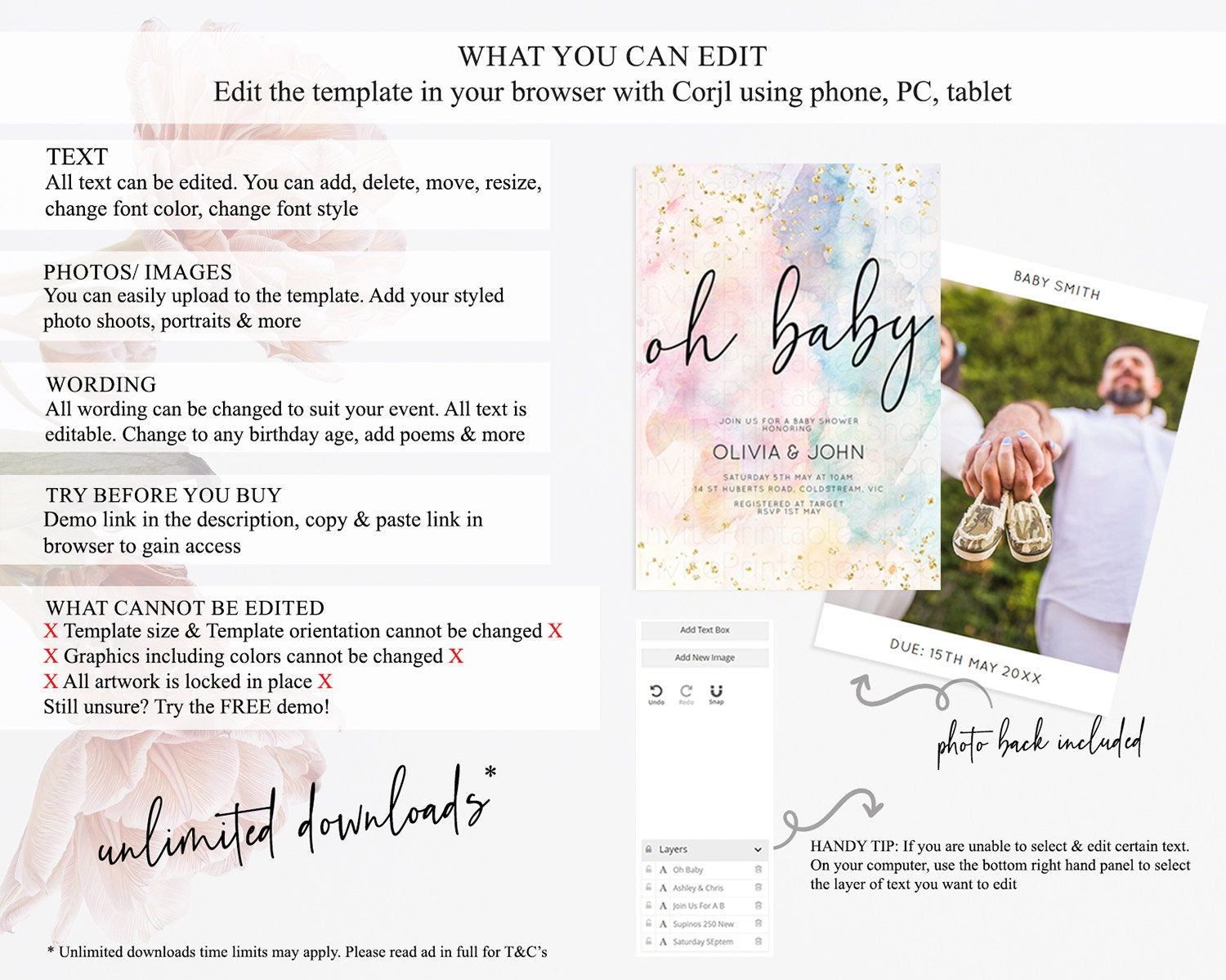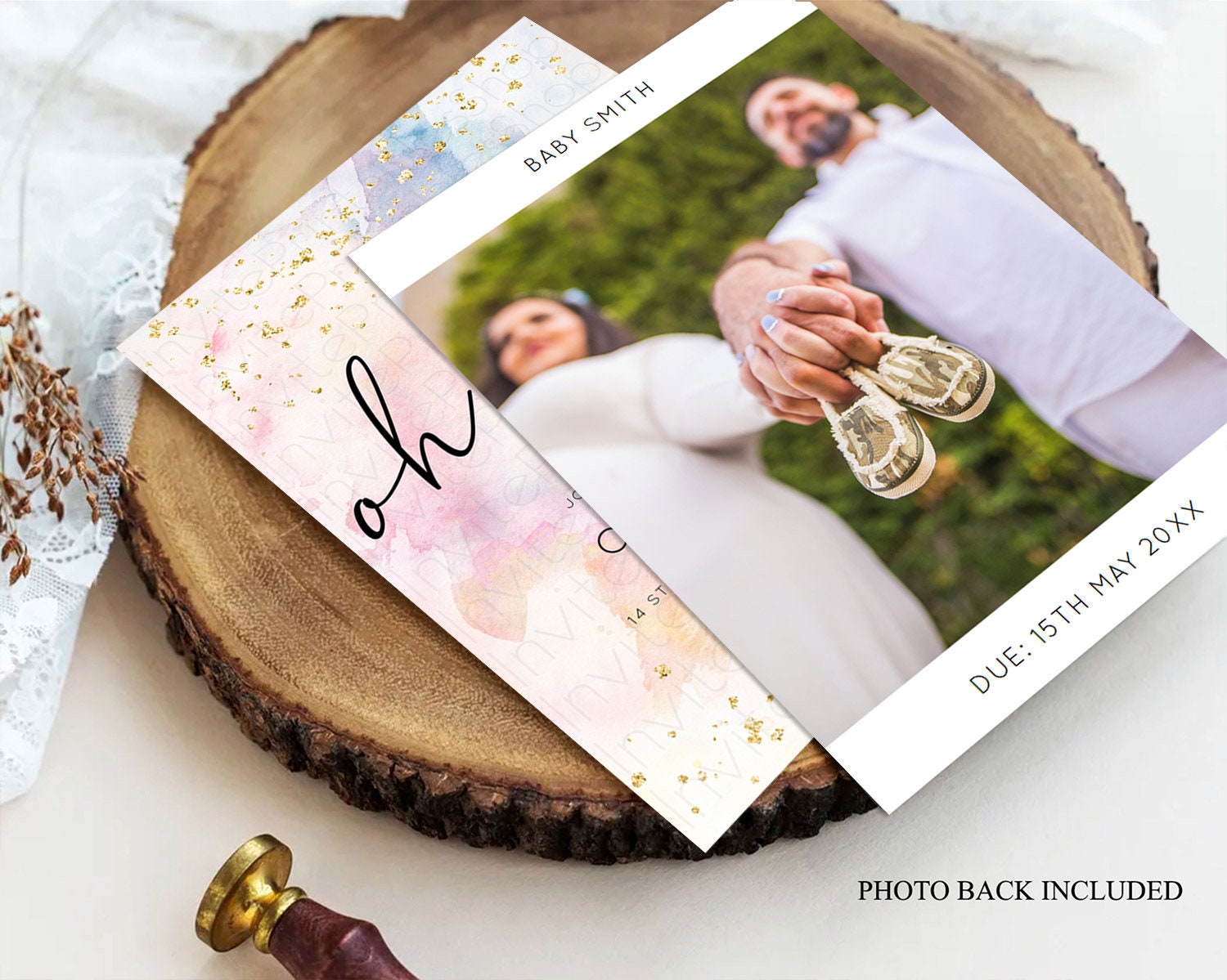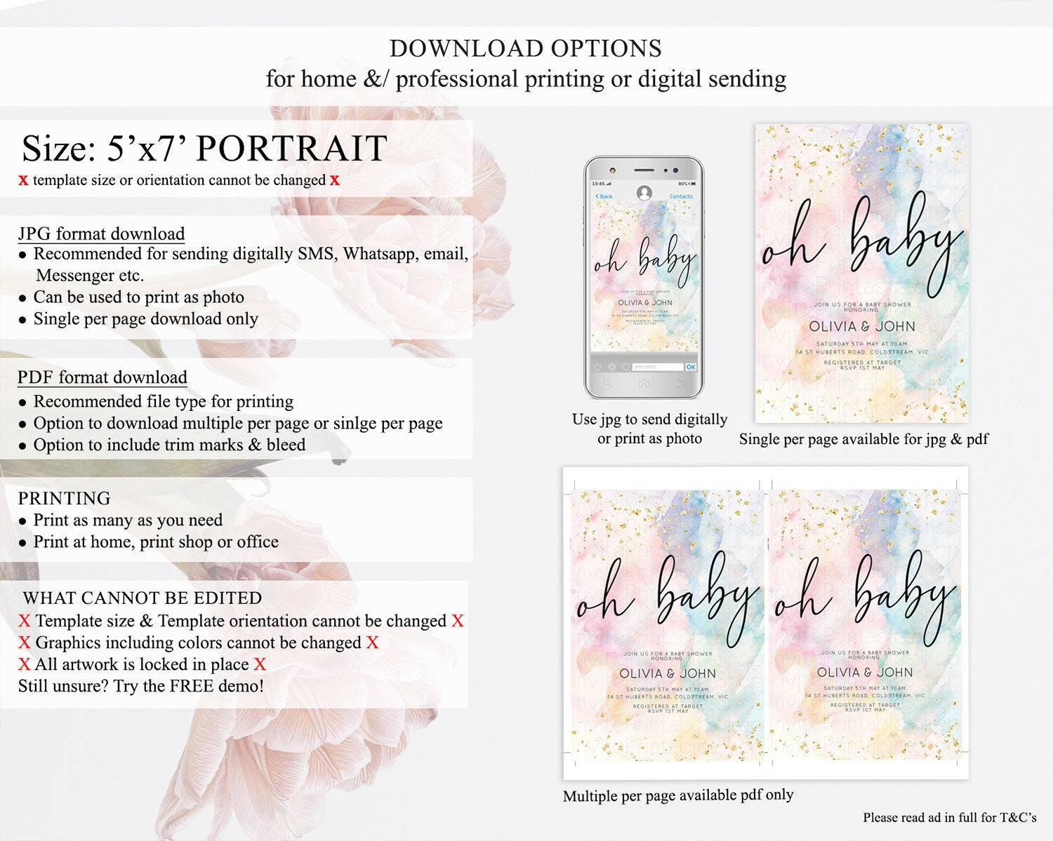 Pastel Rainbow Baby Shower Invitation, Colorful Watercolor with Gold Glitter Sprinkles, Pink, Blue, Yellow Ombre Splash Gender Reveal D10263
