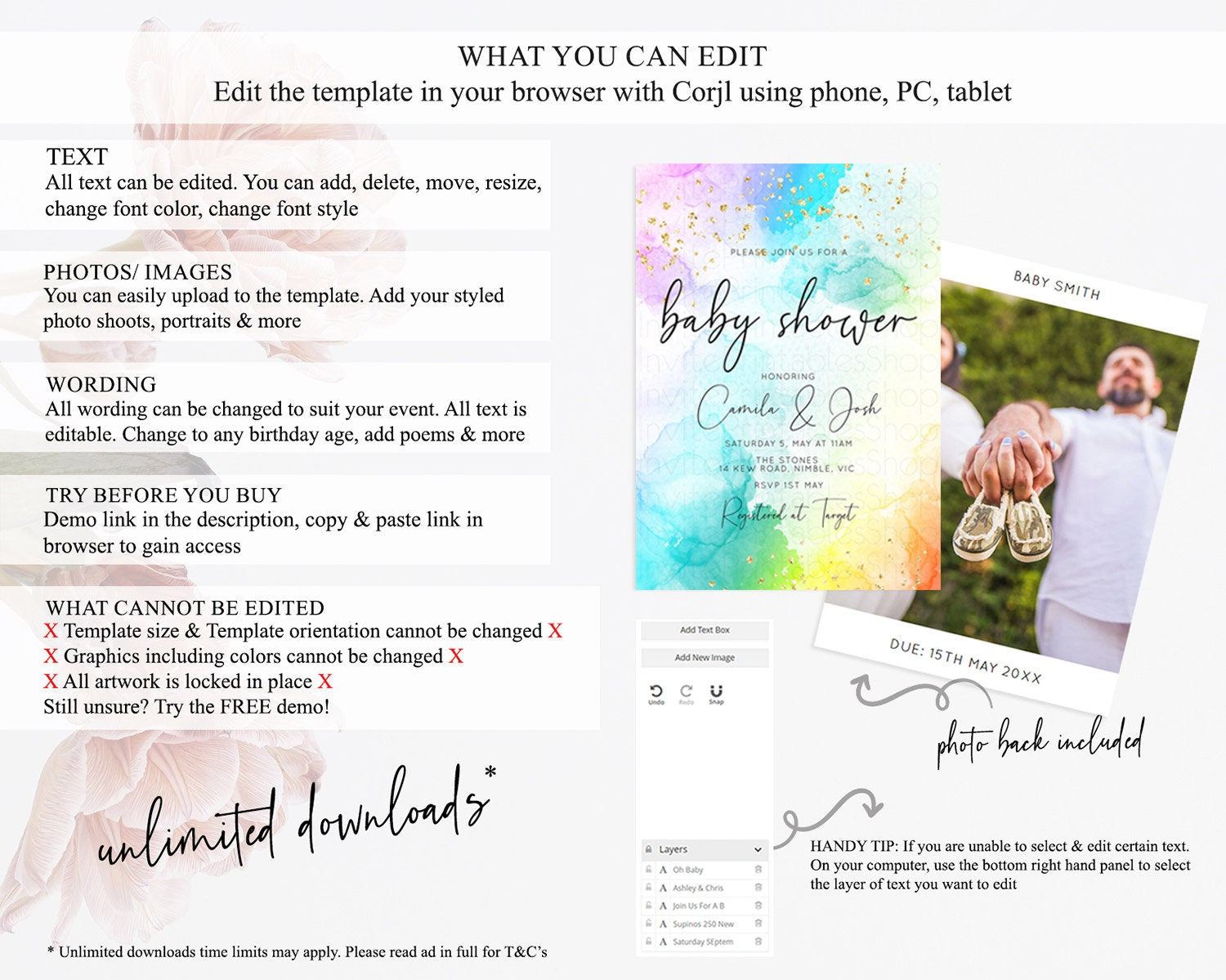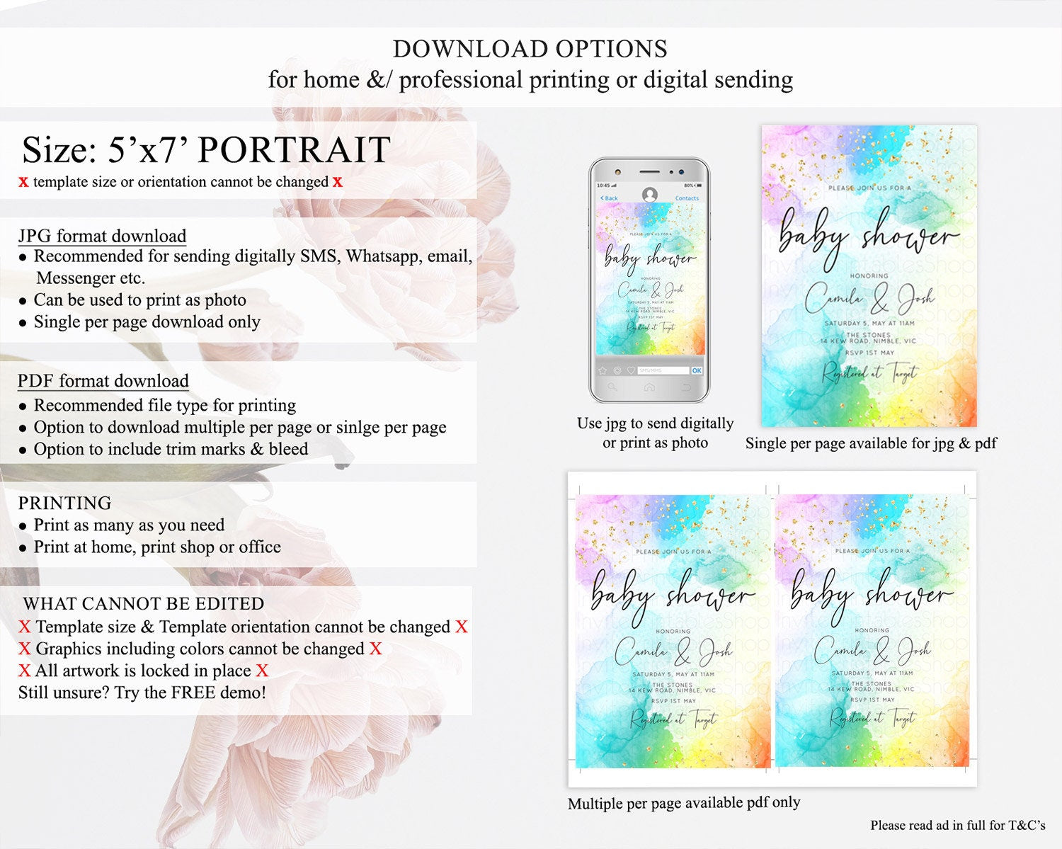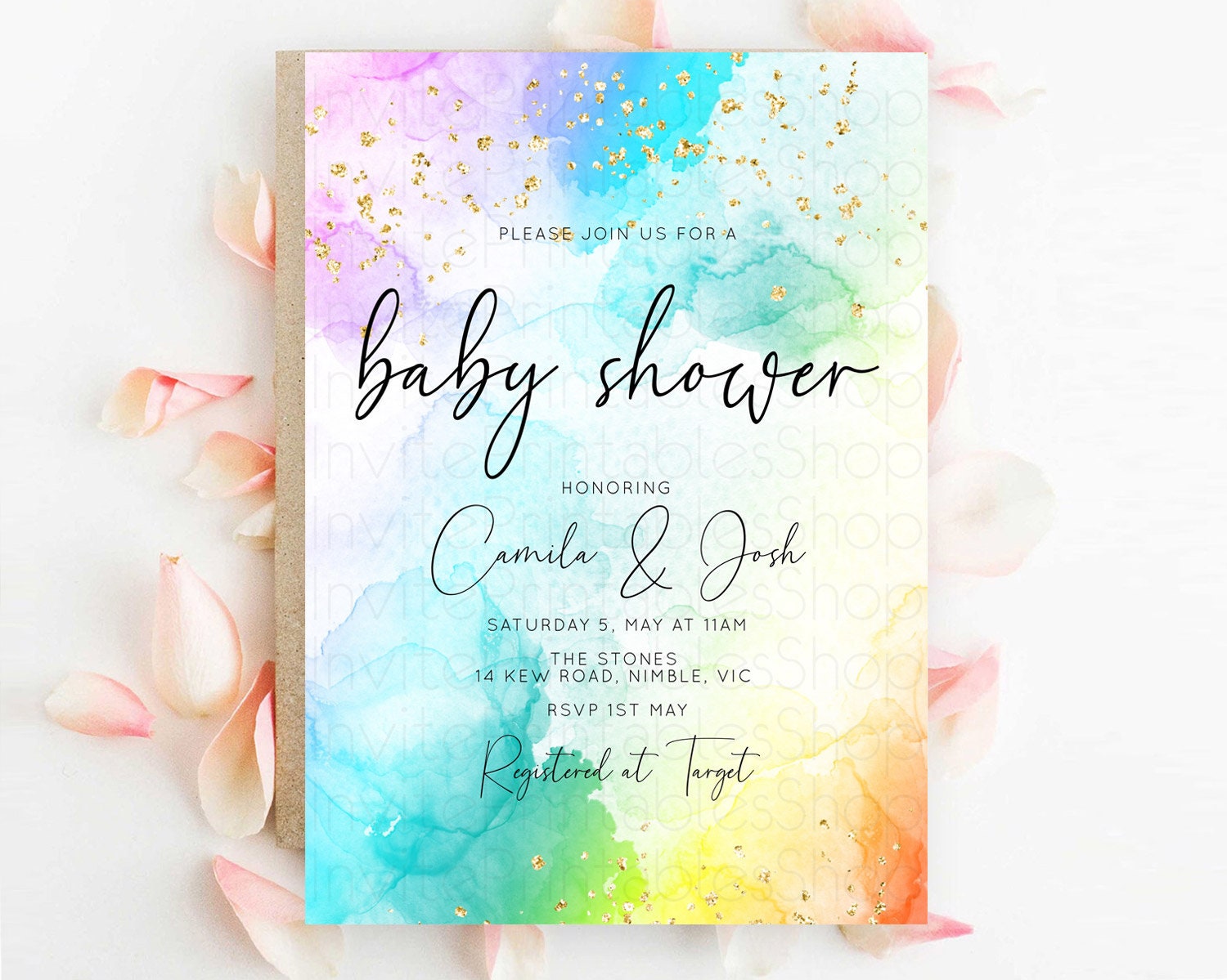 Pastel Rainbow Baby Shower Invitation, Gold Glitter and Colorful Ombre Watercolor, Blue, Purple, Orange, Yellow, Clouds Gender Reveal D10771
