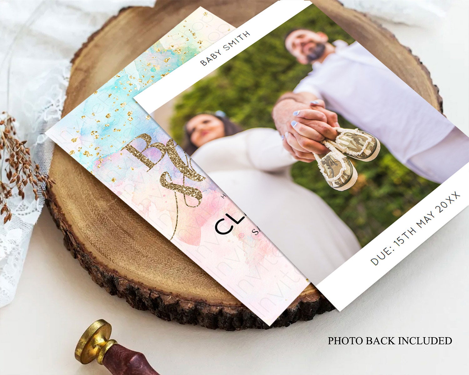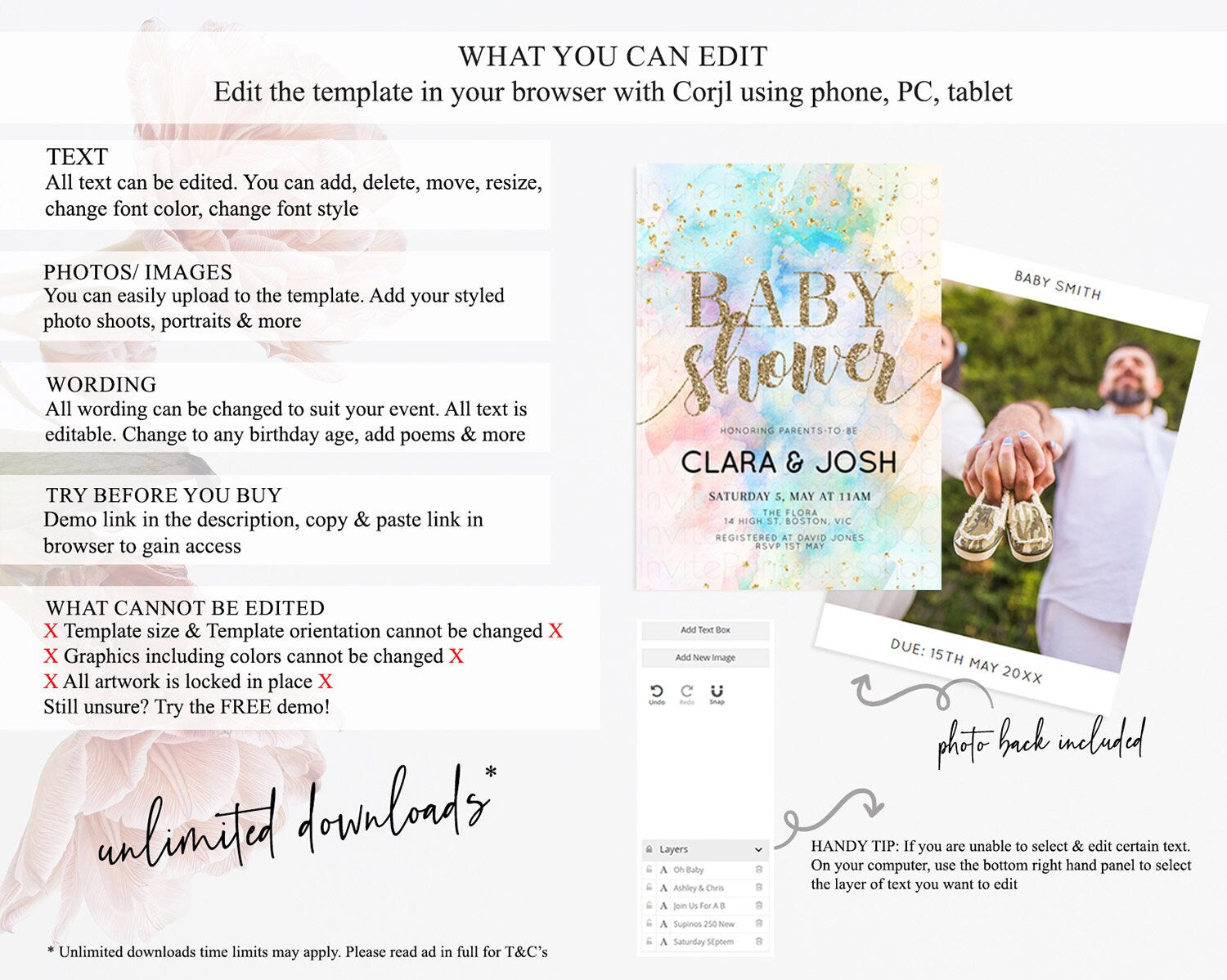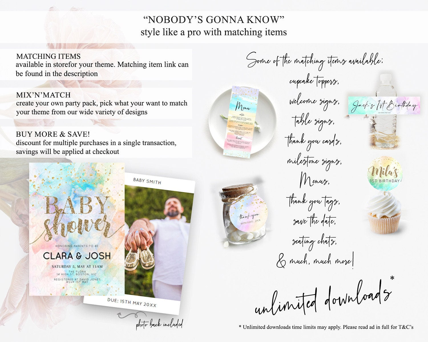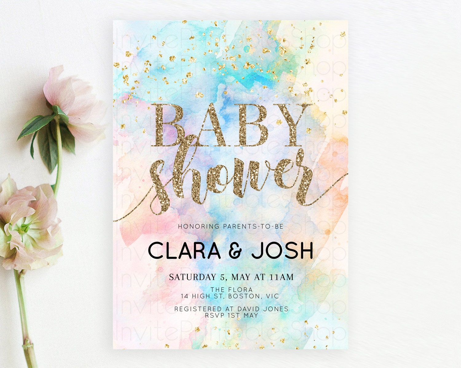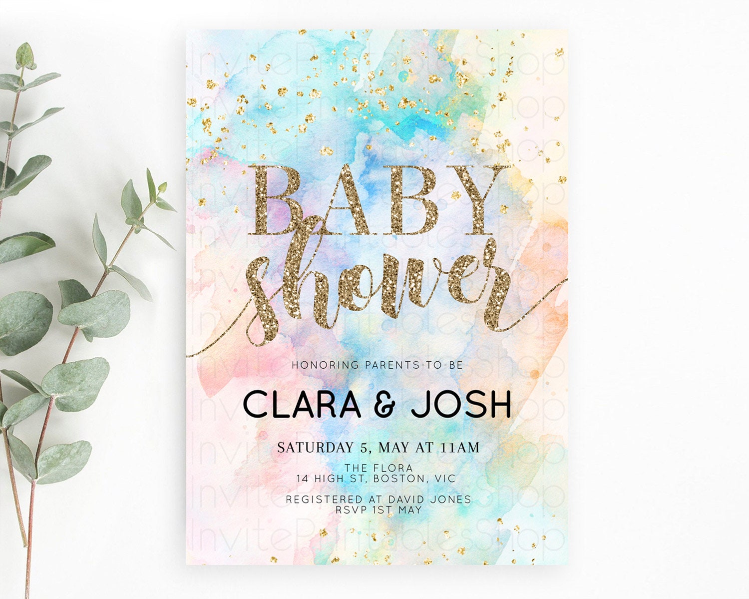 Pastel Rainbow Baby Shower Invitation, Pastel Watercolor, Colorful Ombre Splash with Gold Glitter - Teal Blue, Orange, Yellow Pink D10261