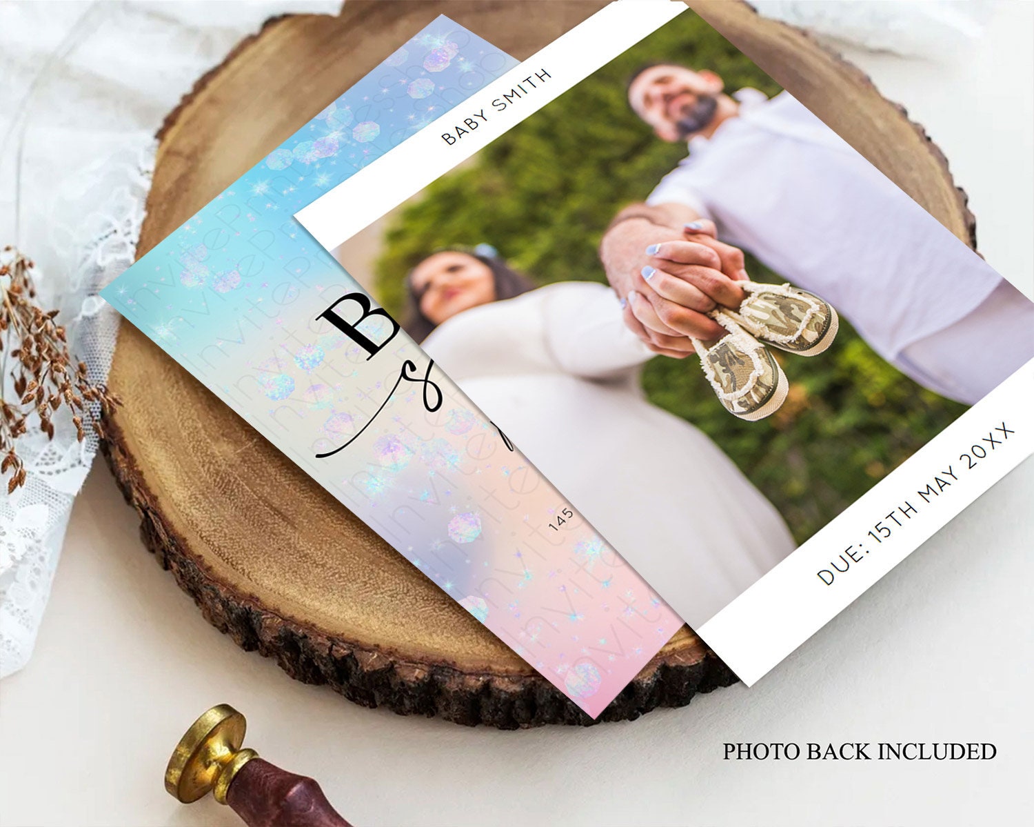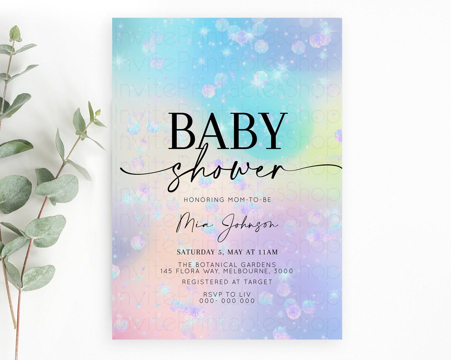 Pastel Rainbow Baby Shower Invitation, Pastel Watercolor with Iridescent Confetti Sprinkles - Colorful Invite Blue, Purple, Yellow D10665