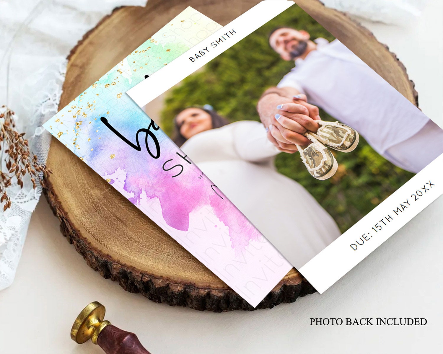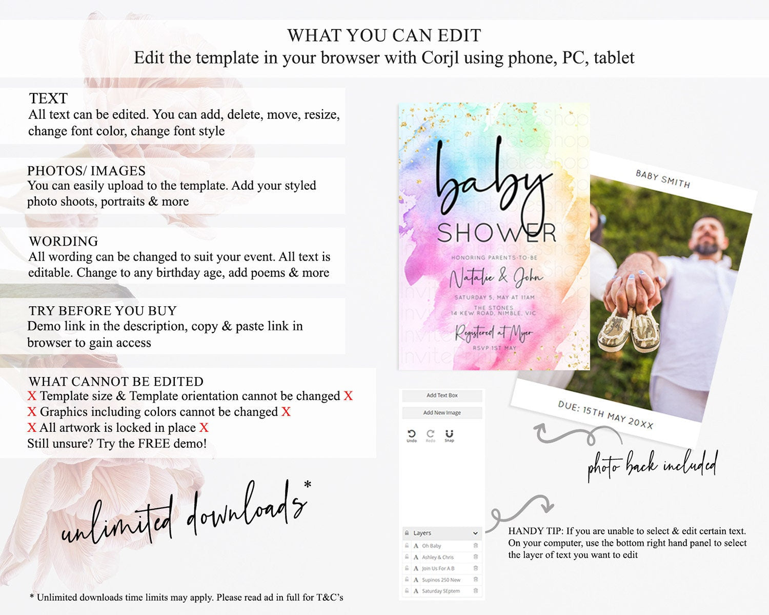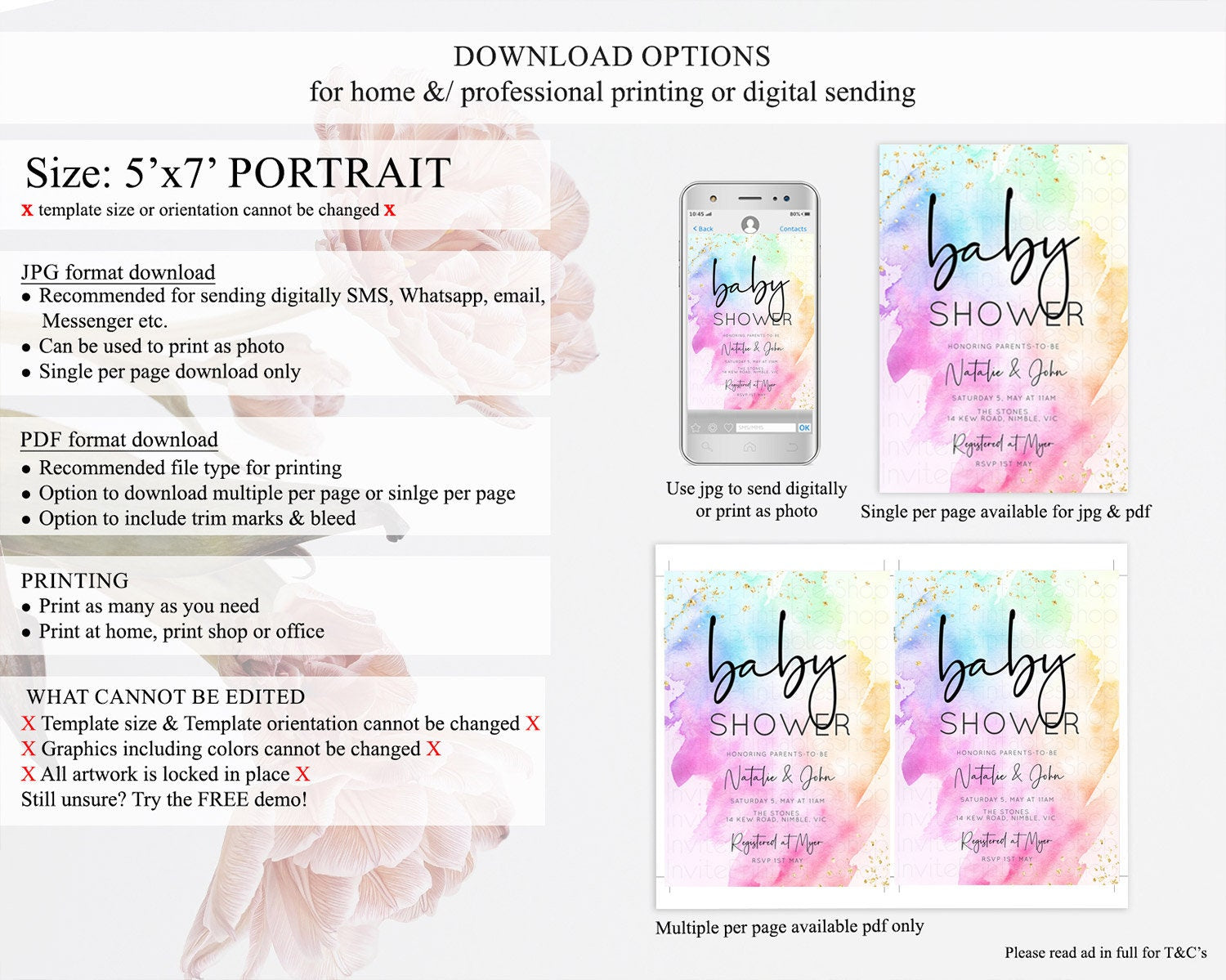 Pastel Rainbow Baby Shower Invitation, Watercolor Splash, Gold Confetti Sprinkles, Colorful Ombre Pink, Yellow, Green, Orange D10449