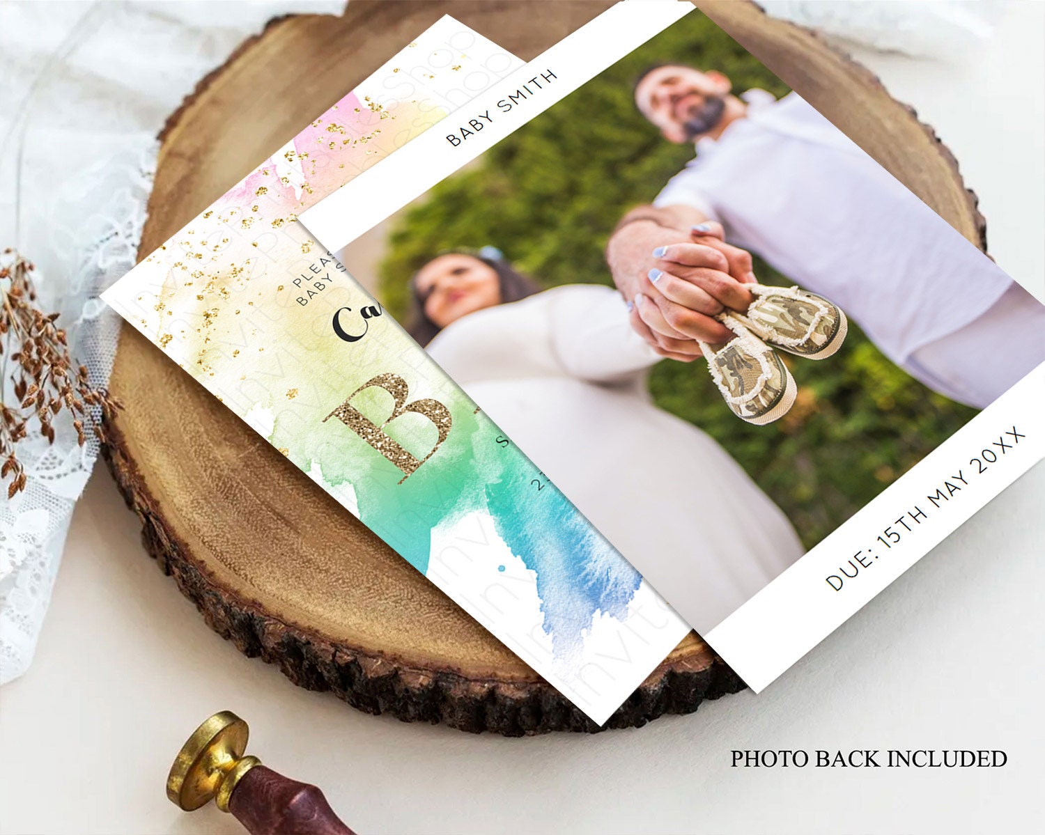 Pastel Rainbow Baby Shower Invitation with Gold Glitter Sprinkles, Colorful Watercolor Ombre Theme in Pink, Yellow, Blue, and Purple D10256