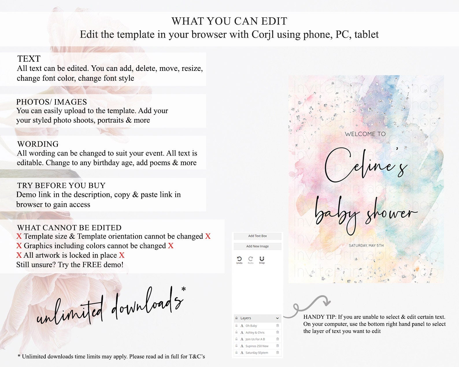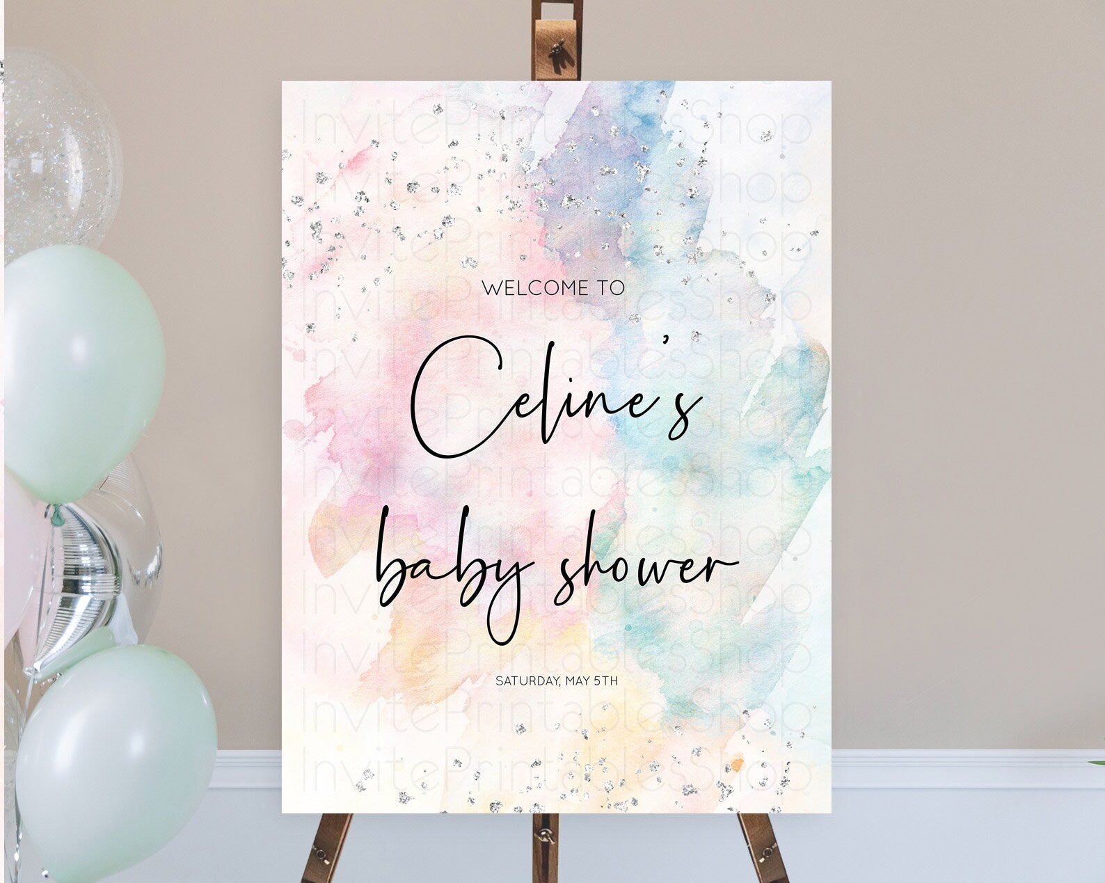 Pastel Rainbow Baby Shower Welcome Sign Pastel Welcome Board Pastel Colorful Party Poster Confetti Watercolor Silver Welcome Sign D10945
