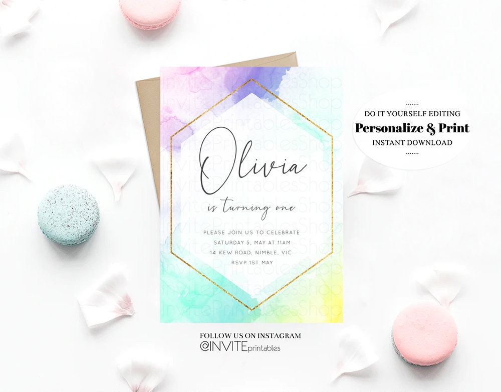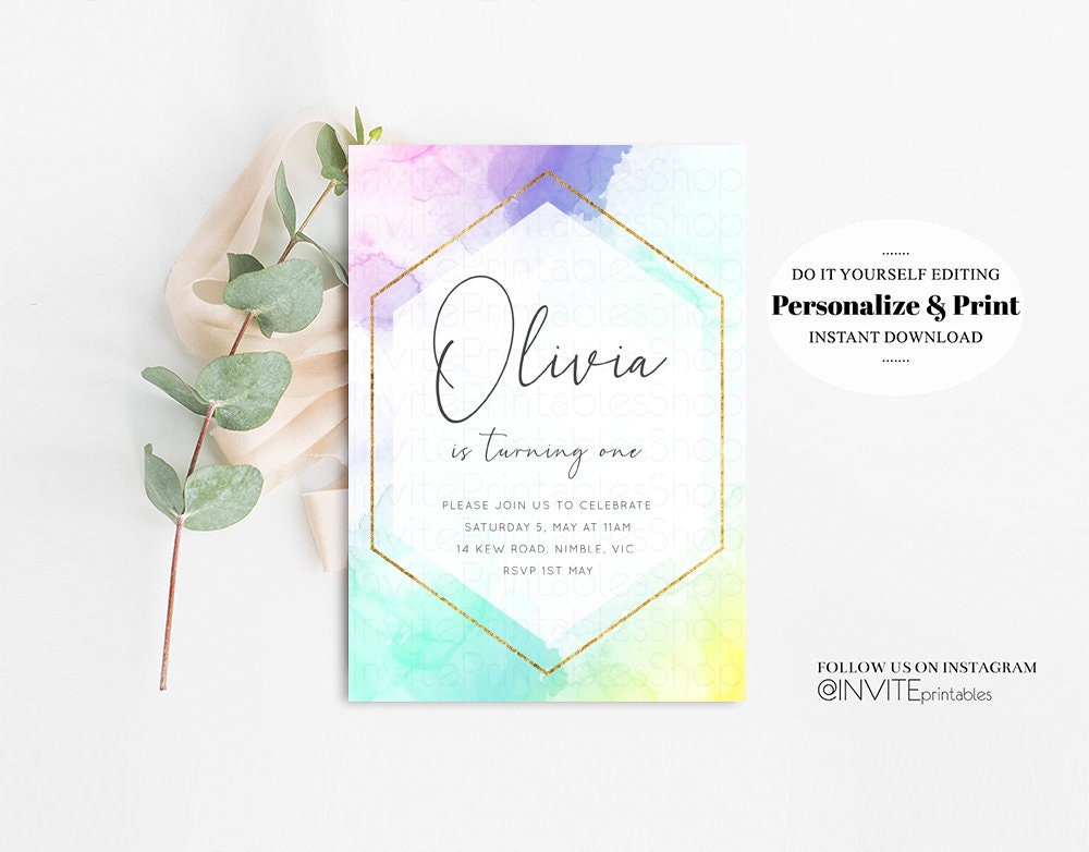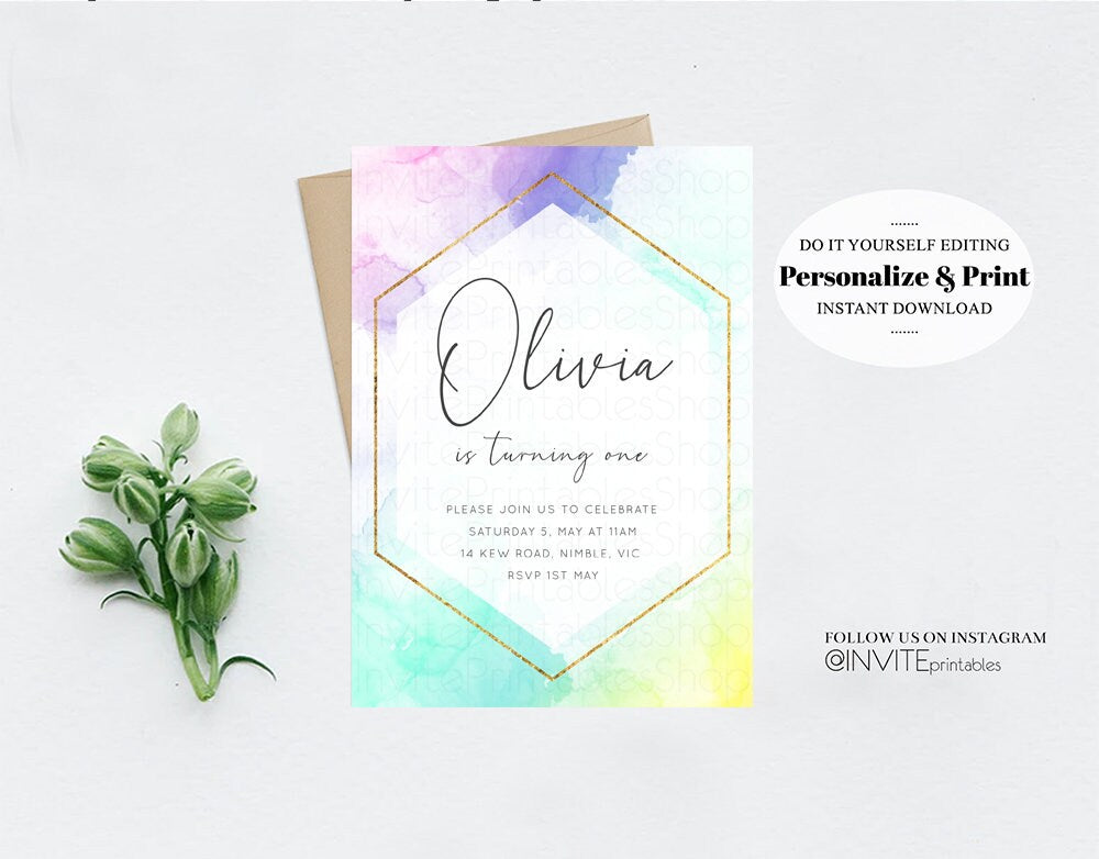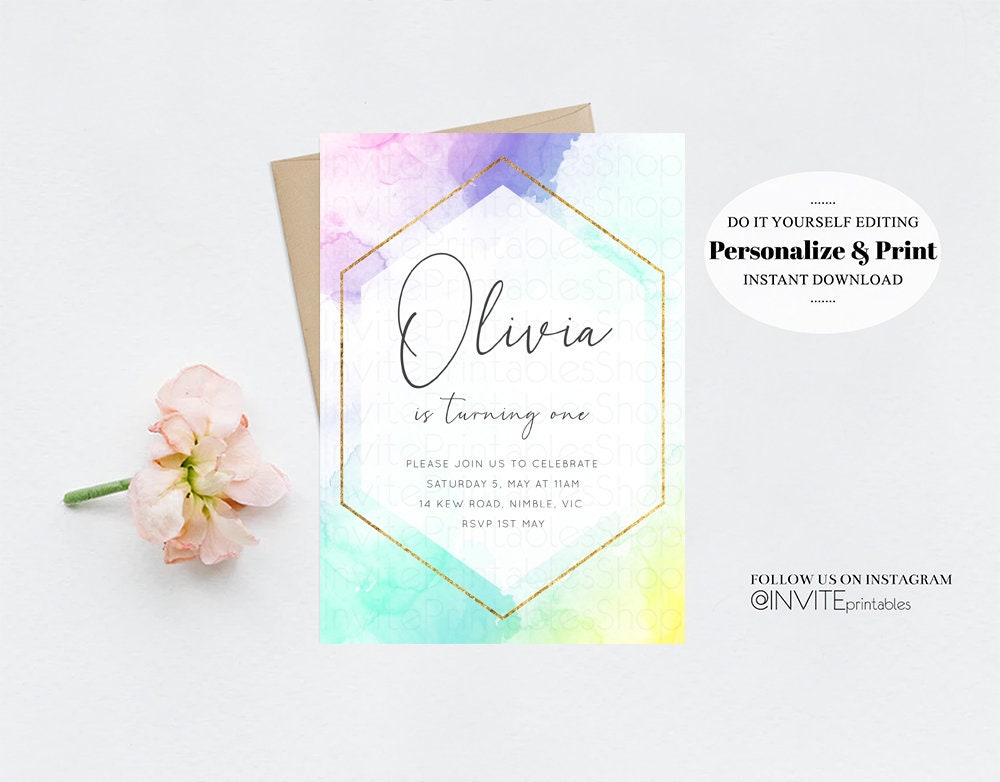 Pastel Rainbow Birthday Invitation Colorful Watercolor Splash Ombre Ink Paint Gold Foil Purple Pink Blue Custom Printable