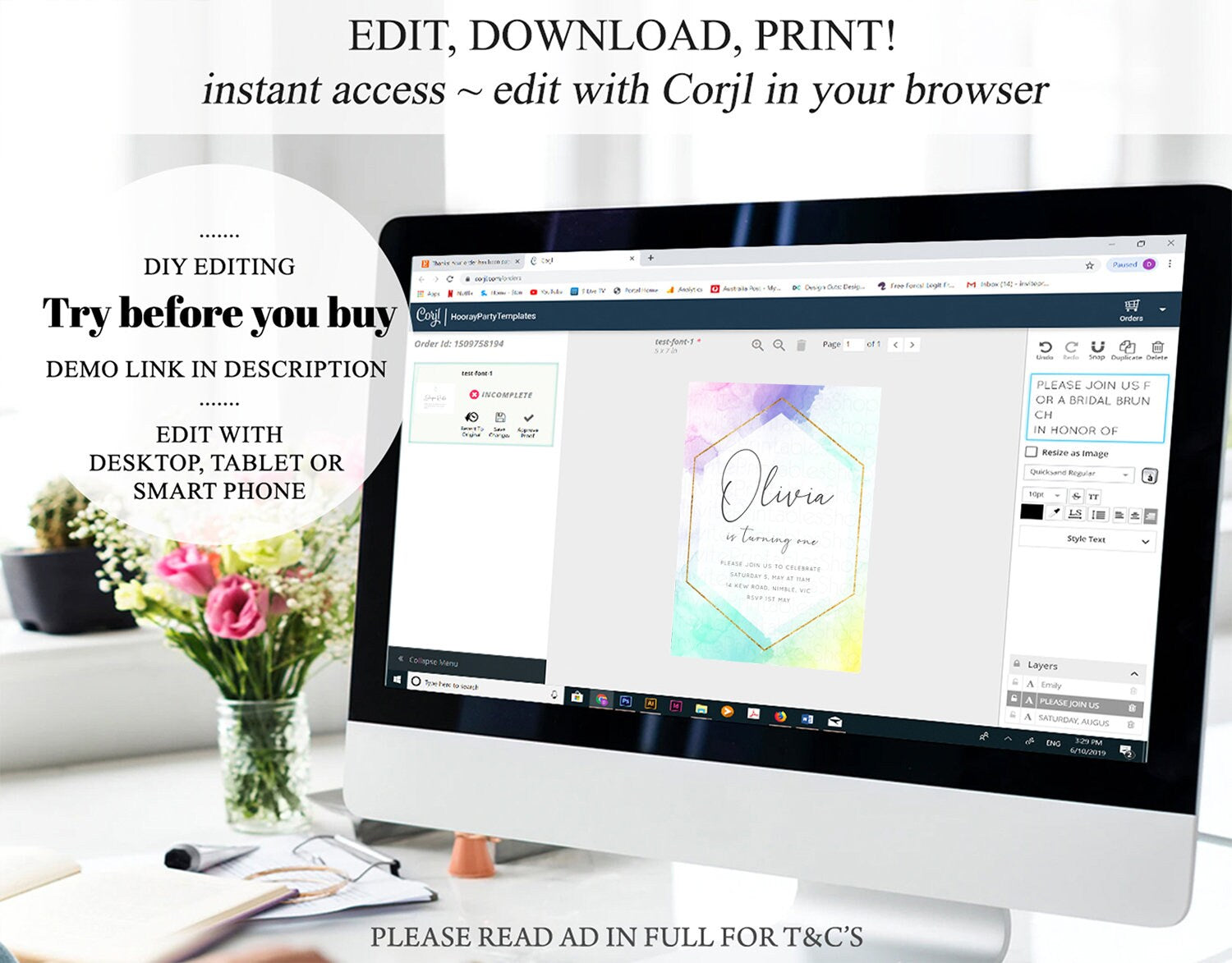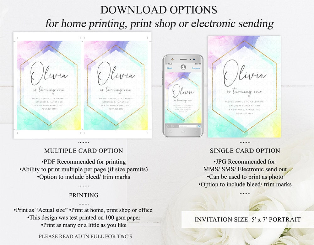 •Try before you buy! • DEMO LINK- https://www.corjl.com/d/3486JA PLEASE READ AD IN FULL!! •Digital file. No physical item will be shipped •Do it yourself Editing. Edit online with Corjl or Edit with your mobile ITEM DETAILS Invitation size: 5’x7’ File type: PDF, JPEG Resolution: 300DPI PDF FILE OPTIONS: •Recommended for printing •Ability to print multiple per page (if size permits) •Option to include bleed/ trim marks JPG FILE OPTIONS: •Recommended for MMS/ SMS/ Electronic send out •Can be used to print as photo •Option to include bleed/ trim marks EDITING • Do it yourself editing • Mobile editing is available • Google chrome is the recommend browser for Corjl. Please download here for FREE: https://www.google.com/chrome/ • Using other browsers may not show all of Corjl's editing features • Editing on a desktop/ laptop computer is recommended to access all of Corjl features • Mobile editing is available, please use a desktop/ laptop computer to access all of Corjl features DOWNLOADS & EXPIRY •Maximum 3 downloads on the same edit •Link expires 30 days after purchase DOWNLOAD NOTICE •Once you have reached your download limits &/ “approve proof” in Corjl. You will not be able to request further downloads on your design. Further download requests are not permitted WHAT IS EDITABLE •Text - colours, fonts, size, move, delete & rotation. •Please see demo link for what you can and can’t do WHAT YOU CAN’T EDIT •Template size •Template orientation •Graphics CAN NOT BE deleted, moved, or changed in colour •Please see demo link for what you can and can’t do HOW TO 1. Choose design template & checkout on Etsy. 2. Email will be sent from Corjl. Follow link to access template 3. Edit, save & print INSTRUCTIONS •Instructions on how to edit your design have been written by Corjl and will be available with your purchase. PRINTING •Colours can vary depending on the monitor, printer & cardstock •Can be printed at home •Home printing will require you to select the high quality print settings, select appropriate paper thickness & click "Actual size" prior to you printing •This design was test printed on 100 gsm paper •Can be printed at local print shop. Please check printing requirements & any printing restrictions prior to purchase PERSONAL USE ONLY. This item cannot be shared, re-sold, or used commercially for profit. REFUND POLICY •We are unable to provide a refund/ exchange on commenced & completed work, instant downloads or self-editing link templates. Please use the demo link to work out if this product is right for you. Copyright © 2018 by InvitePrintablesShop PTY LTD All rights reserved. This file or any portion thereof may not be reproduced or resold without the express written permission of the publisher (including edits to the design). Our files are provided as high-resolution PDFs – the end result is dependent upon the printer and paper used. If using a professional printing company, InvitePrintablesShop are not responsible for their specific printing requirements, paper or colour quality. Any changes required to the template are not included with your purchase – the files come as described in the listing only and cannot be changed. Thank you for visiting Invite Printables Shop:)