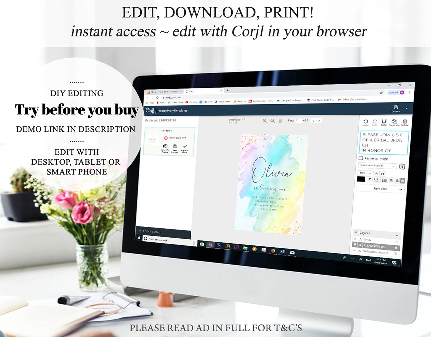•Try before you buy! • DEMO LINK- https://www.corjl.com/d/J027K Matching items: https://etsy.me/3zpGEuH PLEASE READ AD IN FULL!! •Digital file. No physical item will be shipped •Do it yourself Editing. Edit online with Corjl or Edit with your mobile ITEM DETAILS Invitation size: 5’x7’ File type: PDF, JPEG Resolution: 300DPI PDF FILE OPTIONS: •Recommended for printing •Ability to print multiple per page (if size permits) •Option to include bleed/ trim marks JPG FILE OPTIONS: •Recommended for MMS/ SMS/ Electronic send out •Can be used to print as photo •Option to include bleed/ trim marks EDITING • Do it yourself editing • Mobile editing is available • Google chrome is the recommend browser for Corjl. Please download here for FREE: https://www.google.com/chrome/ • Using other browsers may not show all of Corjl's editing features • Editing on a desktop/ laptop computer is recommended to access all of Corjl features • Mobile editing is available, please use a desktop/ laptop computer to access all of Corjl features DOWNLOADS & EXPIRY •Maximum 3 downloads on the same edit •Link expires 30 days after purchase DOWNLOAD NOTICE •Once you have reached your download limits &/ “approve proof” in Corjl. You will not be able to request further downloads on your design. Further download requests are not permitted WHAT IS EDITABLE •Text - colours, fonts, size, move, delete & rotation. •Please see demo link for what you can and can’t do WHAT YOU CAN’T EDIT •Template size •Template orientation •Graphics CAN NOT BE deleted, moved, or changed in colour •Please see demo link for what you can and can’t do HOW TO 1. Choose design template & checkout on Etsy. 2. Email will be sent from Corjl. Follow link to access template 3. Edit, save & print INSTRUCTIONS •Instructions on how to edit your design have been written by Corjl and will be available with your purchase. PRINTING •Colours can vary depending on the monitor, printer & cardstock •Can be printed at home •Home printing will require you to select the high quality print settings, select appropriate paper thickness & click "Actual size" prior to you printing •This design was test printed on 100 gsm paper •Can be printed at local print shop. Please check printing requirements & any printing restrictions prior to purchase PERSONAL USE ONLY. This item cannot be shared, re-sold, or used commercially for profit. REFUND POLICY •We are unable to provide a refund/ exchange on commenced & completed work, instant downloads or self-editing link templates. Please use the demo link to work out if this product is right for you. Copyright © 2018 by InvitePrintablesShop PTY LTD All rights reserved. This file or any portion thereof may not be reproduced or resold without the express written permission of the publisher (including edits to the design). Our files are provided as high-resolution PDFs – the end result is dependent upon the printer and paper used. If using a professional printing company, InvitePrintablesShop are not responsible for their specific printing requirements, paper or colour quality. Any changes required to the template are not included with your purchase – the files come as described in the listing only and cannot be changed. Thank you for visiting Invite Printables Shop:)