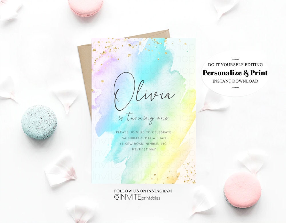 Pastel Rainbow Birthday Invitation Colorful Watercolor Splash Ombre Ink Paint Gold Foil Purple Pink Blue Custom Printable 146