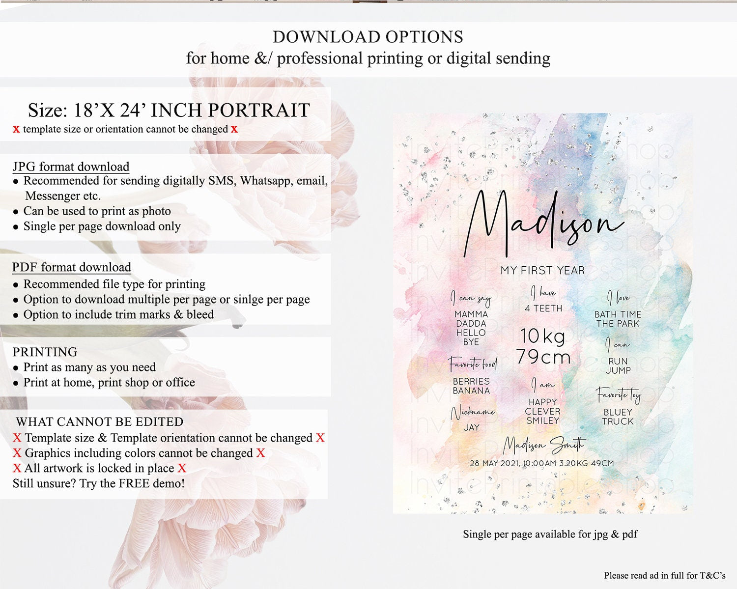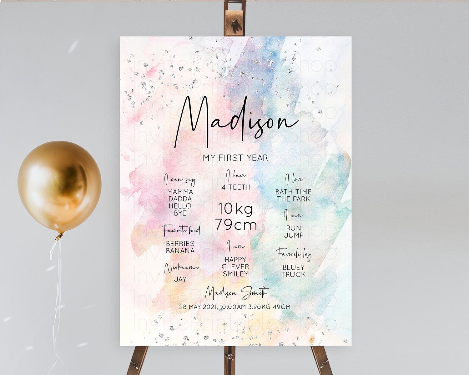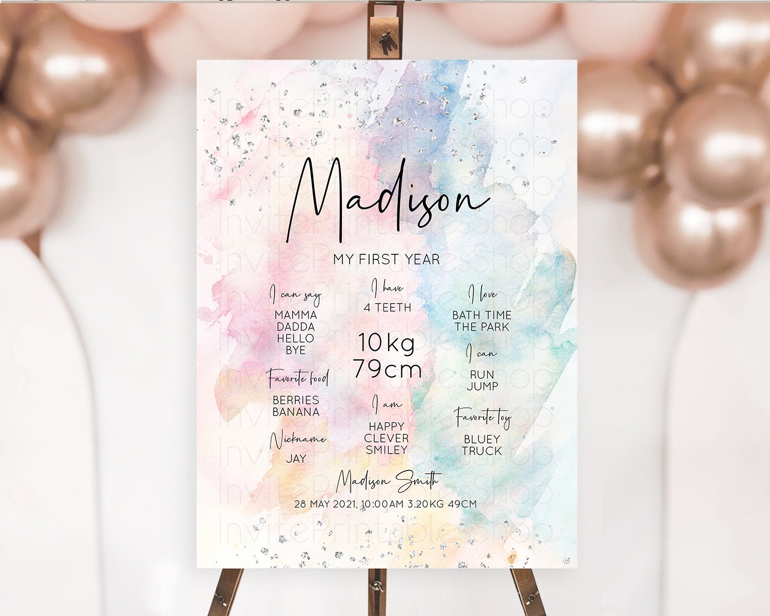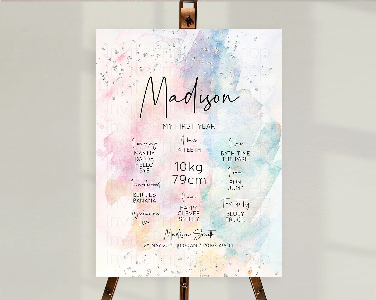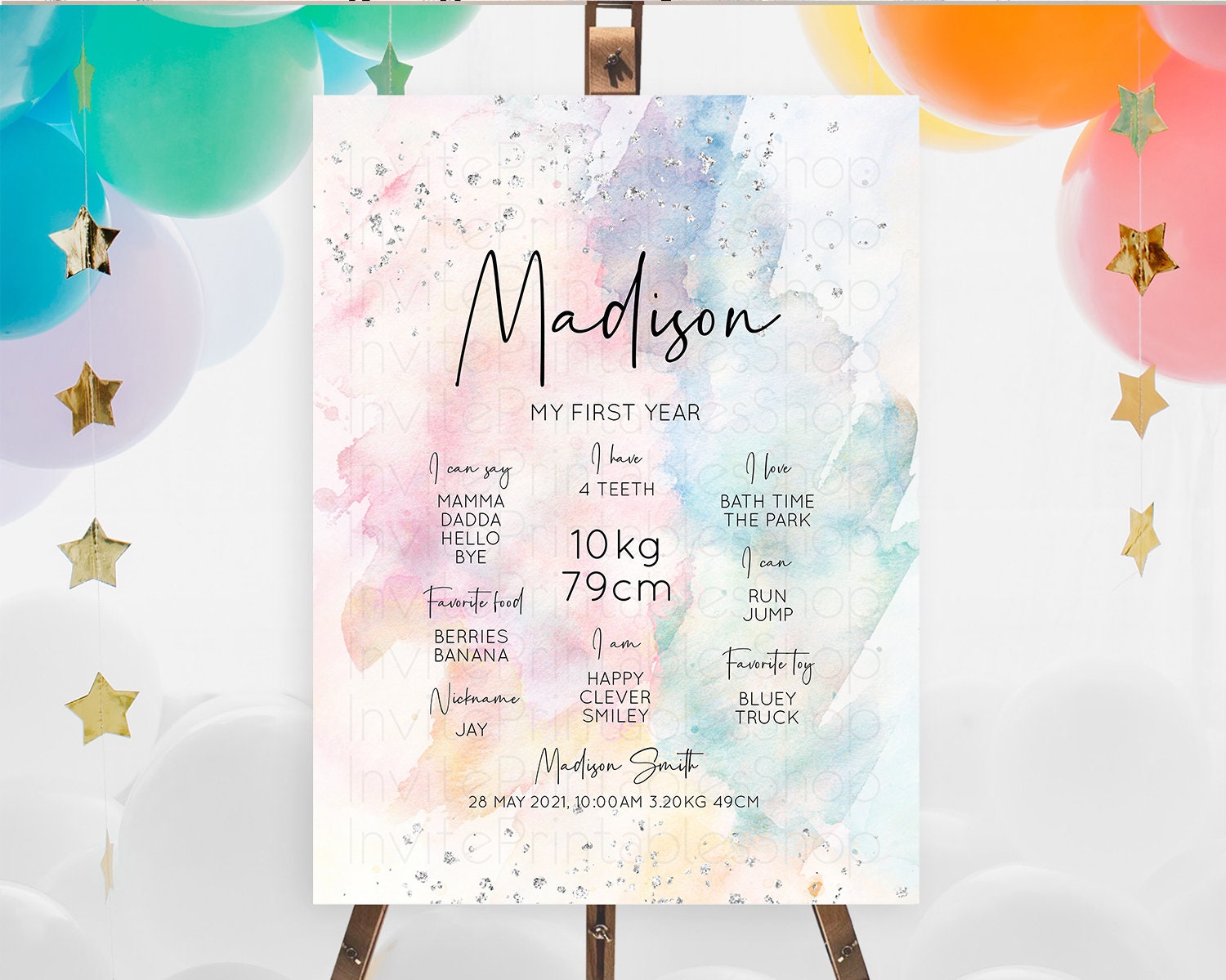 Pastel Rainbow First Birthday Milestone Board Pastel Milestone Poster Colorful Confetti Watercolor Silver 1st Birthday Welcome Sign D10945