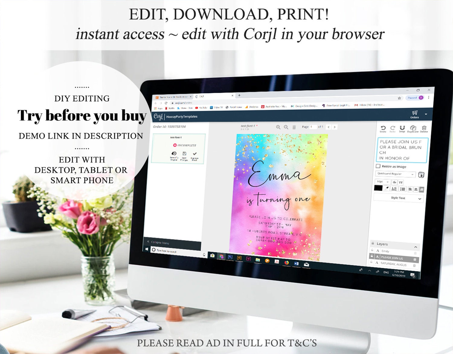Pastel Rainbow Rainbow Birthday Invitation Colorful Tie Dye Invite Ombre Watercolor Invite Splash Glitter Sprinkle Invite 1st 2nd 3rd 509