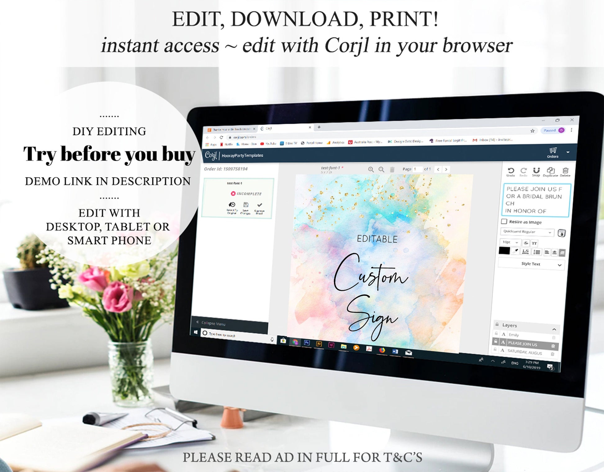 •Try before you buy! • DEMO LINK- https://www.corjl.com/d/1H95F2 Matching items: https://etsy.me/3tTrzAO PLEASE READ AD IN FULL!! •Digital file. No physical item will be shipped •Do it yourself Editing. Edit online with Corjl or Edit with your mobile ITEM DETAILS Sign size: 8’x10’ File type: PDF, JPEG Resolution: 300DPI PDF FILE OPTIONS: •Recommended for printing •Option to include bleed/ trim marks JPG FILE OPTIONS: •Can be used to print as photo •Option to include bleed/ trim marks EDITING • Do it yourself editing • Mobile editing is available • Google chrome is the recommend browser for Corjl. Please download here for FREE: https://www.google.com/chrome/ • Using other browsers may not show all of Corjl's editing features • Editing on a desktop/ laptop computer is recommended to access all of Corjl features • Mobile editing is available, please use a desktop/ laptop computer to access all of Corjl features DOWNLOADS & EXPIRY •Maximum 3 downloads on the same edit •Link expires 30 days after purchase DOWNLOAD NOTICE •Once you have reached your download limits &/ “approve proof” in Corjl. You will not be able to request further downloads on your design. Further download requests are not permitted WHAT IS EDITABLE •Text - colours, fonts, size, move, delete & rotation. •Upload photos to the design •Please see demo link for what you can and can’t do WHAT YOU CAN’T EDIT •Template size •Template orientation •Graphics CAN NOT BE deleted, moved, or changed in colour •Please see demo link for what you can and can’t do HOW TO 1. Choose design template & checkout on Etsy. 2. Email will be sent from Corjl. Follow link to access template 3. Edit, save & print INSTRUCTIONS •Instructions on how to edit your design have been written by Corjl and will be available with your purchase. PRINTING •Colours can vary depending on the monitor, printer & cardstock •Can be printed at home •Home printing will require you to select the high quality print settings, select appropriate paper thickness & click "Actual size" prior to you printing •This design was test printed on 100 gsm paper •Can be printed at local print shop. Please check printing requirements & any printing restrictions prior to purchase PERSONAL USE ONLY. This item cannot be shared, re-sold, or used commercially for profit. REFUND POLICY •We are unable to provide a refund/ exchange on commenced & completed work, instant downloads or self-editing link templates. Please use the demo link to work out if this product is right for you. Copyright © 2018 by InvitePrintablesShop PTY LTD All rights reserved. This file or any portion thereof may not be reproduced or resold without the express written permission of the publisher (including edits to the design). Our files are provided as high-resolution PDFs – the end result is dependent upon the printer and paper used. If using a professional printing company, InvitePrintablesShop are not responsible for their specific printing requirements, paper or colour quality. Any changes required to the template are not included with your purchase – the files come as described in the listing only and cannot be changed. Thank you for visiting Invite Printables Shop:)
