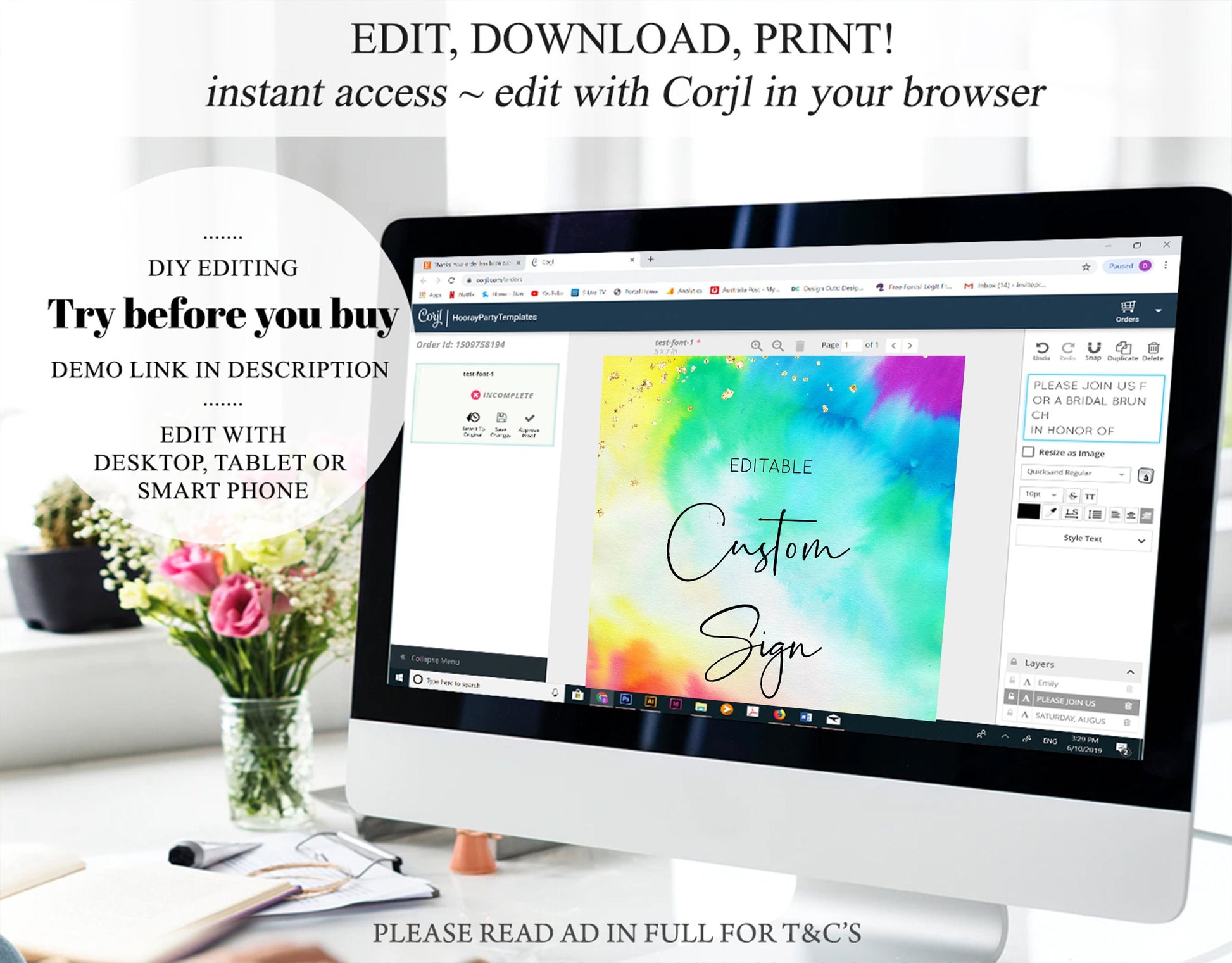 •Try before you buy! • DEMO LINK- https://www.corjl.com/d/1BDCOA Matching items: https://etsy.me/33kTjTm PLEASE READ AD IN FULL!! •Digital file. No physical item will be shipped •Do it yourself Editing. Edit online with Corjl or Edit with your mobile ITEM DETAILS Sign size: 8’x10’ File type: PDF, JPEG Resolution: 300DPI PDF FILE OPTIONS: •Recommended for printing •Option to include bleed/ trim marks JPG FILE OPTIONS: •Can be used to print as photo •Option to include bleed/ trim marks EDITING • Do it yourself editing • Mobile editing is available • Google chrome is the recommend browser for Corjl. Please download here for FREE: https://www.google.com/chrome/ • Using other browsers may not show all of Corjl's editing features • Editing on a desktop/ laptop computer is recommended to access all of Corjl features • Mobile editing is available, please use a desktop/ laptop computer to access all of Corjl features DOWNLOADS & EXPIRY •Maximum 3 downloads on the same edit •Link expires 30 days after purchase DOWNLOAD NOTICE •Once you have reached your download limits &/ “approve proof” in Corjl. You will not be able to request further downloads on your design. Further download requests are not permitted WHAT IS EDITABLE •Text - colours, fonts, size, move, delete & rotation. •Upload photos to the design •Please see demo link for what you can and can’t do WHAT YOU CAN’T EDIT •Template size •Template orientation •Graphics CAN NOT BE deleted, moved, or changed in colour •Please see demo link for what you can and can’t do HOW TO 1. Choose design template & checkout on Etsy. 2. Email will be sent from Corjl. Follow link to access template 3. Edit, save & print INSTRUCTIONS •Instructions on how to edit your design have been written by Corjl and will be available with your purchase. PRINTING •Colours can vary depending on the monitor, printer & cardstock •Can be printed at home •Home printing will require you to select the high quality print settings, select appropriate paper thickness & click "Actual size" prior to you printing •This design was test printed on 100 gsm paper •Can be printed at local print shop. Please check printing requirements & any printing restrictions prior to purchase PERSONAL USE ONLY. This item cannot be shared, re-sold, or used commercially for profit. REFUND POLICY •We are unable to provide a refund/ exchange on commenced & completed work, instant downloads or self-editing link templates. Please use the demo link to work out if this product is right for you. Copyright © 2018 by InvitePrintablesShop PTY LTD All rights reserved. This file or any portion thereof may not be reproduced or resold without the express written permission of the publisher (including edits to the design). Our files are provided as high-resolution PDFs – the end result is dependent upon the printer and paper used. If using a professional printing company, InvitePrintablesShop are not responsible for their specific printing requirements, paper or colour quality. Any changes required to the template are not included with your purchase – the files come as described in the listing only and cannot be changed. Thank you for visiting Invite Printables Shop:)