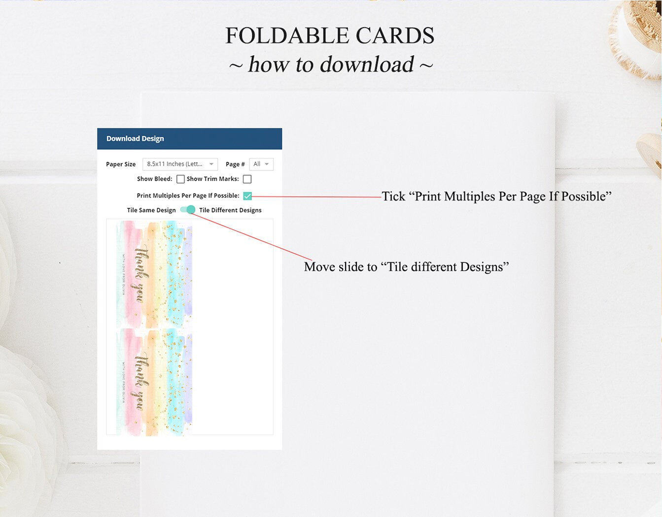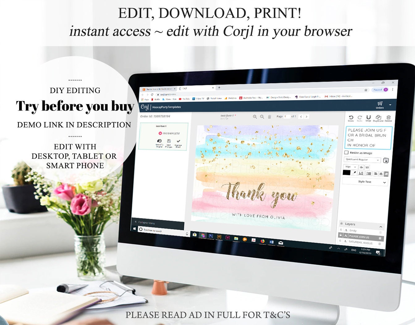 •Try before you buy! • DEMO LINK- https://www.corjl.com/d/53N1P4 Matching items: https://etsy.me/3Gbtt2J PLEASE READ AD IN FULL!! •Digital file. No physical item will be shipped •Do it yourself Editing. Edit online with Corjl or Edit with your mobile ITEM DETAILS Thank you cards Card size: 5’x3.5’ File type: PDF, JPEG Resolution: 300DPI PDF FILE OPTIONS: •Recommended for printing •Ability to print multiple per page (if size permits) •Option to include bleed/ trim marks JPG FILE OPTIONS: •Recommended for MMS/ SMS/ Electronic send out •Can be used to print as photo •Option to include bleed/ trim marks EDITING • Do it yourself editing • Mobile editing is available • Google chrome is the recommend browser for Corjl. Please download here for FREE: https://www.google.com/chrome/ • Using other browsers may not show all of Corjl's editing features • Editing on a desktop/ laptop computer is recommended to access all of Corjl features • Mobile editing is available, please use a desktop/ laptop computer to access all of Corjl features DOWNLOADS & EXPIRY •Maximum 3 downloads on the same edit •Link expires 30 days after purchase DOWNLOAD NOTICE •Once you have reached your download limits &/ “approve proof” in Corjl. You will not be able to request further downloads on your design. Further download requests are not permitted WHAT IS EDITABLE •Text - colours, fonts, size, move, delete & rotation. •Please see demo link for what you can and can’t do WHAT YOU CAN’T EDIT •Template size •Template orientation •Graphics CAN NOT BE deleted, moved, or changed in colour •Please see demo link for what you can and can’t do HOW TO 1. Choose design template & checkout on Etsy. 2. Email will be sent from Corjl. Follow link to access template 3. Edit, save & print INSTRUCTIONS •Instructions on how to edit your design have been written by Corjl and will be available with your purchase. PRINTING •Colours can vary depending on the monitor, printer & cardstock •Can be printed at home •Home printing will require you to select the high quality print settings, select appropriate paper thickness & click "Actual size" prior to you printing •This design was test printed on 100 gsm paper •Can be printed at local print shop. Please check printing requirements & any printing restrictions prior to purchase PERSONAL USE ONLY. This item cannot be shared, re-sold, or used commercially for profit. REFUND POLICY •We are unable to provide a refund/ exchange on commenced & completed work, instant downloads or self-editing link templates. Please use the demo link to work out if this product is right for you. Copyright © 2018 by InvitePrintablesShop PTY LTD All rights reserved. This file or any portion thereof may not be reproduced or resold without the express written permission of the publisher (including edits to the design). Our files are provided as high-resolution PDFs – the end result is dependent upon the printer and paper used. If using a professional printing company, InvitePrintablesShop are not responsible for their specific printing requirements, paper or colour quality. Any changes required to the template are not included with your purchase – the files come as described in the listing only and cannot be changed. Thank you for visiting Invite Printables Shop:) #abcdef12345